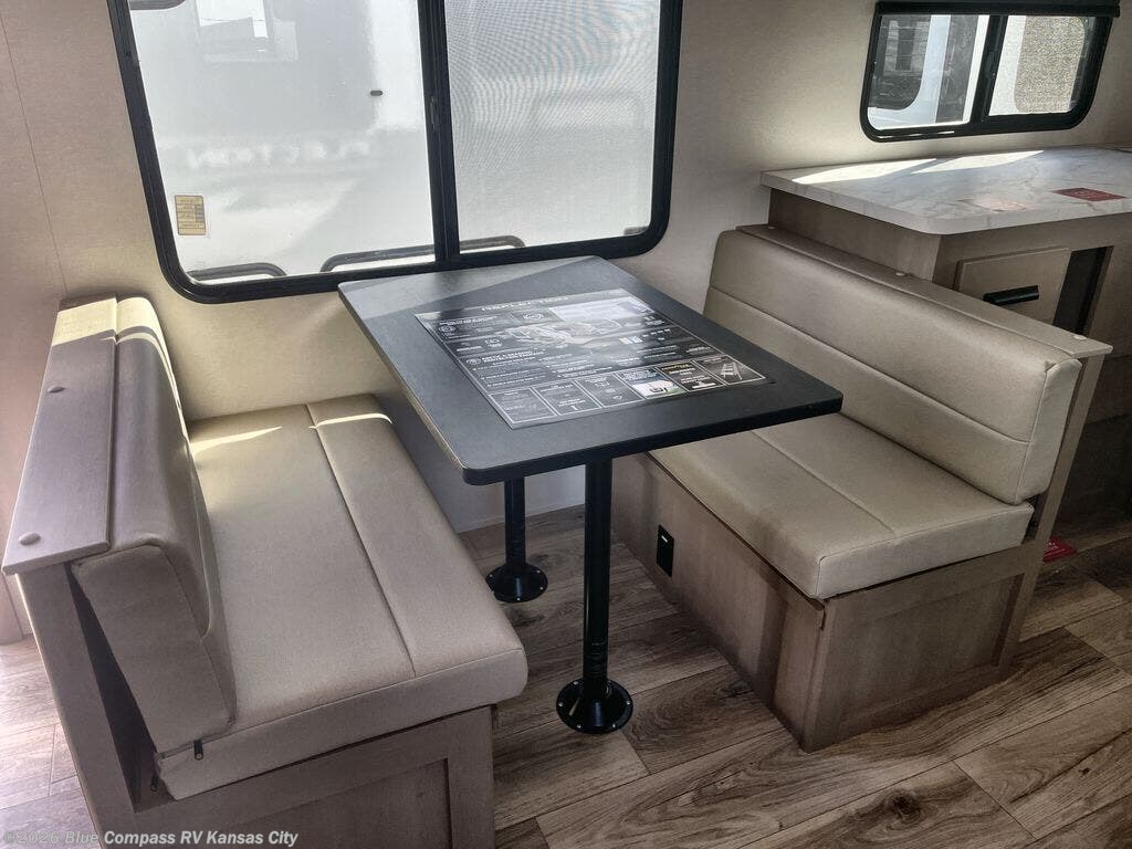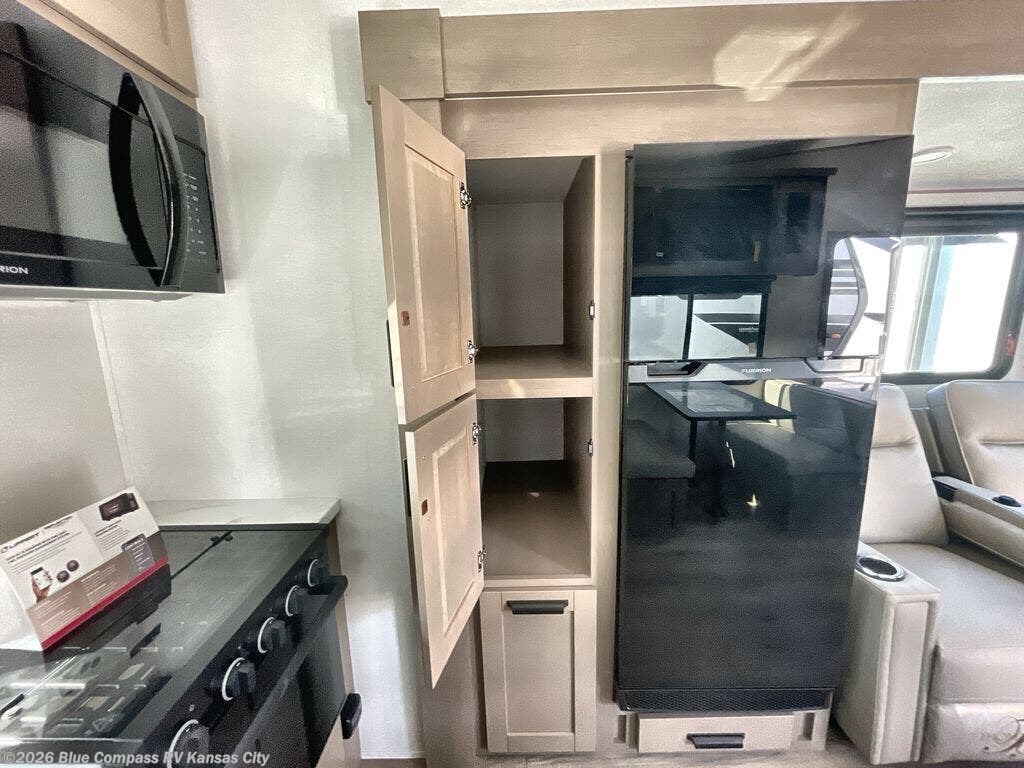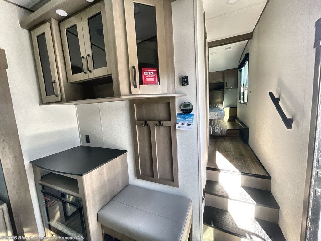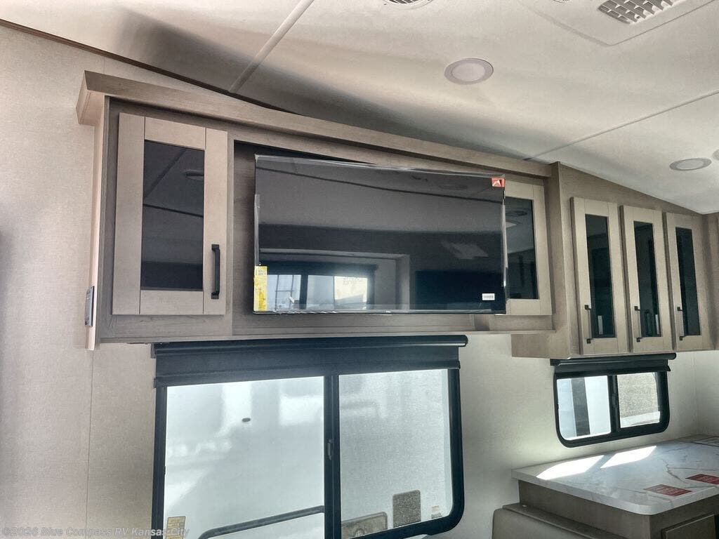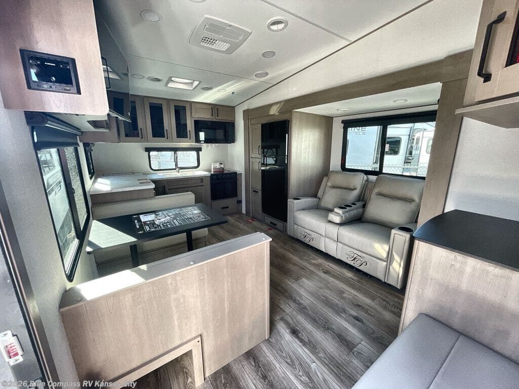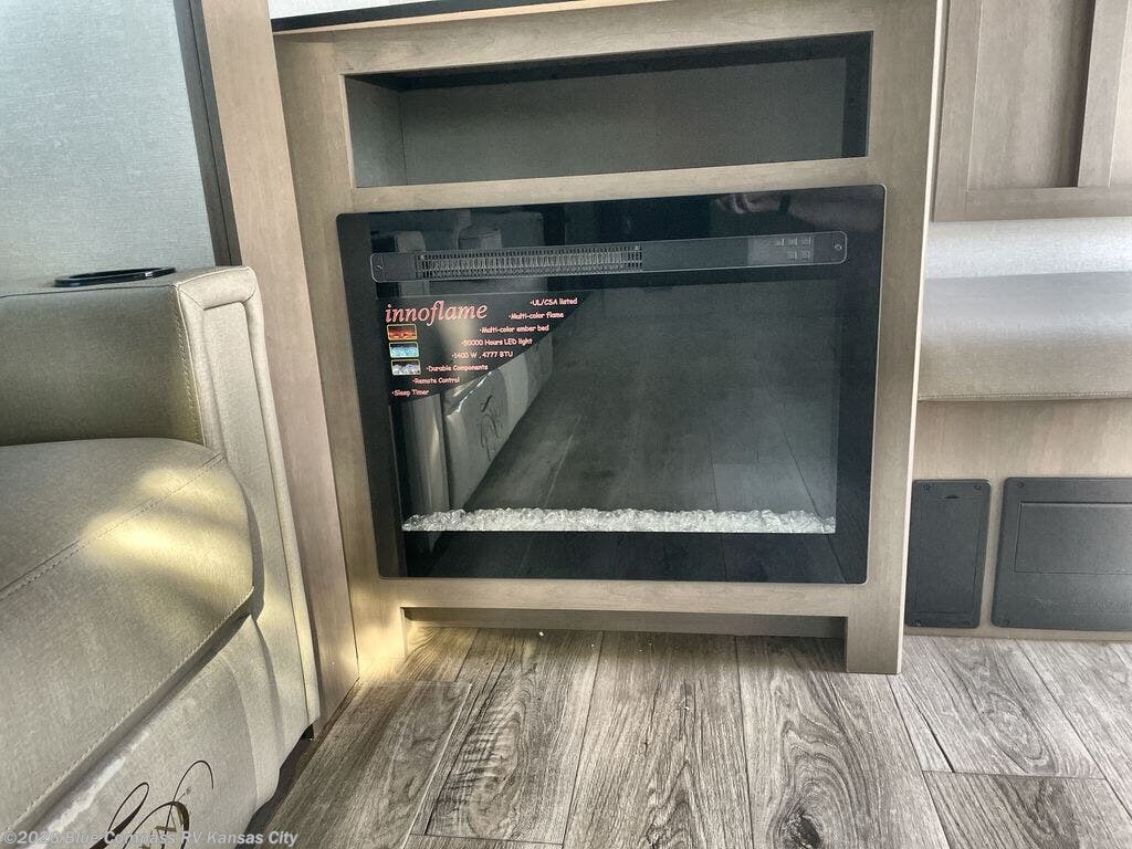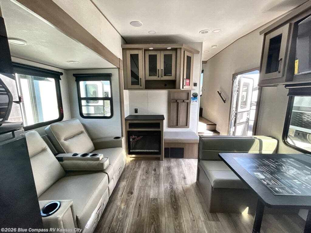At the front of this fifth wheel, a private bedroom offers a walk-around 60" x 80" queen bed for restful comfort, complemented by dual wardrobes for convenient clothing storage. Down the hall, the full bathroom includes a 30" x 36" residential walk-in shower, a large, mirrored medicine cabinet, and linen storage for towels and toiletries. The middle living area features a cozy fireplace and booth dinette with a TV above perfect for dining while enjoying your favorite shows. Opposite, a slide-out holds the 62" theater seating for relaxing after a day of adventure, alongside a 10-cu. ft. refrigerator and pantry for all your groceries and dry goods. At the rear, an L-shaped kitchen provides generous counter space, a deep-seated stainless-steel sink, and a 30" microwave, allowing you to prepare meals comfortably without relying on campground facilities.