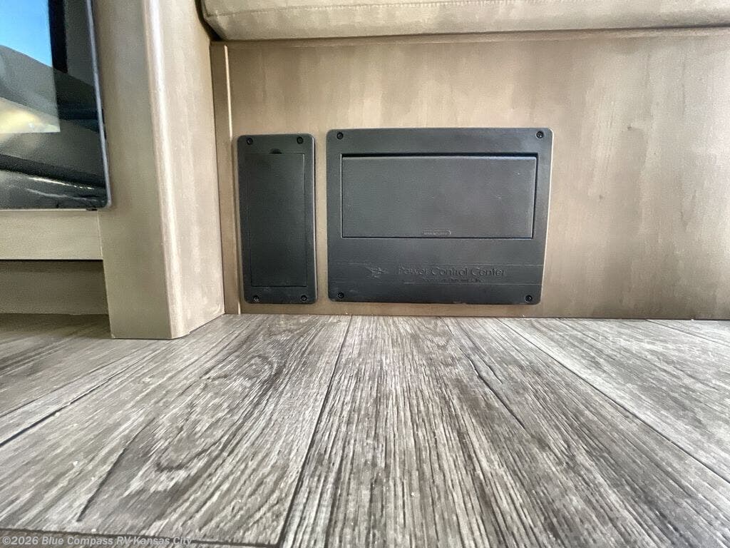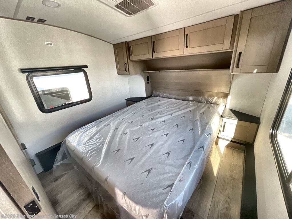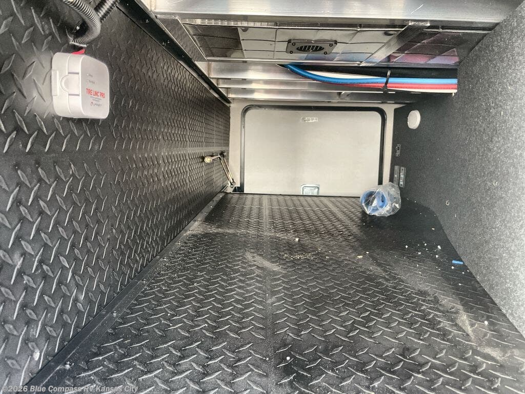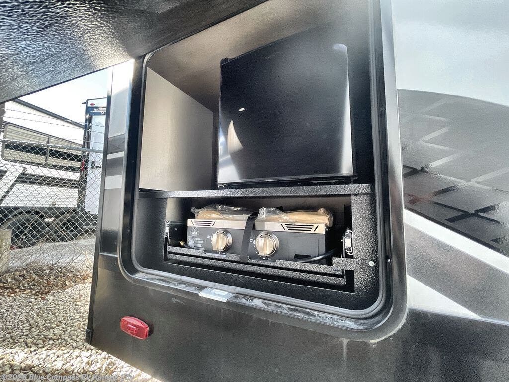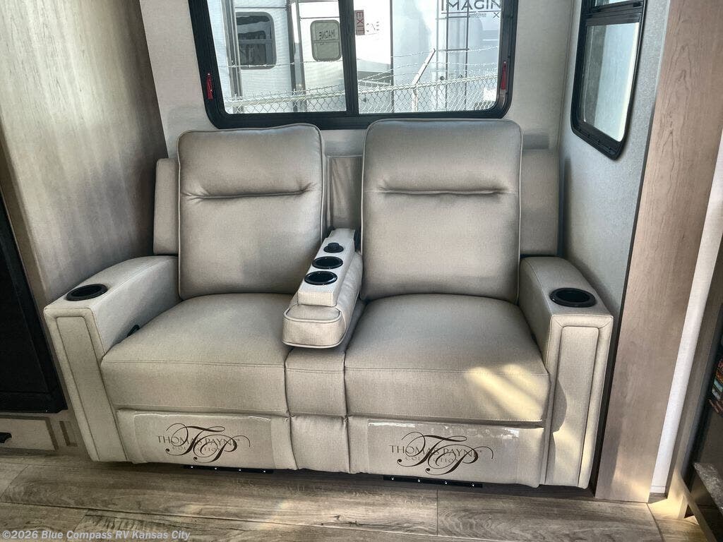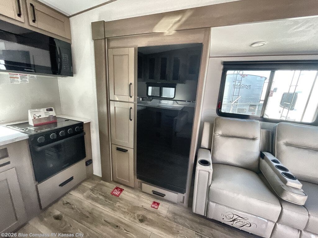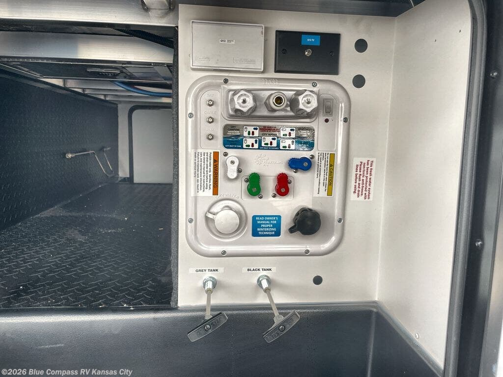 At the front of this fifth wheel, a private bedroom offers a walk-around 60" x 80" queen bed for restful comfort, complemented by dual wardrobes for convenient clothing storage. Down the hall, the full bathroom includes a 30" x 36" residential walk-in shower, a large, mirrored medicine cabinet, and linen storage for towels and toiletries. The middle living area features a cozy fireplace and booth dinette with a TV above perfect for dining while enjoying your favorite shows. Opposite, a slide-out holds the 62" theater seating for relaxing after a day of adventure, alongside a 10-cu. ft. refrigerator and pantry for all your groceries and dry goods. At the rear, an L-shaped kitchen provides generous counter space, a deep-seated stainless-steel sink, and a 30" microwave, allowing you to prepare meals comfortably without relying on campground facilities.