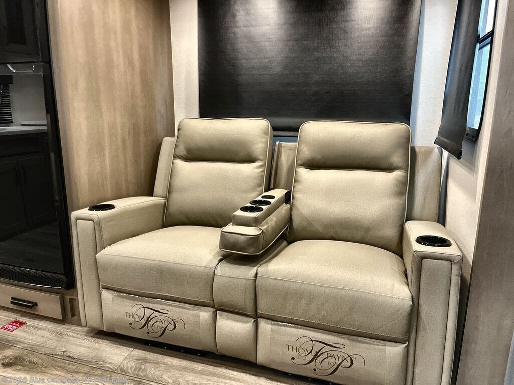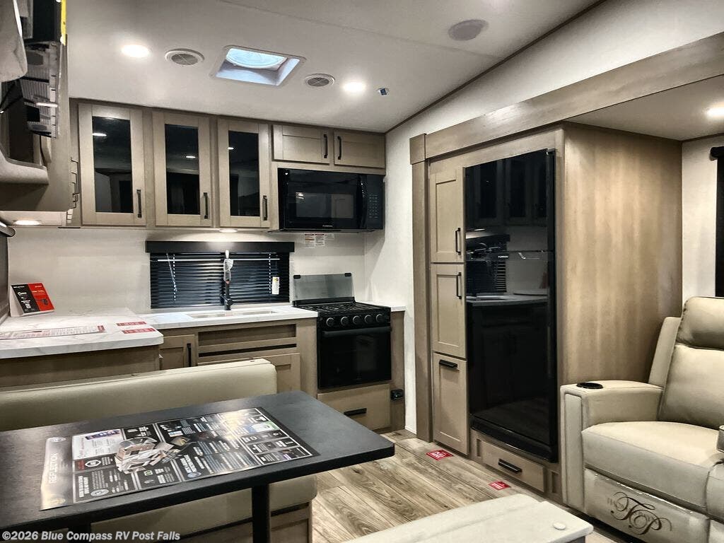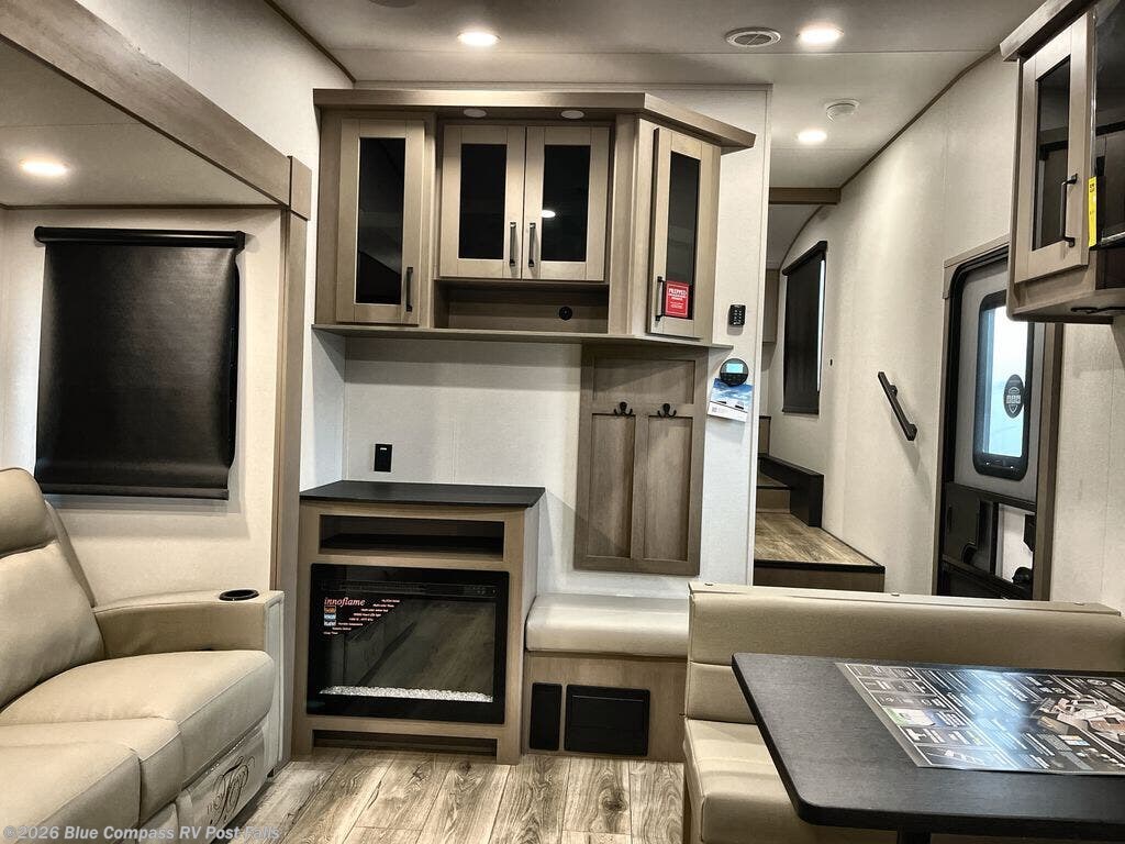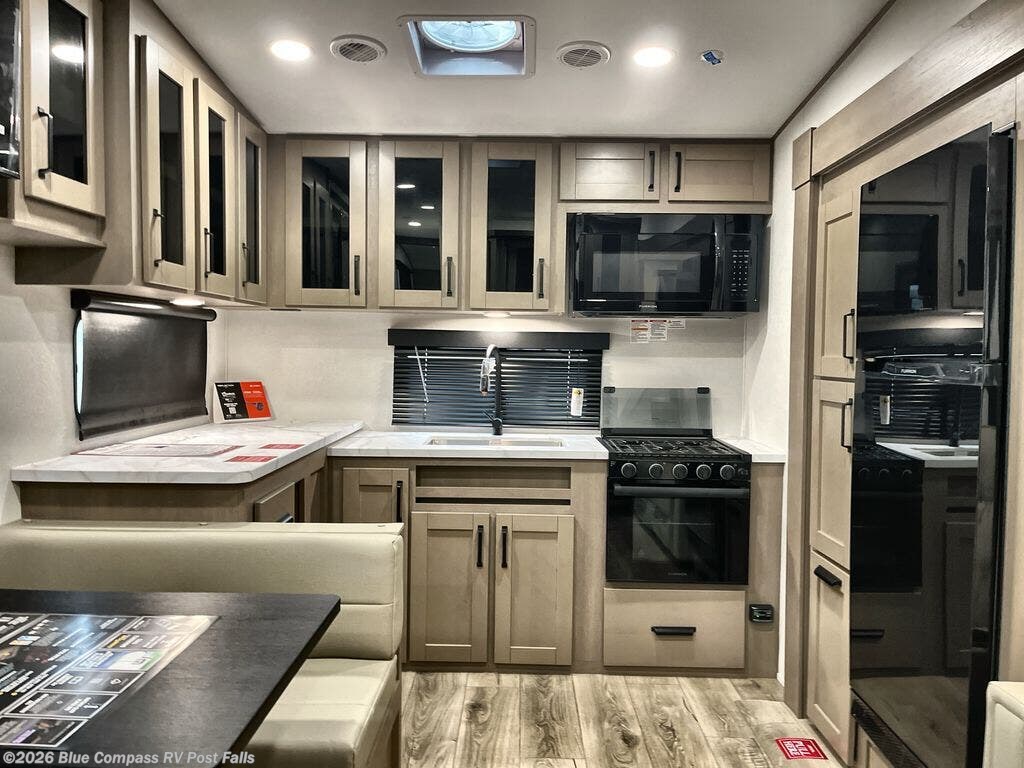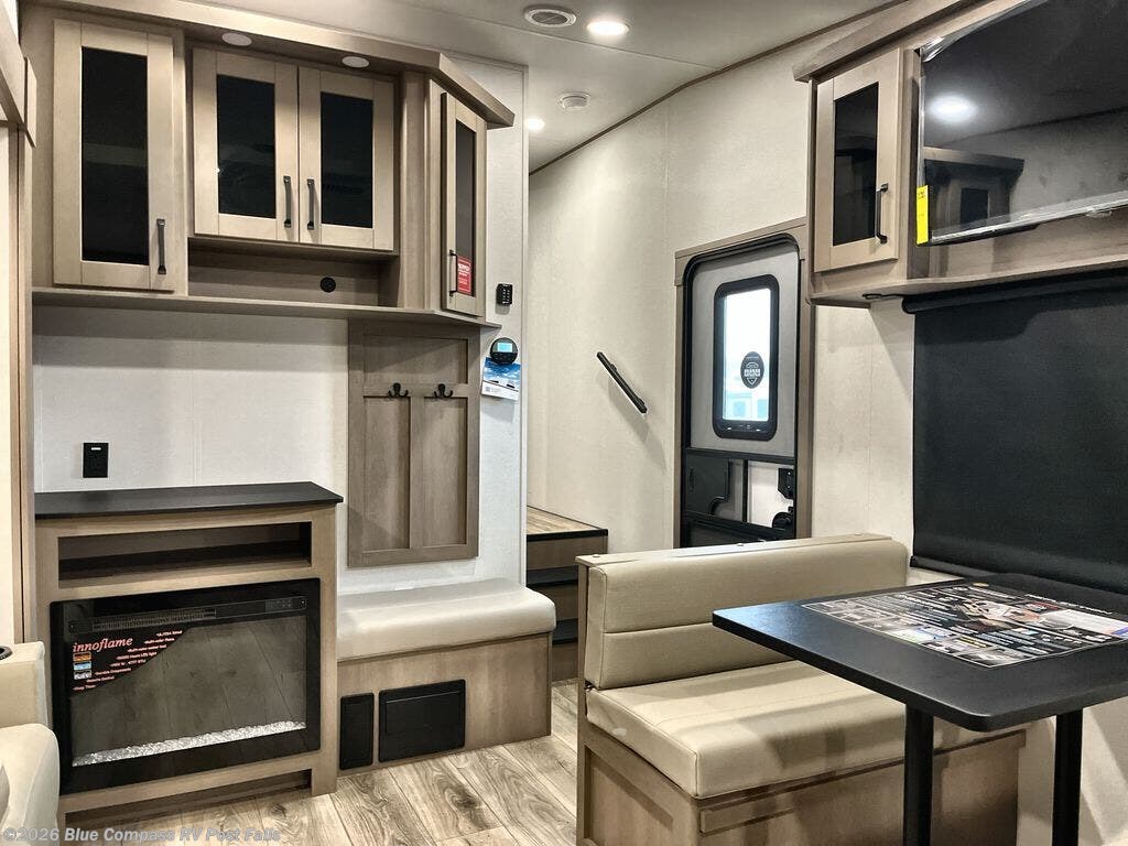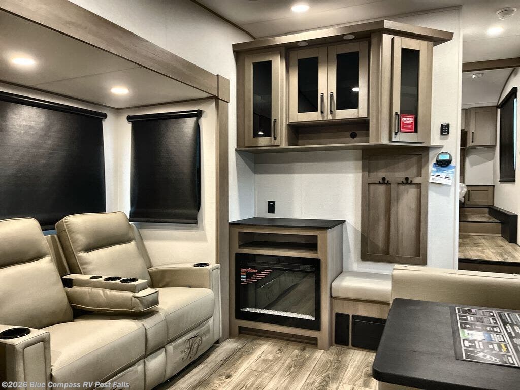 At the front of this fifth wheel, a private bedroom offers a walk-around 60" x 80" queen bed for restful comfort, complemented by dual wardrobes for convenient clothing storage. Down the hall, the full bathroom includes a 30" x 36" residential walk-in shower, a large, mirrored medicine cabinet, and linen storage for towels and toiletries. The middle living area features a cozy fireplace and booth dinette with a TV above perfect for dining while enjoying your favorite shows. Opposite, a slide-out holds the 62" theater seating for relaxing after a day of adventure, alongside a 10-cu. ft. refrigerator and pantry for all your groceries and dry goods. At the rear, an L-shaped kitchen provides generous counter space, a deep-seated stainless-steel sink, and a 30" microwave, allowing you to prepare meals comfortably without relying on campground facilities.