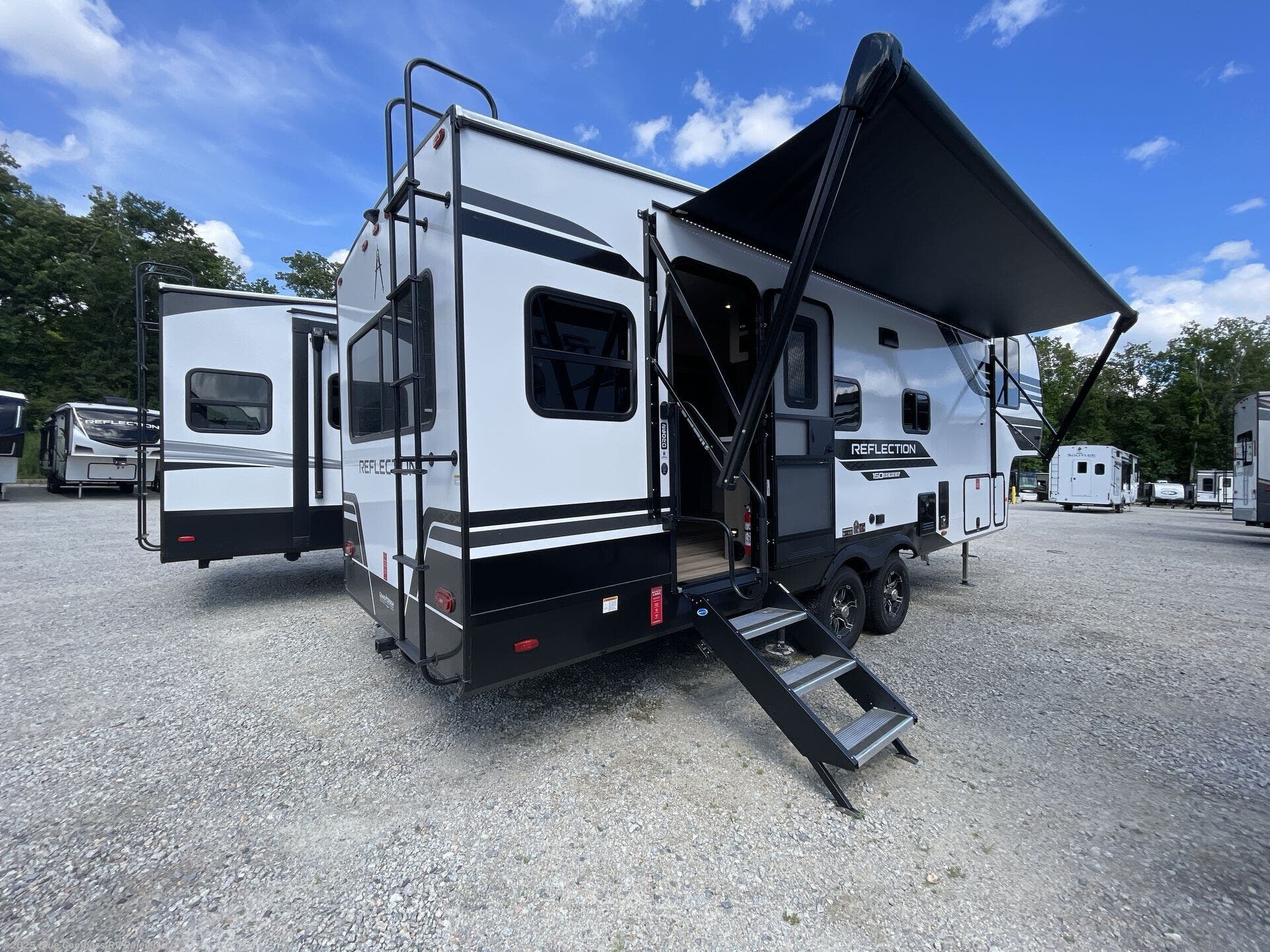 Feel right at home in this Reflection 150 Series with a private bedroom that includes a walk-around queen bed with storage on each side, windows, and a space savings sliding door. The full bathroom offers a walk-in shower, storage for your linens and a sliding door for easy access. When you get hungry, the cook will have an L-shaped kitchen area to make meals, plus full amenities including a 30" microwave, a flip-up counter extension, a pantry for your dry goods and a 16 cu. ft. refrigerator to store lots of food and cold beverages. You can dine at the rear U-shaped dinette lounge and enjoy the view out of all the windows or outside under the 18' electric awning. And the 78" theatre seating will be a nice place to relax and watch the 40" LED HDTV.