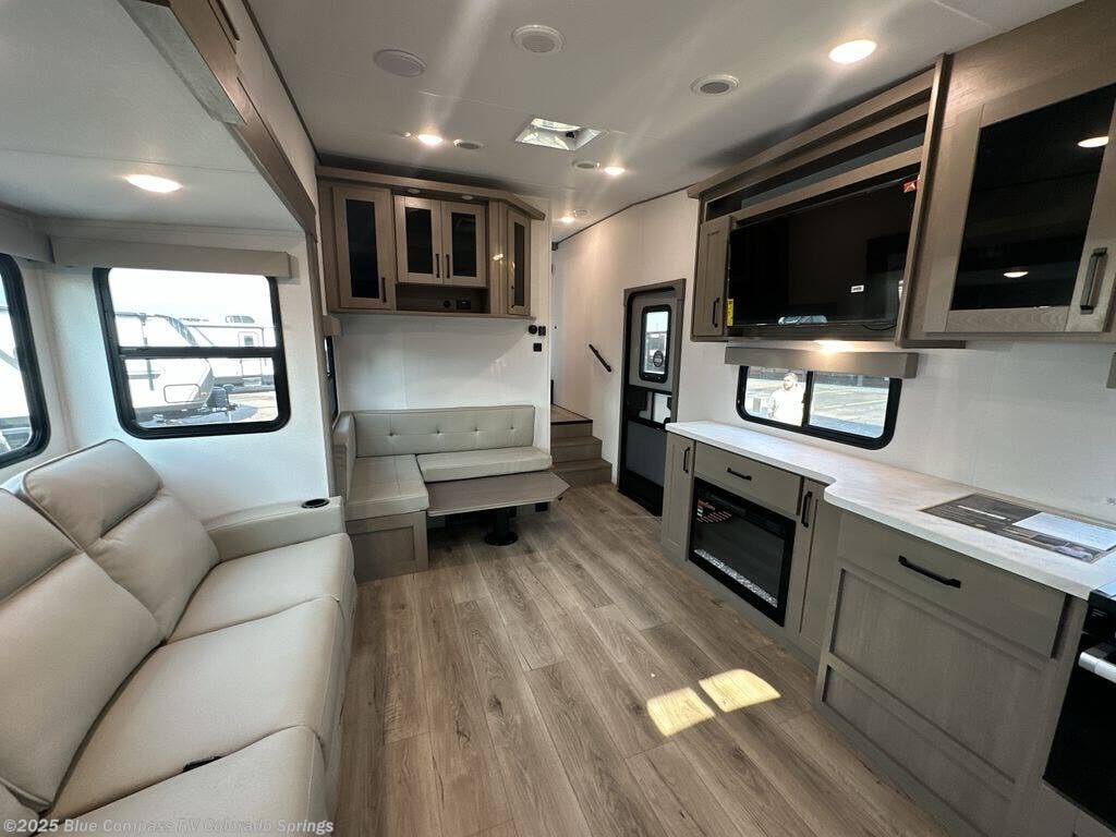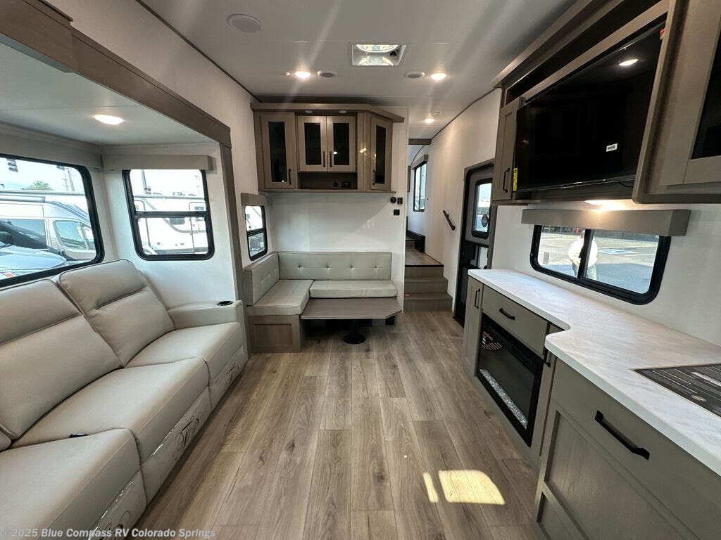 You will love this fifth wheel featuring a single slide for added interior living space and all the comforts and conveniences it provides you while you travel. The slide features a 78" theater seat plus there is a breakfast nook for more seating. Both can easily view the entertainment center with 40" TV. A rear kitchen indoors provides everything you need to create meals like home while on the road, and if you want to spend as much time outside as possible, then the outdoor griddle will certainly accommodate you for meals. Up front, a cozy private bedroom with queen bed, wardrobe, and overhead cabinets. Right next door, you will find a large walk-in shower, as well as a toilet, and a vanity with sink and linen cabinet for your towels and toiletries. You will also love the full unobstructed pass-through compartment for all of your gear, plus so much more!