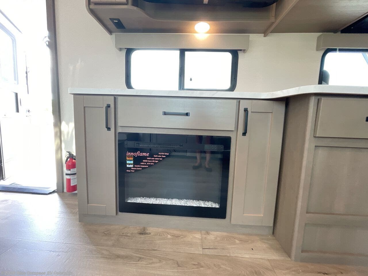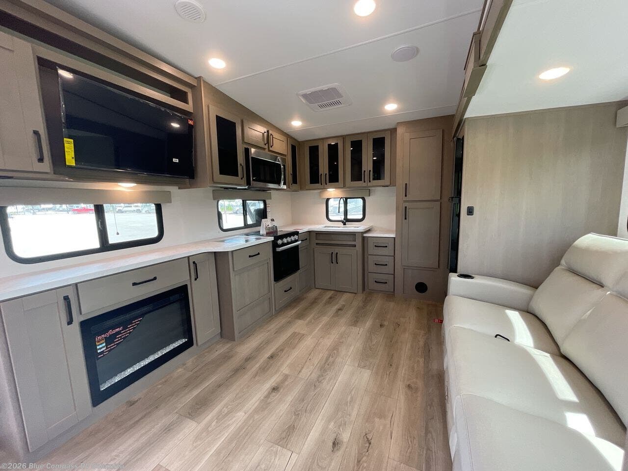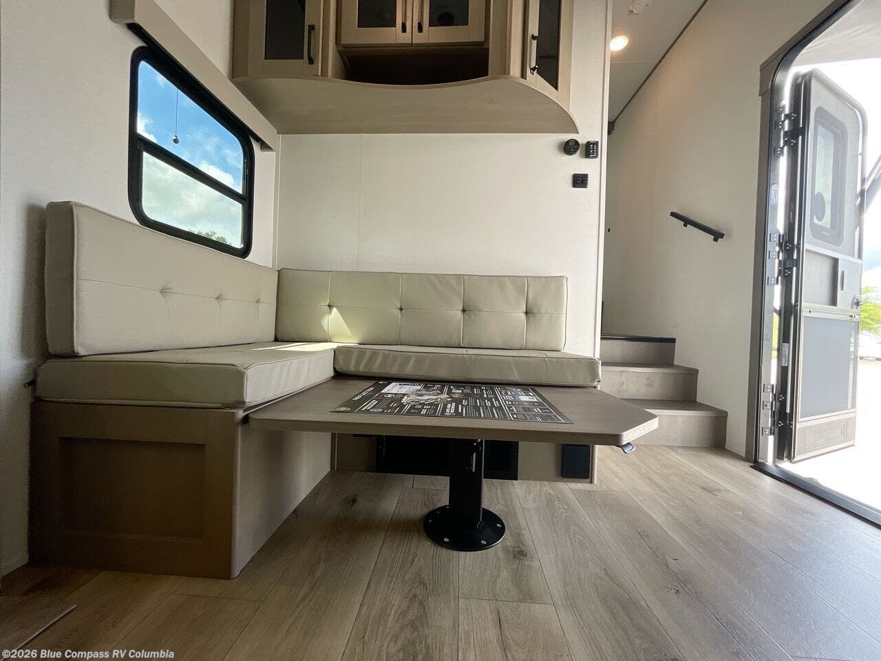 You will love this fifth wheel featuring a single slide for added interior living space and all the comforts and conveniences it provides you while you travel. The slide features a 78" theater seat plus there is a breakfast nook for more seating. Both can easily view the entertainment center with 40" TV. A rear kitchen indoors provides everything you need to create meals like home while on the road, and if you want to spend as much time outside as possible, then the outdoor griddle will certainly accommodate you for meals. Up front, a cozy private bedroom with queen bed, wardrobe, and overhead cabinets. Right next door, you will find a large walk-in shower, as well as a toilet, and a vanity with sink and linen cabinet for your towels and toiletries. You will also love the full unobstructed pass-through compartment for all of your gear, plus so much more!