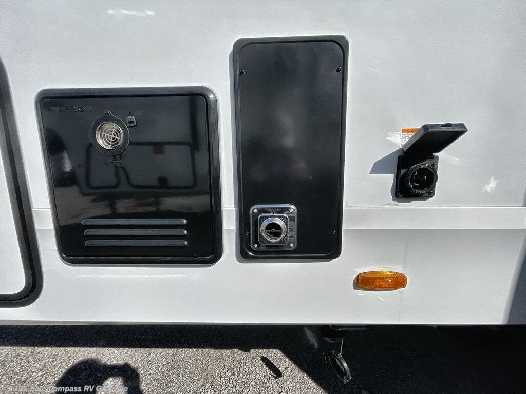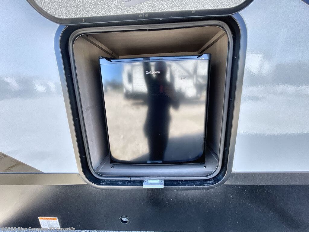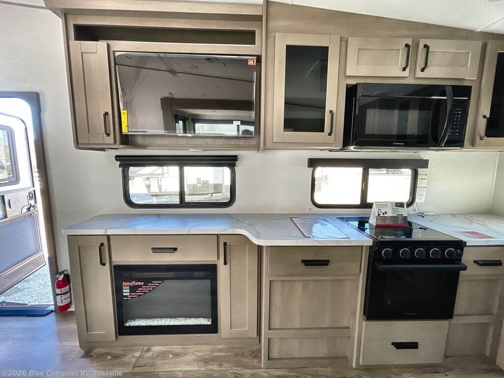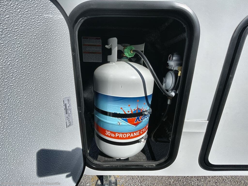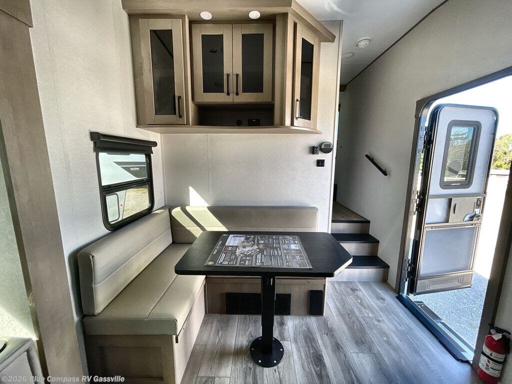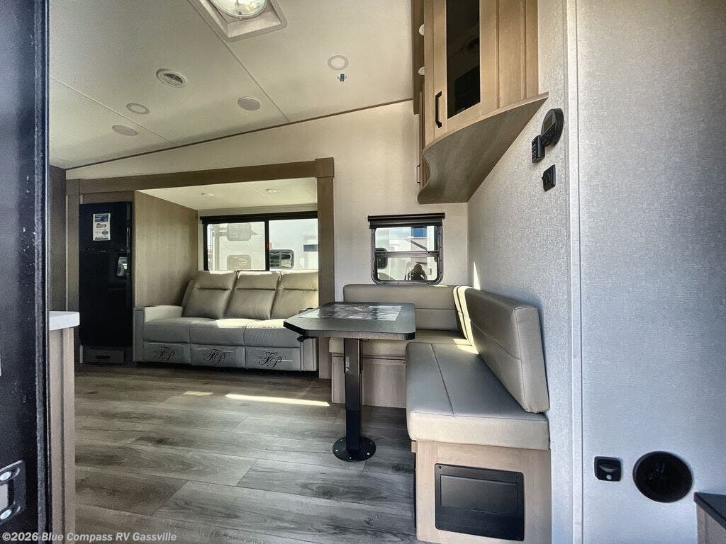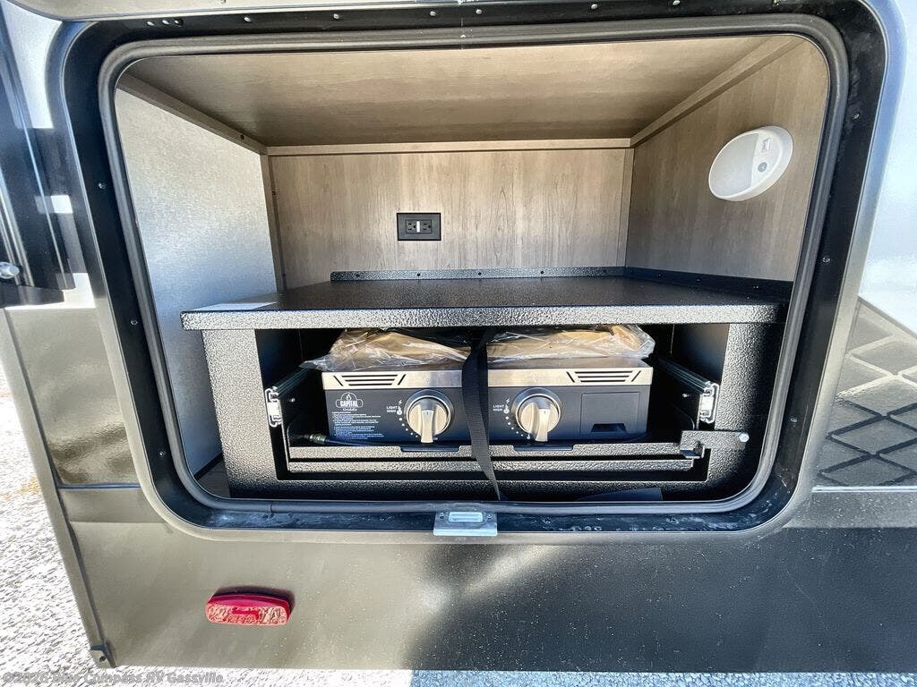 You will love this fifth wheel featuring a single slide for added interior living space and all the comforts and conveniences it provides you while you travel. The slide features a 78" theater seat plus there is a breakfast nook for more seating. Both can easily view the entertainment center with 40" TV. A rear kitchen indoors provides everything you need to create meals like home while on the road, and if you want to spend as much time outside as possible, then the outdoor griddle will certainly accommodate you for meals. Up front, a cozy private bedroom with queen bed, wardrobe, and overhead cabinets. Right next door, you will find a large walk-in shower, as well as a toilet, and a vanity with sink and linen cabinet for your towels and toiletries. You will also love the full unobstructed pass-through compartment for all of your gear, plus so much more!