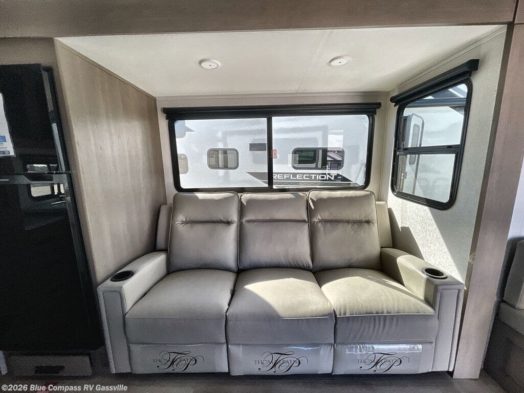 With any Reflection 150 Series fifth wheel by Grand Design, there is more available payload capacity and a broader range of half-ton trucks capable of towing this fifth wheel, and no slider hitch is needed thanks to the 90-degree turning radius which makes them short bed friendly and easier to tow. The mandatory Ultimate Power package provides a "One-Touch" automatic leveling system and a detachable power cord with LED light for easy setup, plus motion sensor pass-through lighting and entry lighting, and the Tire Linc TPMS will help you stay safe on the road. The interior offers residential luxury from the cabinetry and premium Congoleum flooring, to the booth dinette and residential-style window treatment. Make your refined decision today!