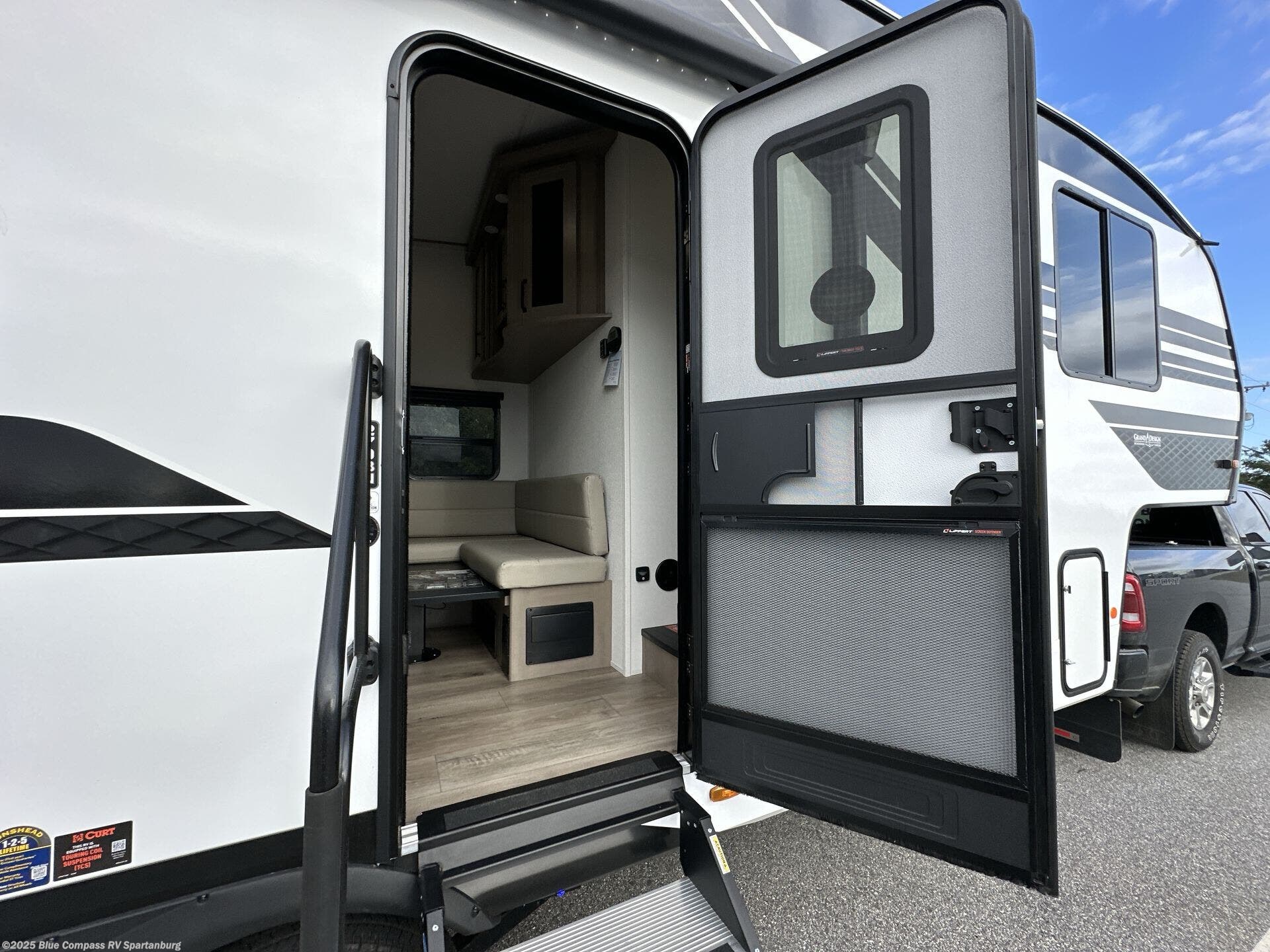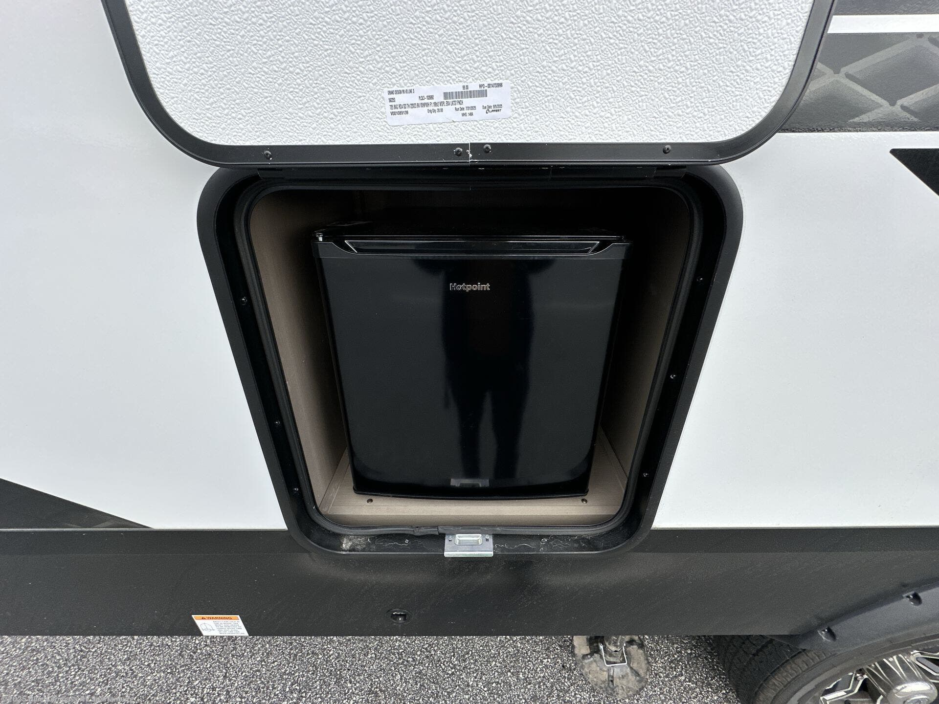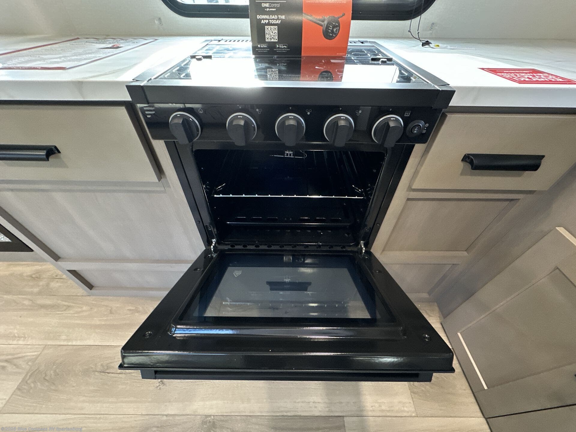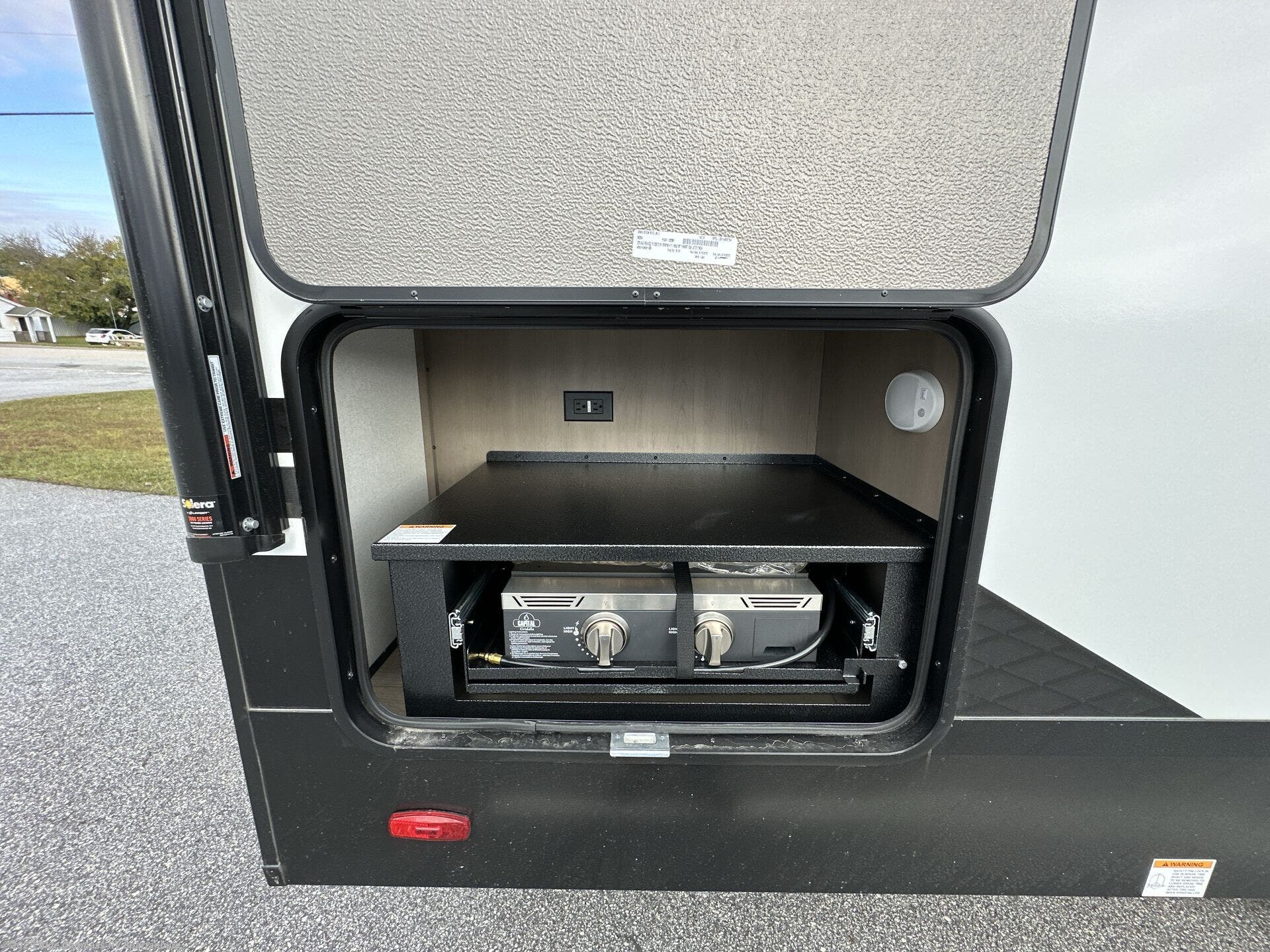 You will love this fifth wheel featuring a single slide for added interior living space and all the comforts and conveniences it provides you while you travel. The slide features a 78" theater seat plus there is a breakfast nook for more seating. Both can easily view the entertainment center with 40" TV. A rear kitchen indoors provides everything you need to create meals like home while on the road, and if you want to spend as much time outside as possible, then the outdoor griddle will certainly accommodate you for meals. Up front, a cozy private bedroom with queen bed, wardrobe, and overhead cabinets. Right next door, you will find a large walk-in shower, as well as a toilet, and a vanity with sink and linen cabinet for your towels and toiletries. You will also love the full unobstructed pass-through compartment for all of your gear, plus so much more!
