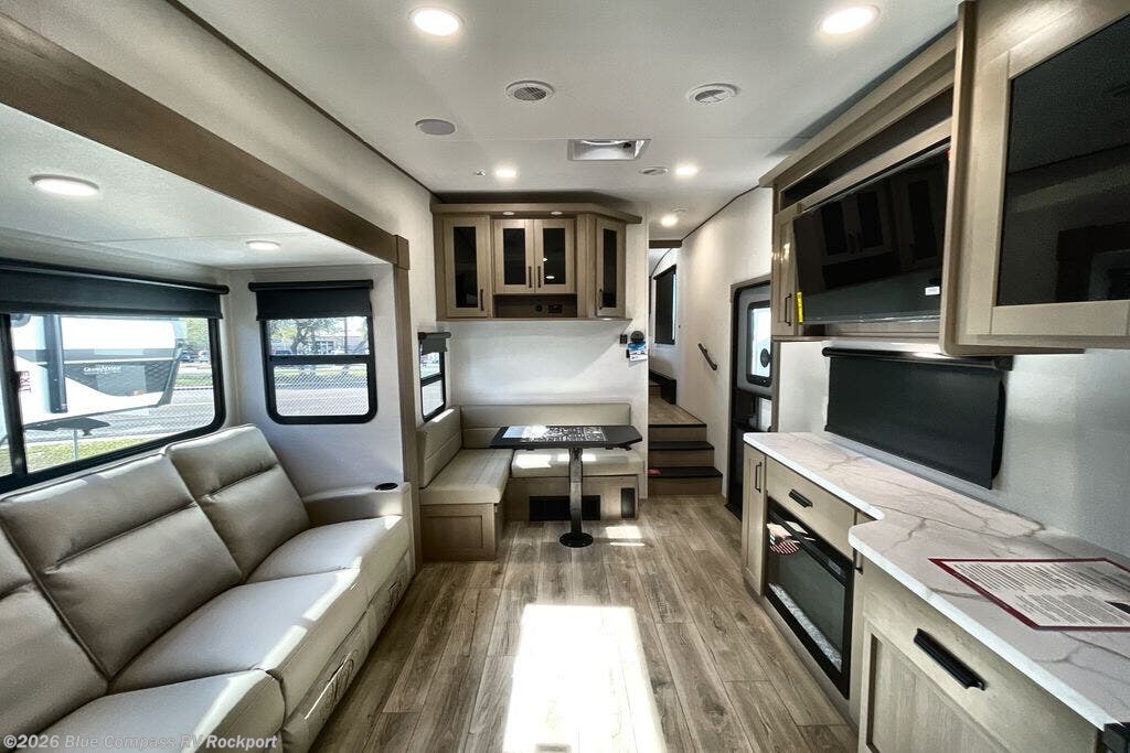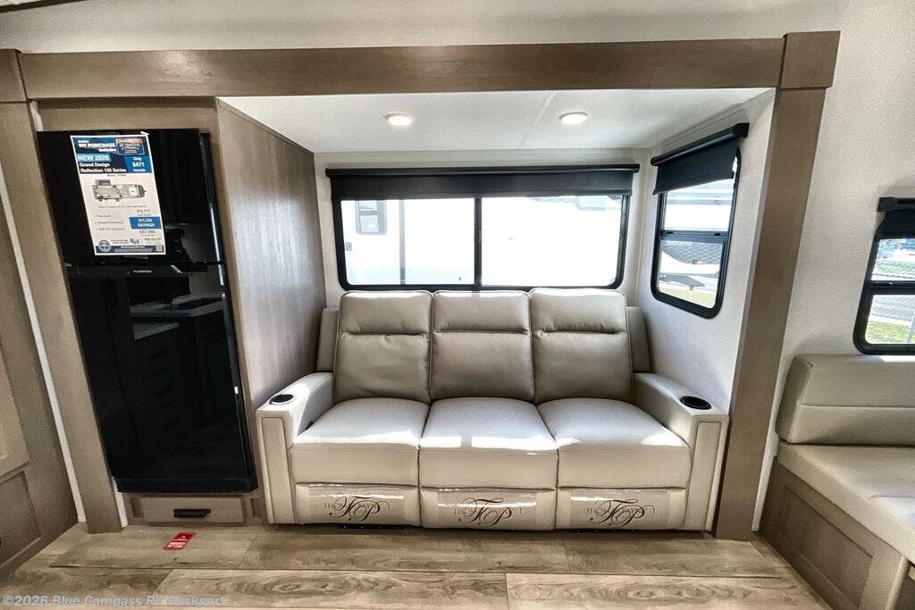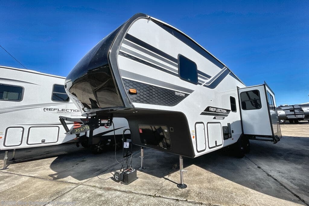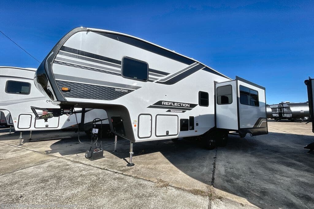 With any Reflection 150 Series fifth wheel by Grand Design, there is more available payload capacity and a broader range of half-ton trucks capable of towing this fifth wheel, and no slider hitch is needed thanks to the 90-degree turning radius which makes them short bed friendly and easier to tow. The mandatory Ultimate Power package provides a "One-Touch" automatic leveling system and a detachable power cord with LED light for easy setup, plus motion sensor pass-through lighting and entry lighting, and the Tire Linc TPMS will help you stay safe on the road. The interior offers residential luxury from the cabinetry and premium Congoleum flooring, to the booth dinette and residential-style window treatment. Make your refined decision today!