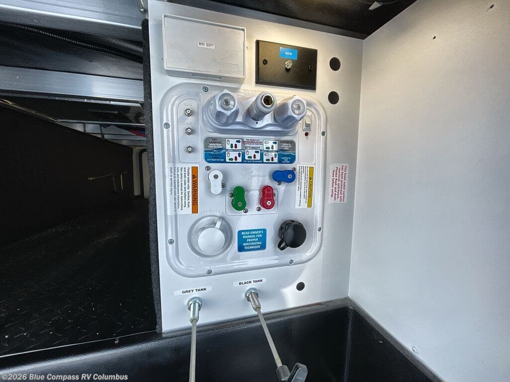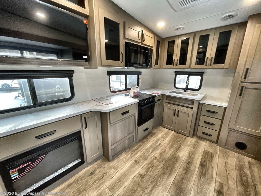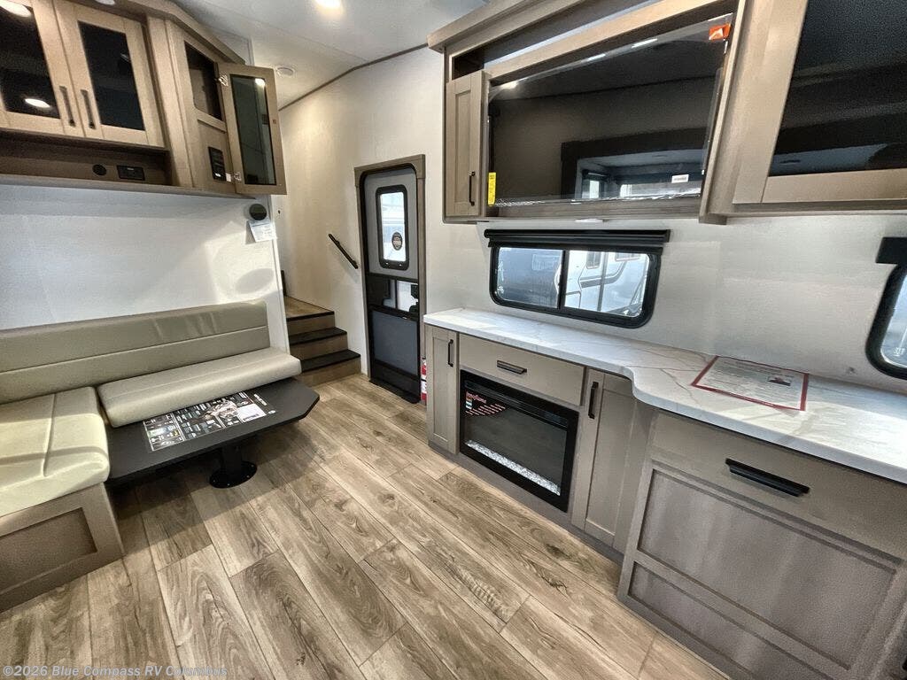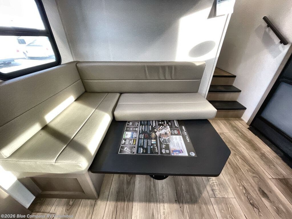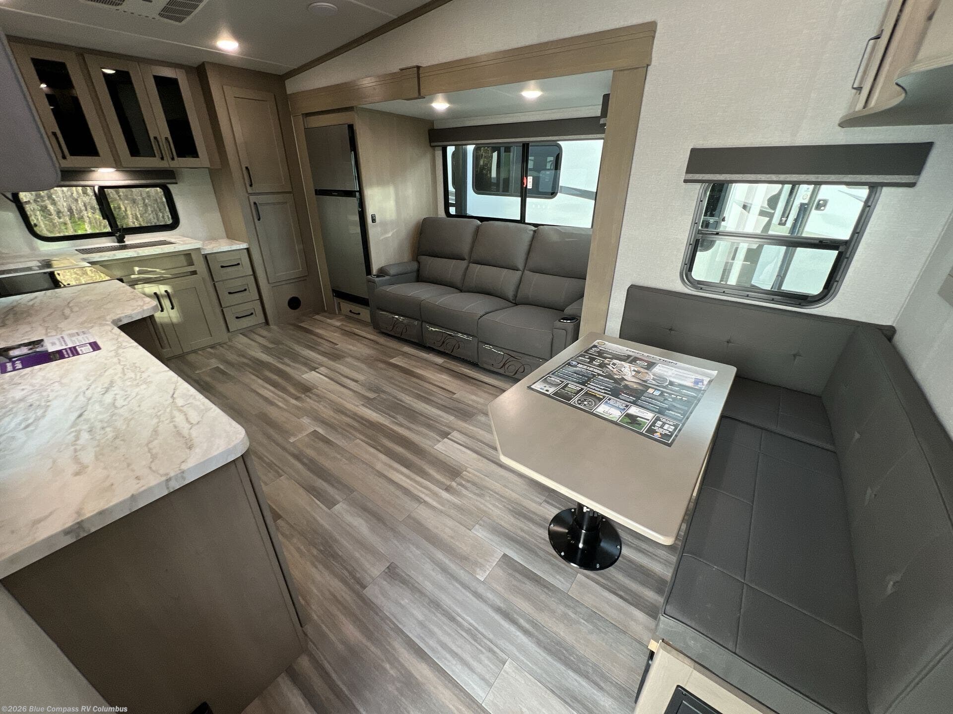 You will love this fifth wheel featuring a single slide for added interior living space and all the comforts and conveniences it provides you while you travel. The slide features a 78" theater seat plus there is a breakfast nook for more seating. Both can easily view the entertainment center with 40" TV. A rear kitchen indoors provides everything you need to create meals like home while on the road, and if you want to spend as much time outside as possible, then the outdoor griddle will certainly accommodate you for meals. Up front, a cozy private bedroom with queen bed, wardrobe, and overhead cabinets. Right next door, you will find a large walk-in shower, as well as a toilet, and a vanity with sink and linen cabinet for your towels and toiletries. You will also love the full unobstructed pass-through compartment for all of your gear, plus so much more!