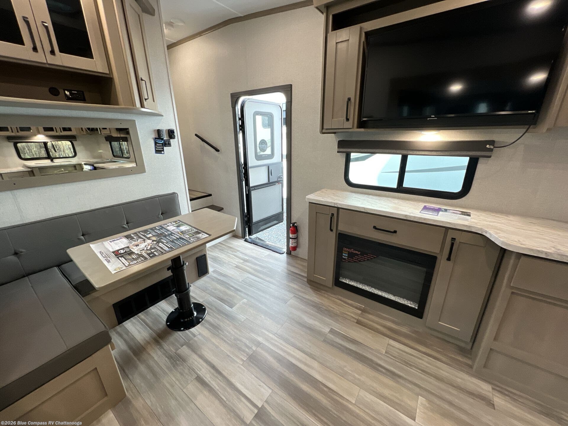 You will love this fifth wheel featuring a single slide for added interior living space and all the comforts and conveniences it provides you while you travel. The slide features a 78" theater seat plus there is a breakfast nook for more seating. Both can easily view the entertainment center with 40" TV. A rear kitchen indoors provides everything you need to create meals like home while on the road, and if you want to spend as much time outside as possible, then the outdoor griddle will certainly accommodate you for meals. Up front, a cozy private bedroom with queen bed, wardrobe, and overhead cabinets. Right next door, you will find a large walk-in shower, as well as a toilet, and a vanity with sink and linen cabinet for your towels and toiletries. You will also love the full unobstructed pass-through compartment for all of your gear, plus so much more!