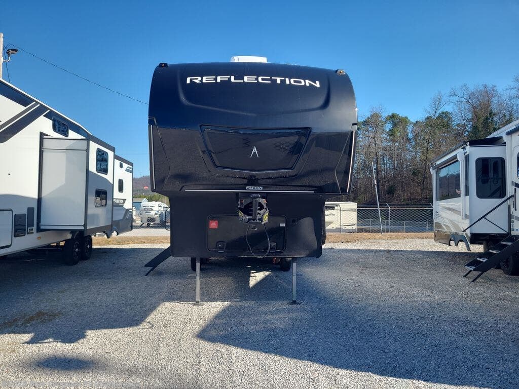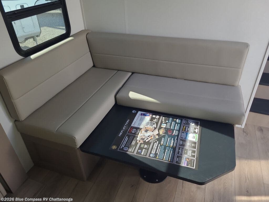 With any Reflection 150 Series fifth wheel by Grand Design, there is more available payload capacity and a broader range of half-ton trucks capable of towing this fifth wheel, and no slider hitch is needed thanks to the 90-degree turning radius which makes them short bed friendly and easier to tow. The mandatory Ultimate Power package provides a "One-Touch" automatic leveling system and a detachable power cord with LED light for easy setup, plus motion sensor pass-through lighting and entry lighting, and the Tire Linc TPMS will help you stay safe on the road. The interior offers residential cabinetry and premium Congoleum flooring, to the booth dinette and residential-style window treatment. Make your refined decision today!
