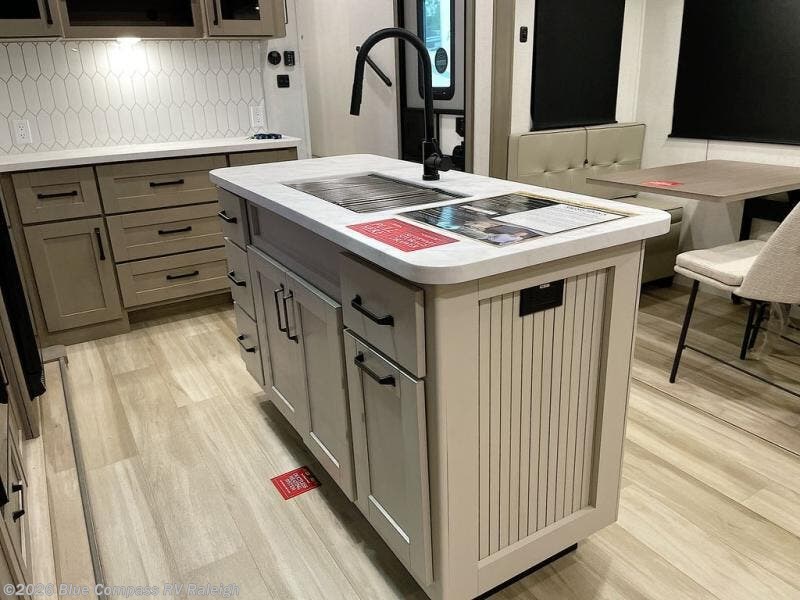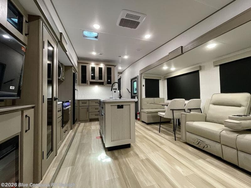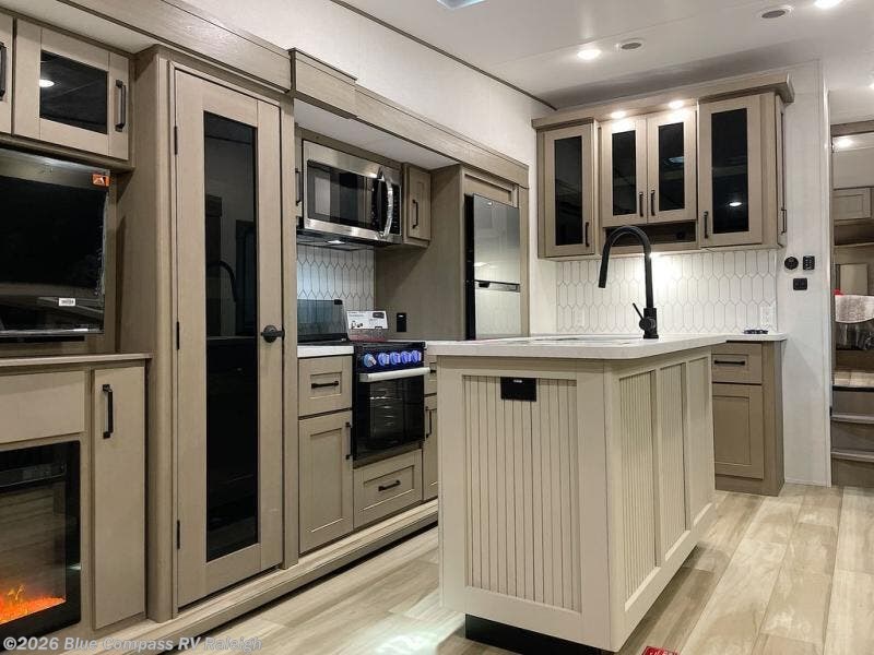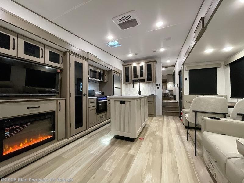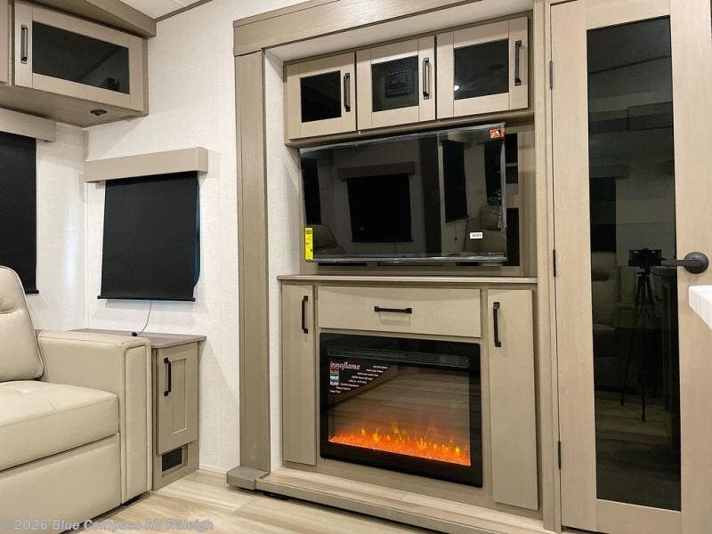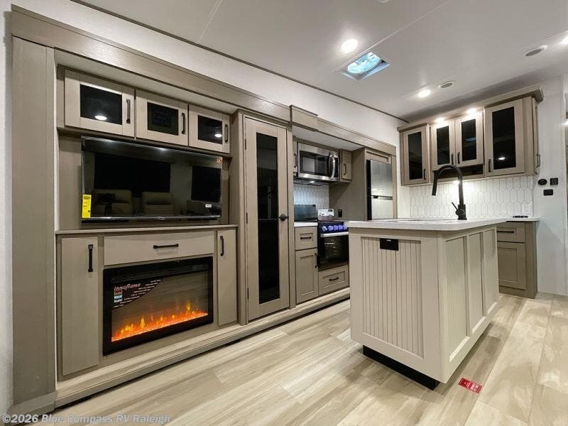 Get ready to enjoy everything the campgrounds and surrounding area has to offer when you are setup to camp in this fifth wheel! The two electric awnings offer protected areas creating outdoor living spaces; just grab your camping chairs from the unobstructed pass-through storage. And the interior offers a spacious living area and kitchen combination with dual opposing slides for maximum space. You can sit on the tri-fold sofa or the booth dinette with an option for a swivel dinette. The hutch and kitchen island offer counter space to prepare and serve meals, and there is a large pantry for goodies. The 40" LED HDTV with a fireplace below provides entertainment before bedtime or on a rainy day. And the front bedroom offers privacy, a walk-around queen bed, and plenty of storage!