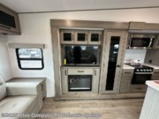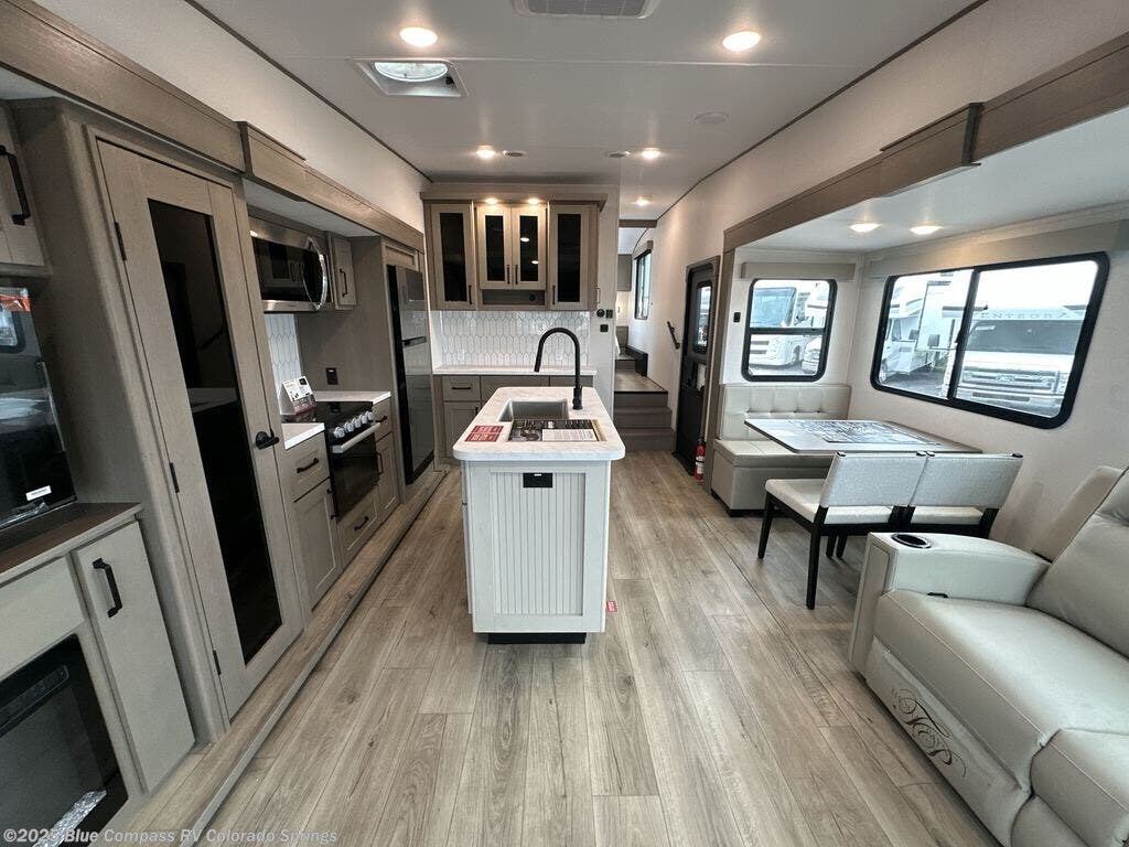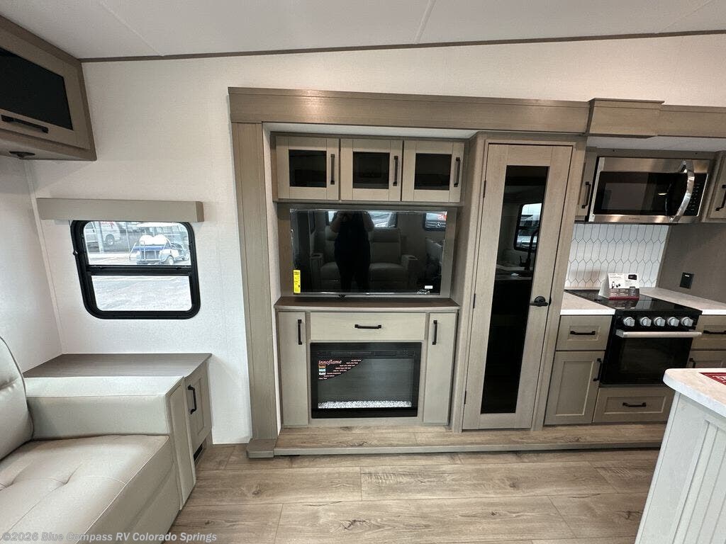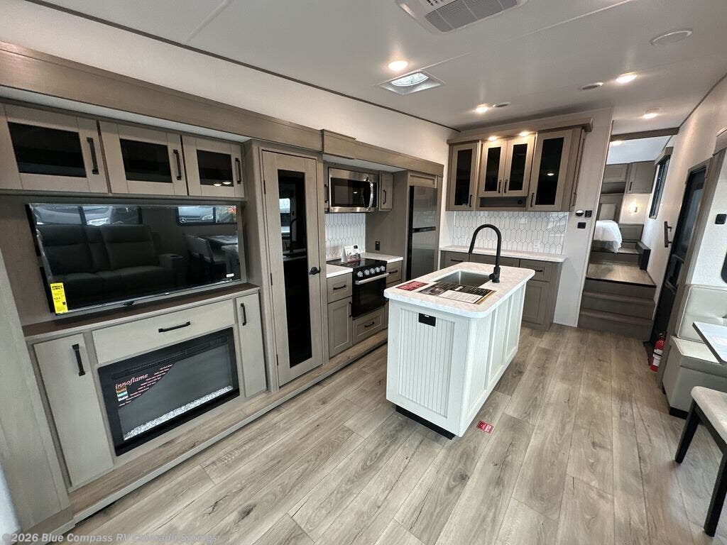 Get ready to enjoy everything the campgrounds and surrounding area has to offer when you are setup to camp in this fifth wheel! The two electric awnings offer protected areas creating outdoor living spaces; just grab your camping chairs from the unobstructed pass-through storage. And the interior offers a spacious living area and kitchen combination with dual opposing slides for maximum space. You can sit on the tri-fold sofa or the booth dinette with an option for a swivel dinette. The hutch and kitchen island offer counter space to prepare and serve meals, and there is a large pantry for goodies. The 40" LED HDTV with a fireplace below provides entertainment before bedtime or on a rainy day. And the front bedroom offers privacy, a walk-around queen bed, and plenty of storage!