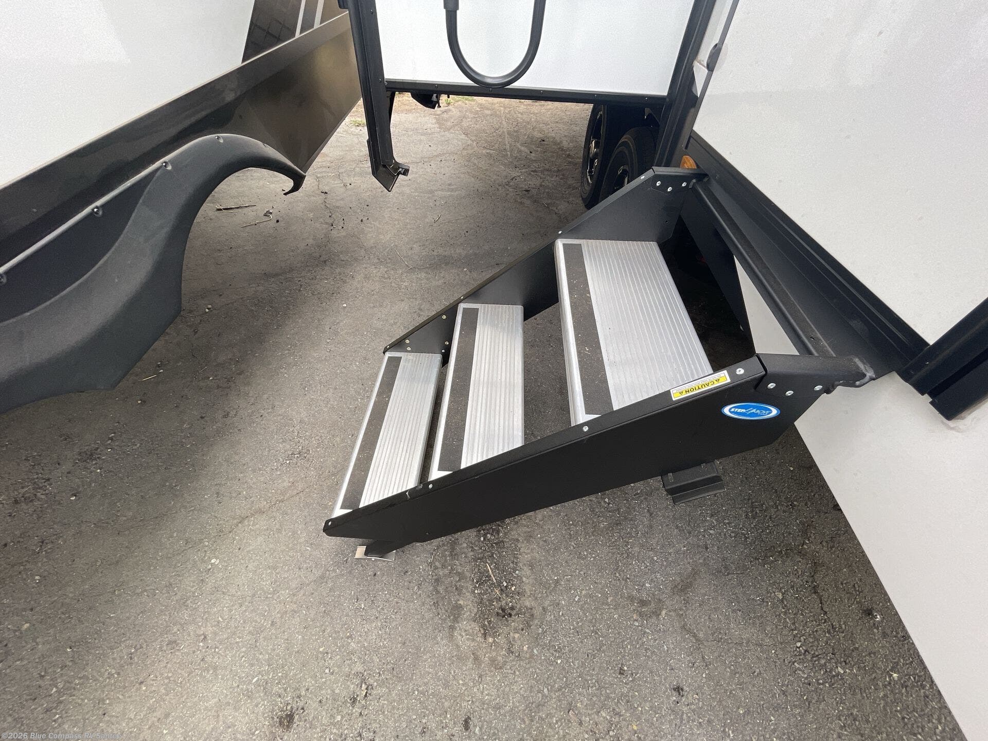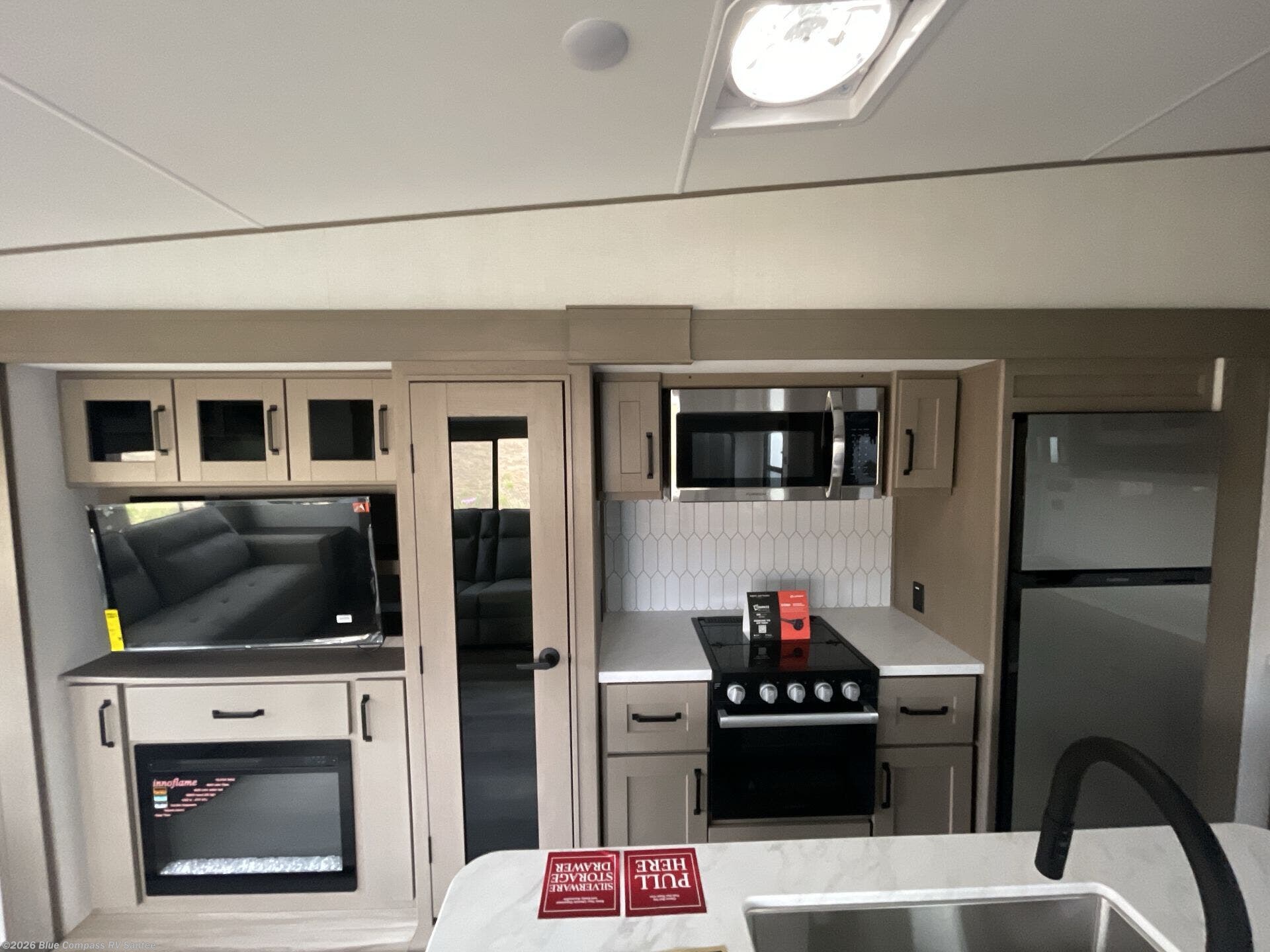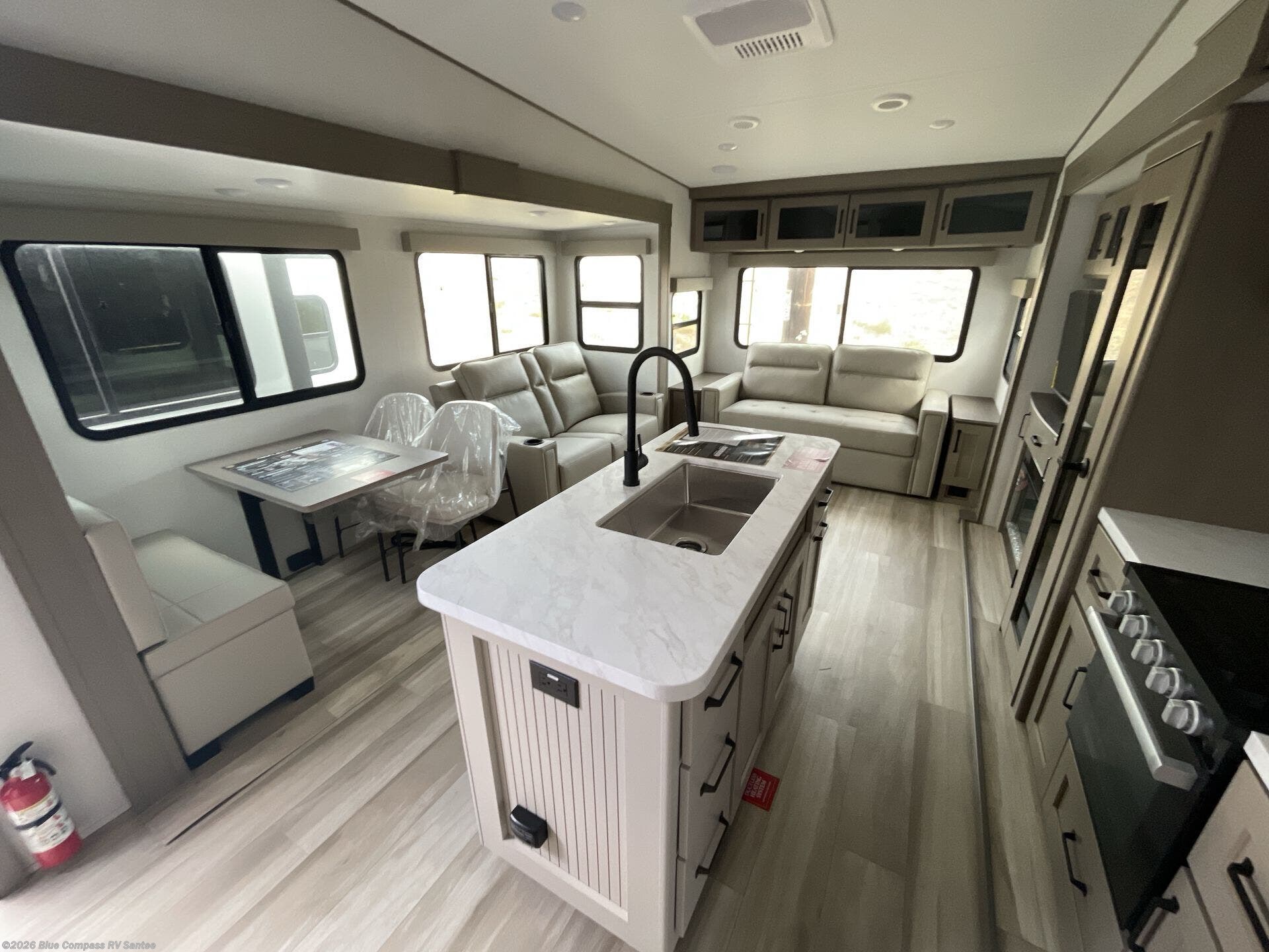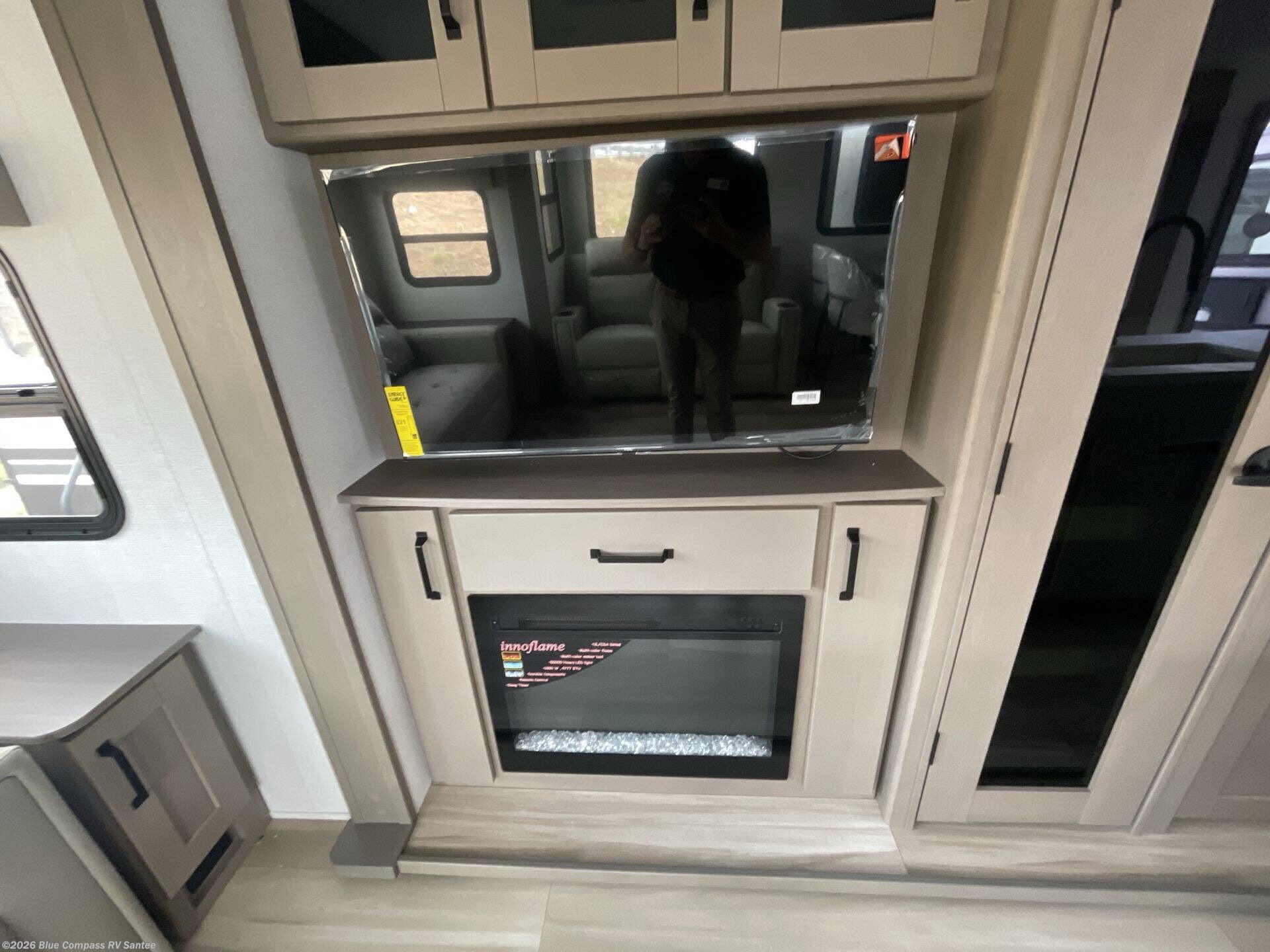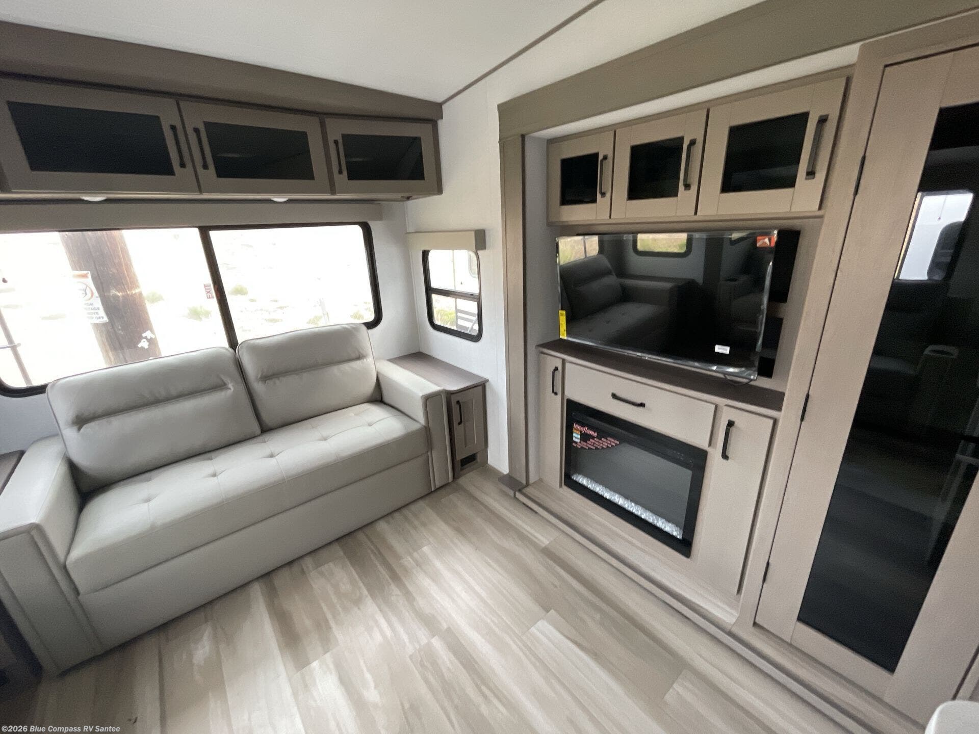 Get ready to enjoy everything the campgrounds and surrounding area has to offer when you are setup to camp in this fifth wheel! The two electric awnings offer protected areas creating outdoor living spaces; just grab your camping chairs from the unobstructed pass-through storage. And the interior offers a spacious living area and kitchen combination with dual opposing slides for maximum space. You can sit on the tri-fold sofa or the booth dinette with an option for a swivel dinette. The hutch and kitchen island offer counter space to prepare and serve meals, and there is a large pantry for goodies. The 40" LED HDTV with a fireplace below provides entertainment before bedtime or on a rainy day. And the front bedroom offers privacy, a walk-around queen bed, and plenty of storage!