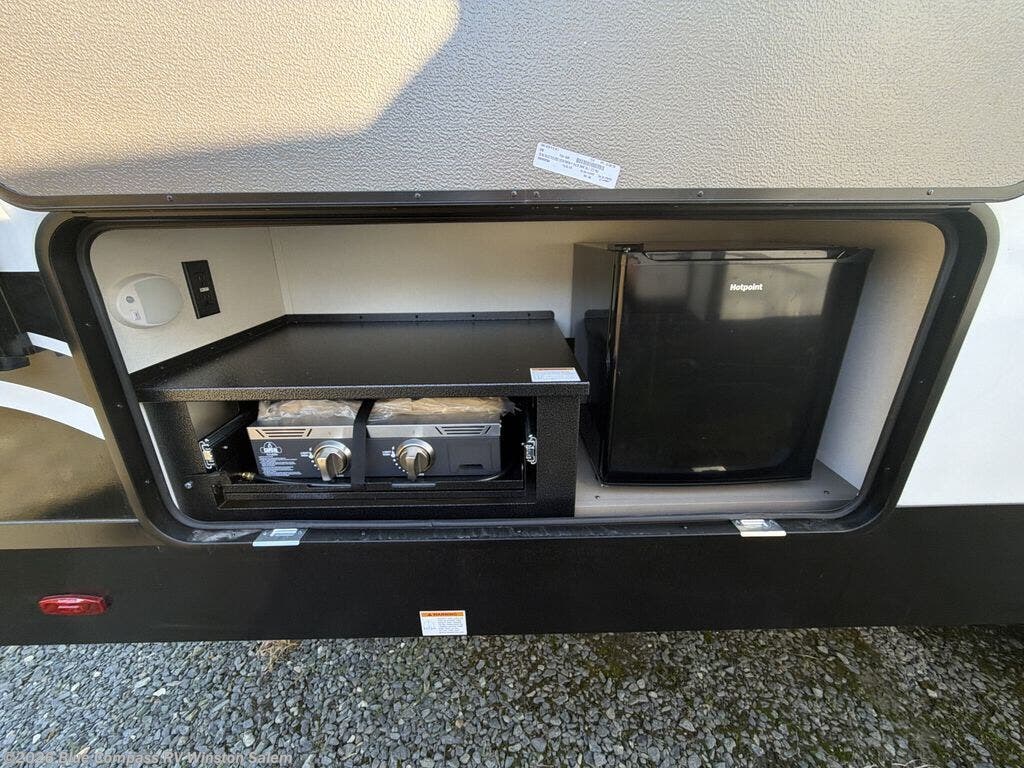 The whole family will enjoy camping in this fifth wheel! The kiddos will love having their own privacy with the rear private bunkhouse that has a 30" top bunk above a set of drawers, a 34" top bunk above a 48" lower bunk, and a TV prep area. You will enjoy having your own private retreat too with a front private bedroom that has a queen bed for a good night's rest and a wardrobe for your hang up clothes. You could even transform the U-shaped dinette and tri-fold sofa into extra sleeping spaces, and the dinette could be switched out for the optional 78" theater seating. The chef will have an easy time preparing their best dishes with the three burner cooktop and flip-up countertop or they can breathe in some fresh air while they cook at the outside kitchen with a griddle and 1.6 cu. ft. refrigerator for a cold beverage!