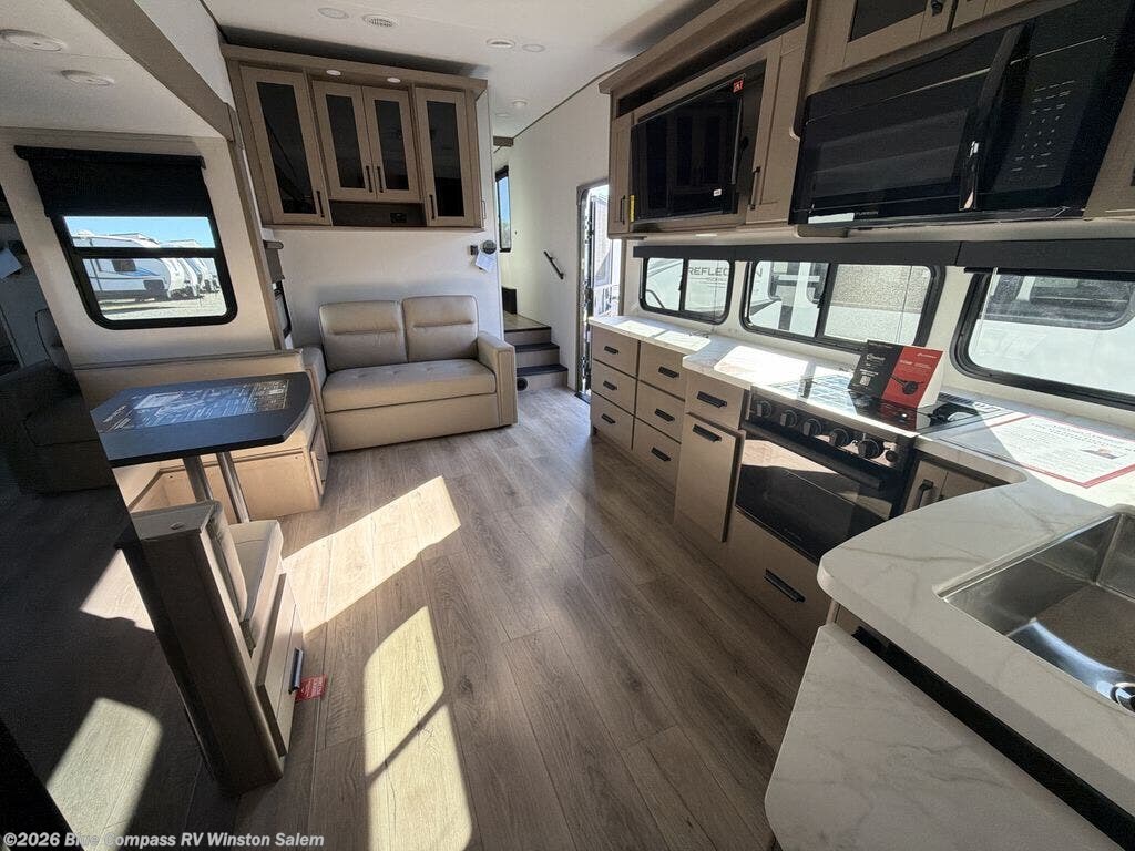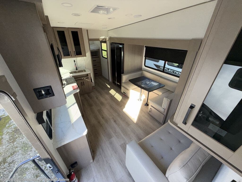 With any Reflection 150 Series fifth wheel by Grand Design, there is more available payload capacity and a broader range of half-ton trucks capable of towing this fifth wheel, and no slider hitch is needed thanks to the 90-degree turning radius which makes them short bed friendly and easier to tow. The mandatory Ultimate Power package provides a "One-Touch" automatic leveling system and a detachable power cord with LED light for easy setup, plus motion sensor pass-through lighting and entry lighting, and the Tire Linc TPMS will help you stay safe on the road. The interior offers residential luxury from the cabinetry and premium Congoleum flooring, to the booth dinette and residential-style window treatment. Make your refined decision today!