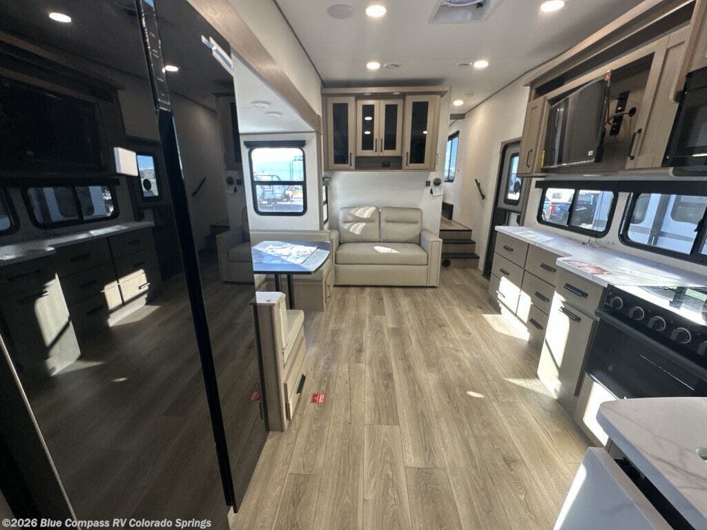 With any Reflection 150 Series fifth wheel by Grand Design, there is more available payload capacity and a broader range of half-ton trucks capable of towing this fifth wheel, and no slider hitch is needed thanks to the 90-degree turning radius which makes them short bed friendly and easier to tow. The mandatory Ultimate Power package provides a "One-Touch" automatic leveling system and a detachable power cord with LED light for easy setup, plus motion sensor pass-through lighting and entry lighting, and the Tire Linc TPMS will help you stay safe on the road. The interior offers residential cabinetry and premium Congoleum flooring, to the booth dinette and residential-style window treatment. Make your refined decision today!