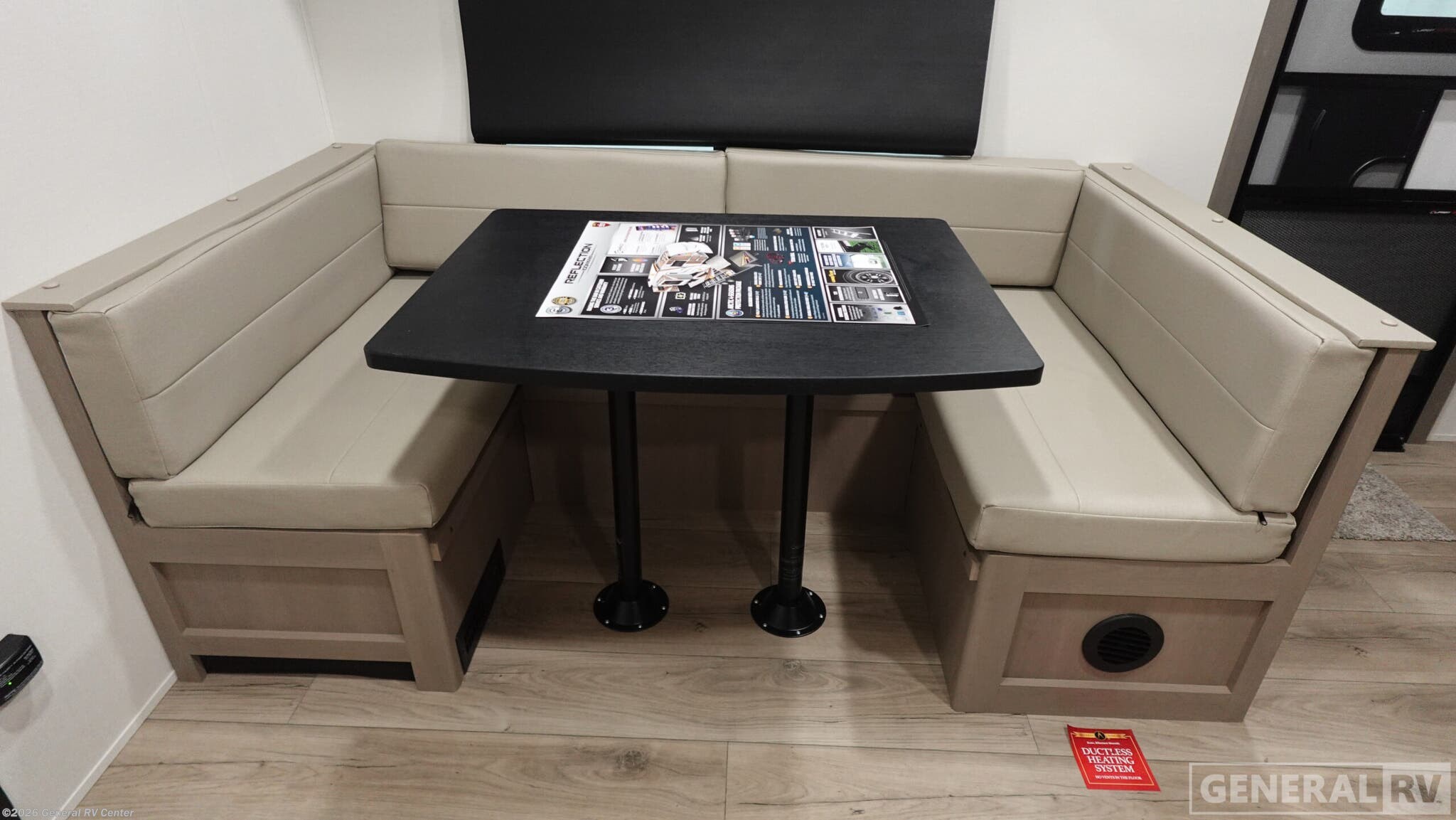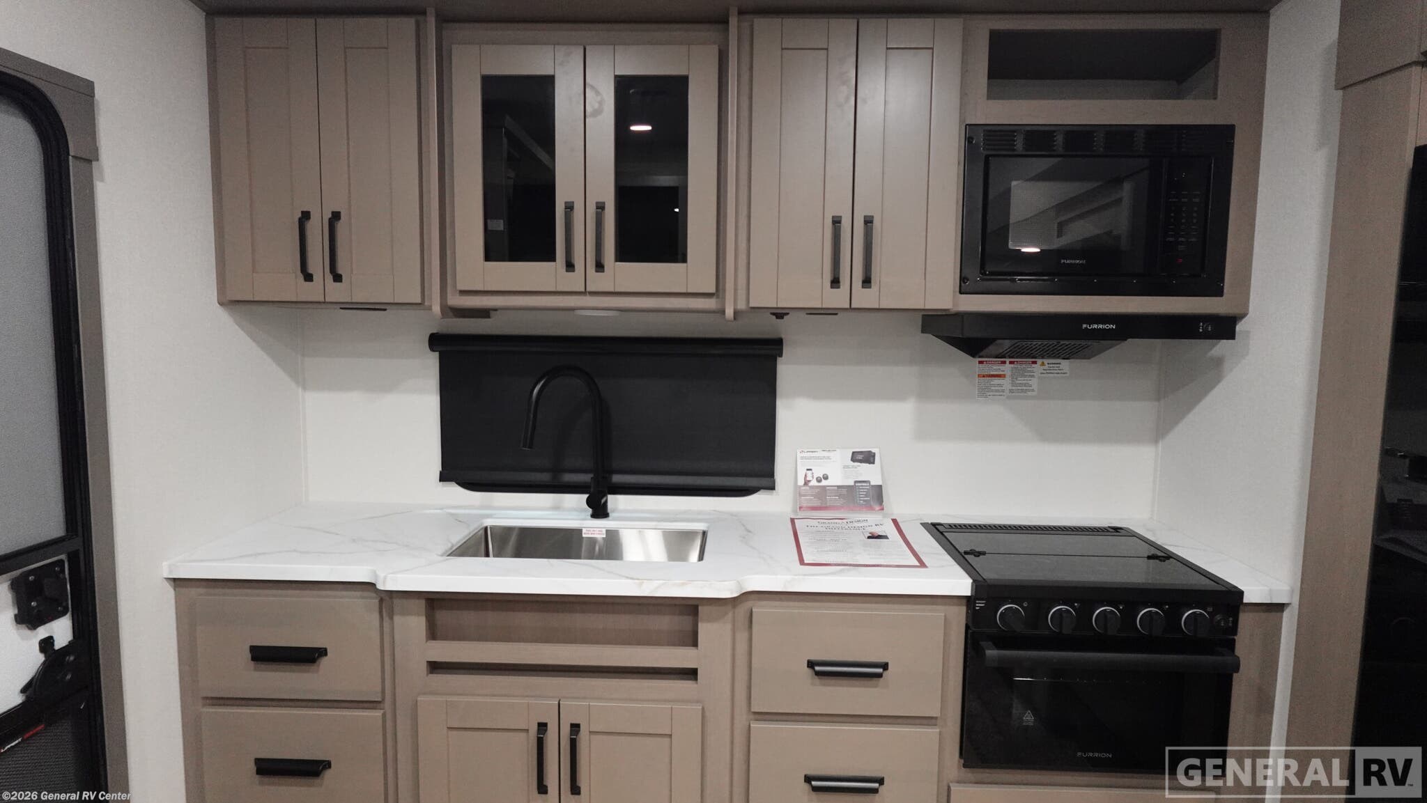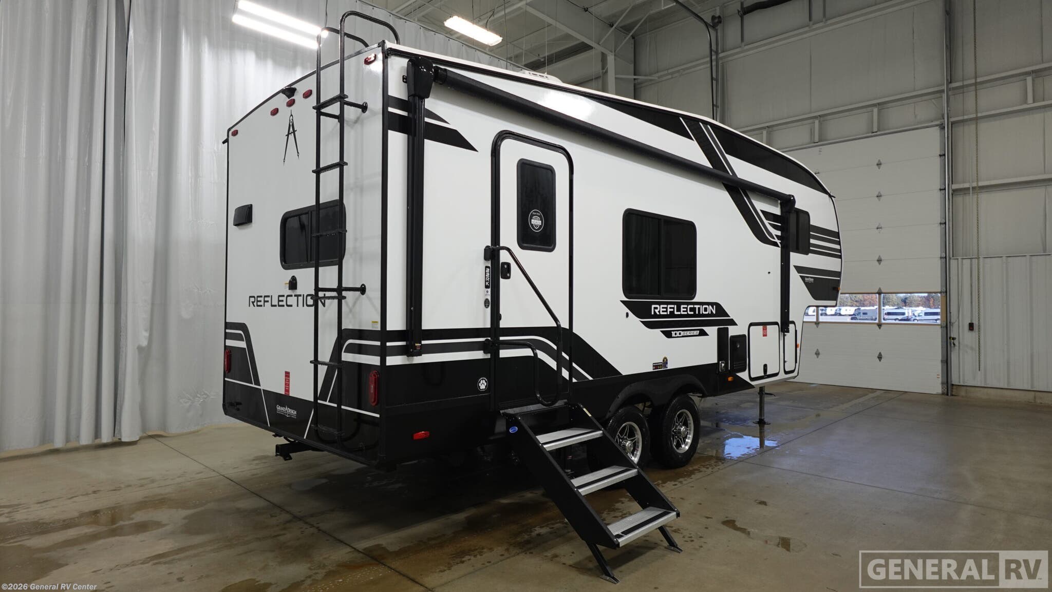 This rear kitchen fifth wheel is sure to meet all of your camping needs! Since the exterior length is only 26' 11", you can easily maneuver in and out of campgrounds. The rear kitchen includes ample counter space to prep meals, a three burner cooktop, and overhead storage for all your necessities. There is a 10 cu. ft. 12V refrigerator within the slide out that also includes the theater seating, and the U-shaped dinette provides a place to dine or play a card game. You will appreciate having convenient storage by the entry door, along with pull-out pet bowls, a functional wardrobe closet in the bedroom and an exterior pass-thru for belongings and camping gear. Each Reflection 100 Series fifth wheel by Grand Design is affordable and packed with luxury for unforgettable camping memories! The MorRyde CRE3000 suspension system and Goodyear Endurance tires will provide smooth towing from home to campground. And the solar package with a 180W solar panel, 60 Amp charge controller and 12V refrigerator will allow you to camp for longer periods of time and in more locations! A heated and enclosed underbelly with circulating heat is included in the Arctic 4-Seasons Protection Package, along with a double insulated roof and front cap, and thermofoil insulation under the holding tanks so you can camp all year long if you choose. You will appreciate having an on-demand water heater for hot showers after exploring, and the universal all-in-one docking station will let you monitor your RVs tanks levels and functions with ease. These models also include many luxurious interior features, such as premium Congoleum flooring, pleated shades, residential cabinetry, and matte black fixtures and hardware. Don't let the Reflection 100 Series fifth wheels pass you by!
