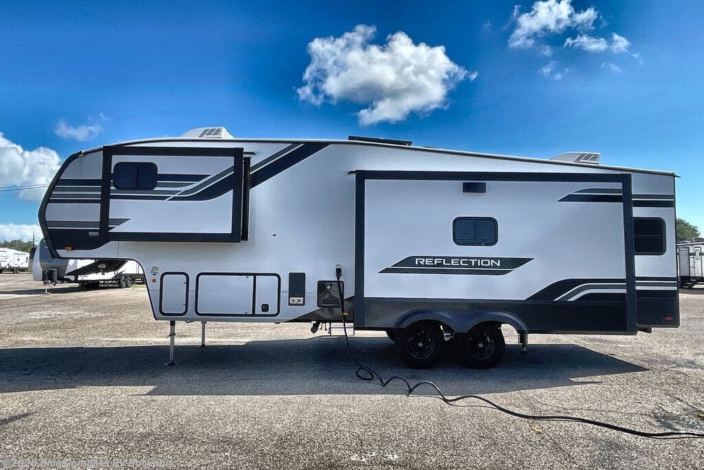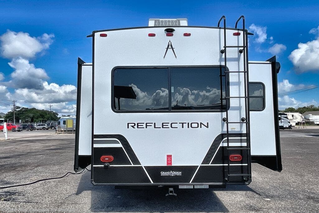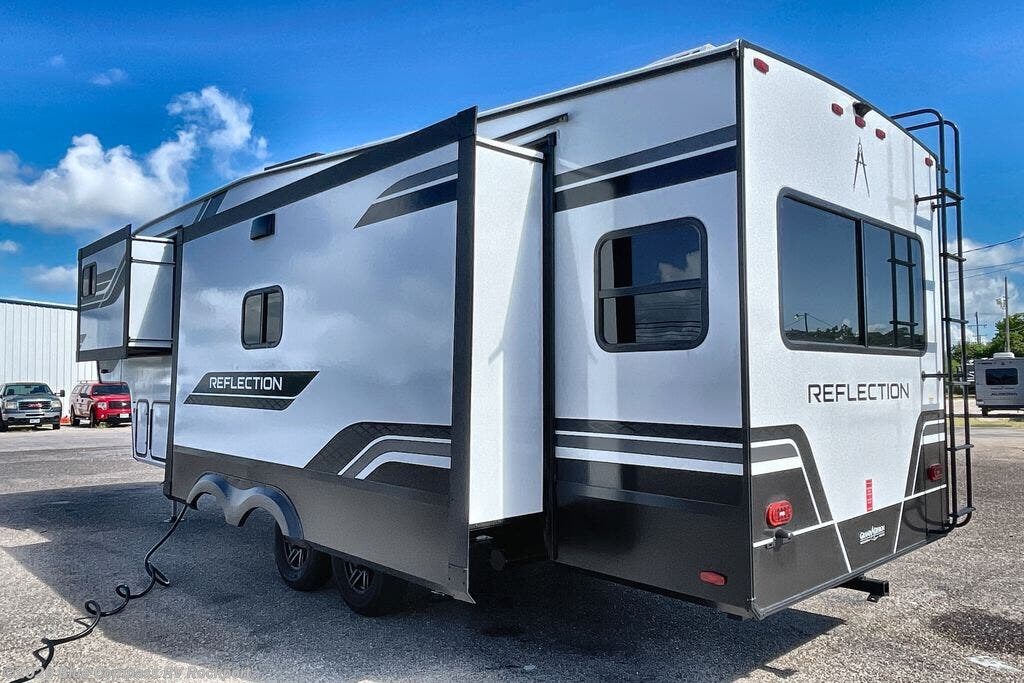 With any Reflection fifth wheel by Grand Design, you will have a solar panel for off-grid camping and a 60 amp charge controller and inverter prep, a Universal All-In-One docking station, unobstructed pass-through storage, and Goodyear Endurance tires. Each is constructed of gel coat exterior sidewalls, residential 5" truss rafters, walk-on roof decking, a fiberglass and radiant foil roof and front cap insulation plus laminated aluminum framed side walls, roof and end walls in slide rooms. Head inside to enjoy residential hardwood cabinet doors, premium Congoleum flooring, a spacious shower with a glass door, and many more comforts!
