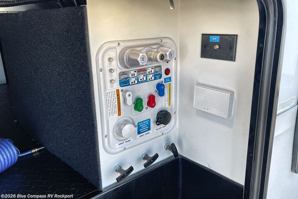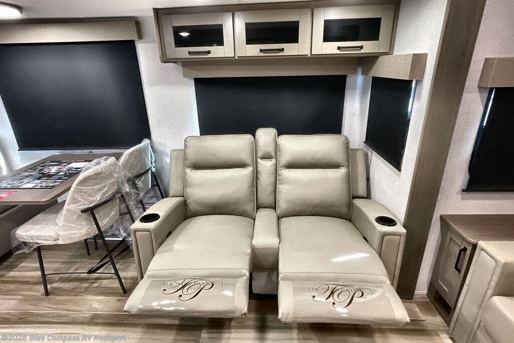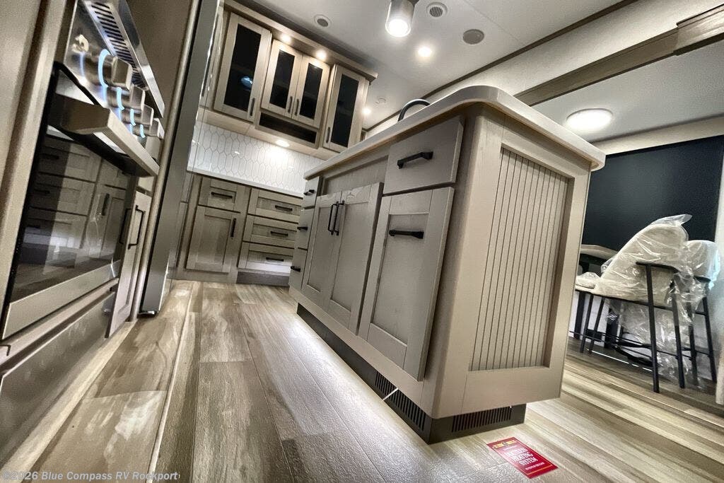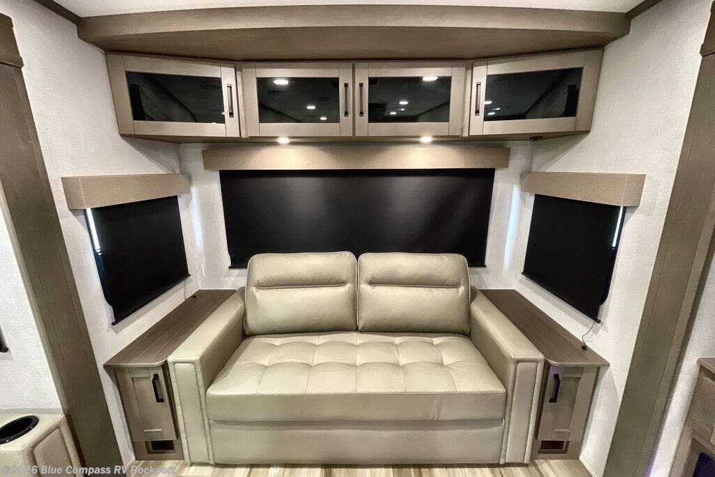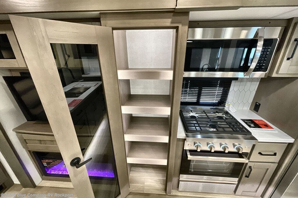 Whether you travel for pleasure or work, you will love the spacious main living and kitchen area with a rear tri-fold sofa that doubles as extra sleeping space, and the theater seating directly across from the entertainment center with a 40" LED HDTV and a fireplace below. The kitchen island will make meal prepping and drying the dishes easier and the hutch is the perfect place to place your picture frames, nice dishes, and extra cooking items. There is even a pantry that is big enough to store all of your favorite snacks, dry ingredients and such. Outside you can enjoy two electric awnings that provide protection from the elements as you relax and visit with other RVers, and your camping chairs can easily be stored in the pass-through compartment. The double entry bathroom is convenient especially at night when you can slide the door to enter from the front master bedroom. You will find plenty of storage for your clothing and gear, plus the bedroom slide out gives you drawers and linen storage that stretches into the full bathroom.