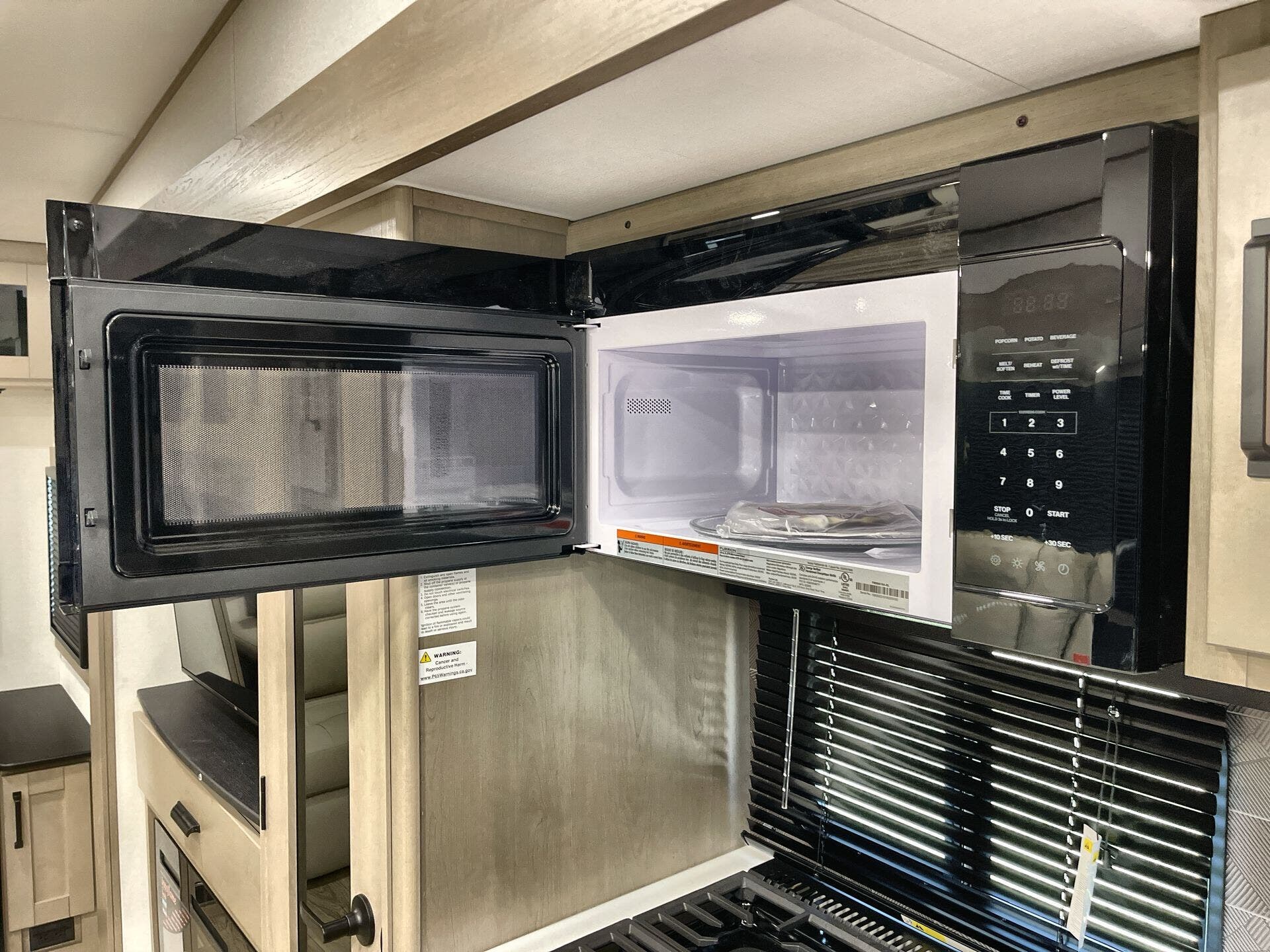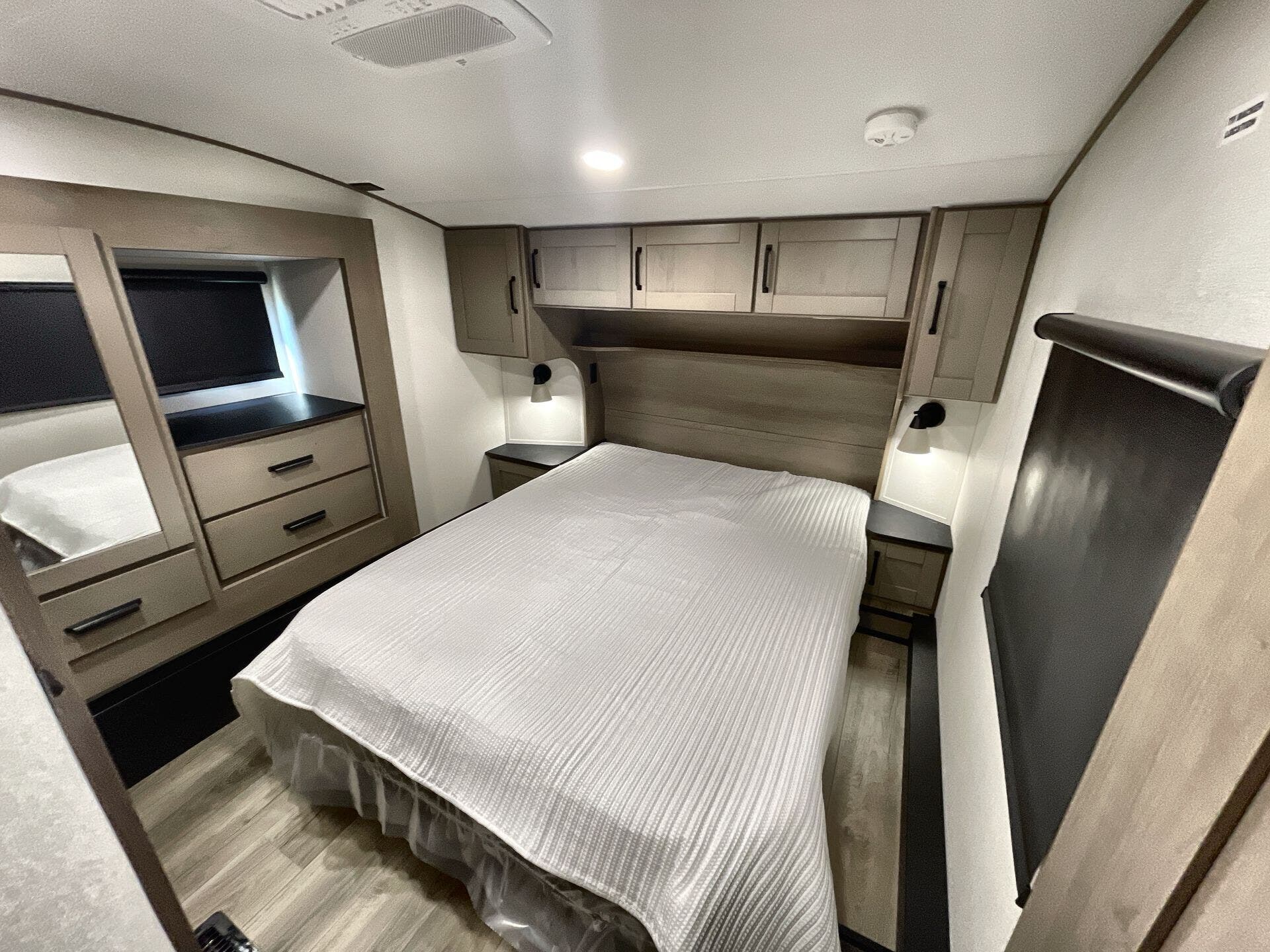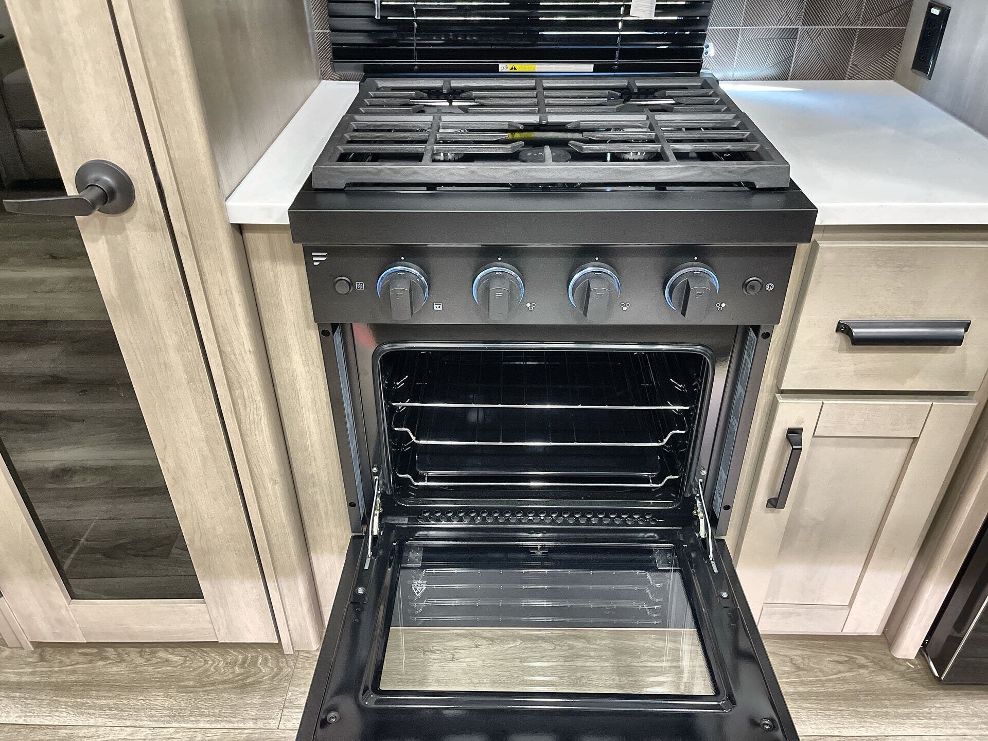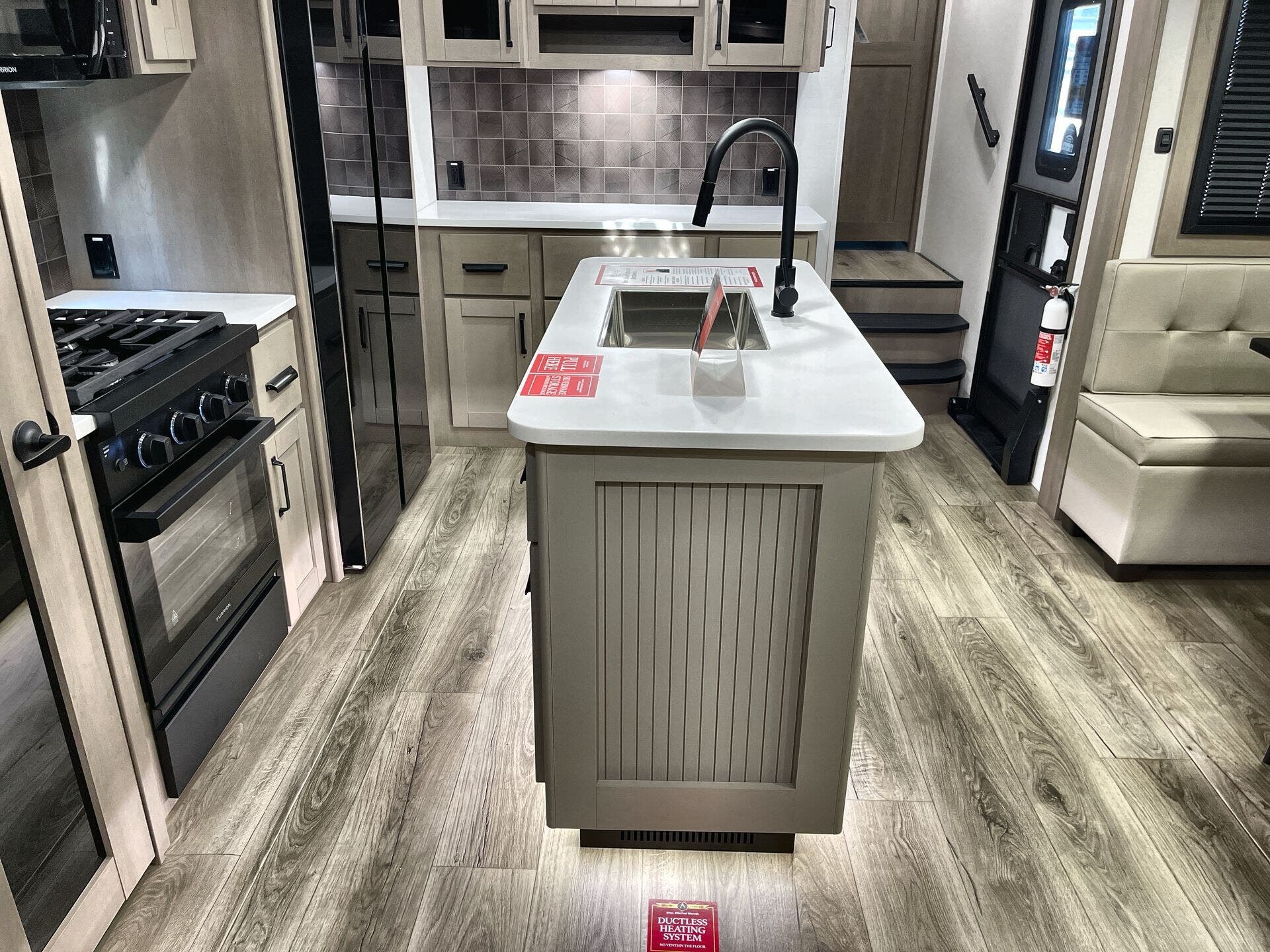 The 303RLS showcases a rear living layout that emphasizes comfort and conversation-friendly zones. Three slides open up a broad living and kitchen area, while the entry side provides easy access to storage and the enhanced interior. Pass-thru storage and a roof deck add outdoor versatility, making this model ideal for family adventures or extended getaways in a dependable towable RV.