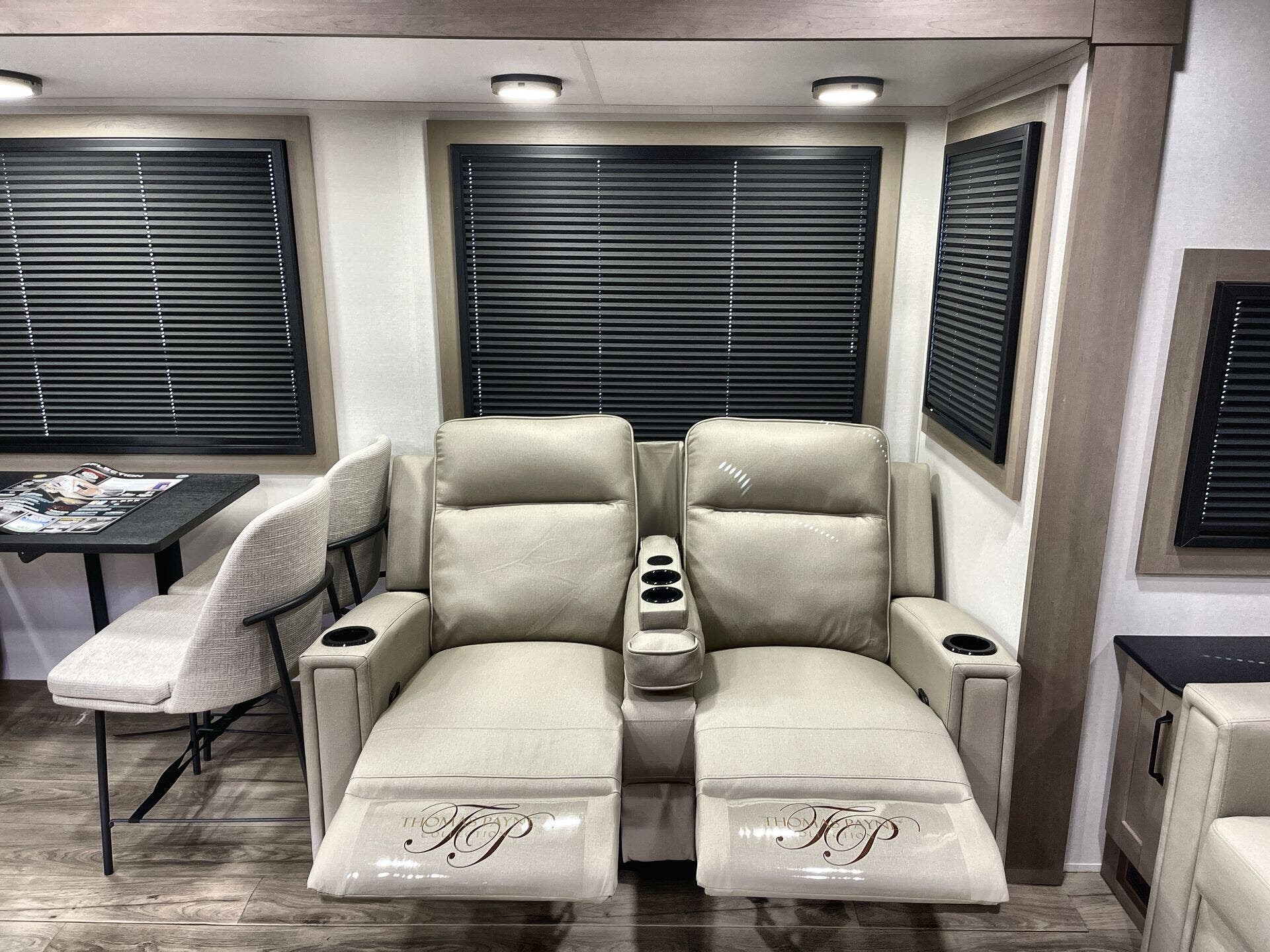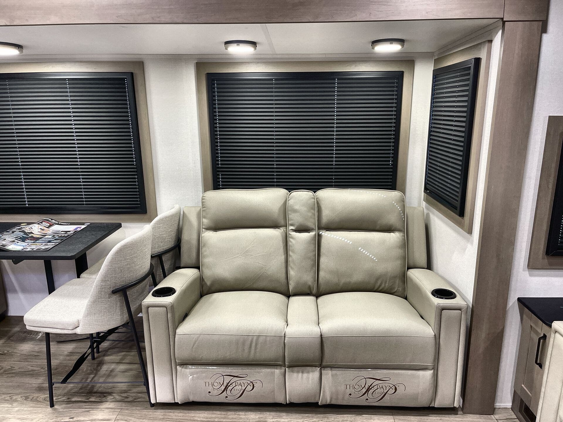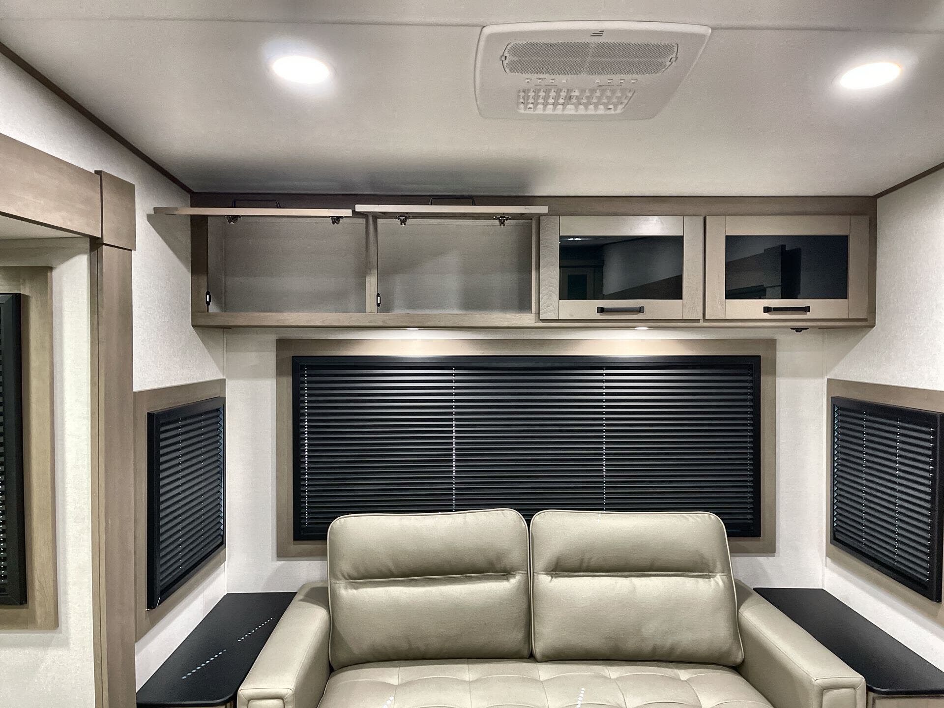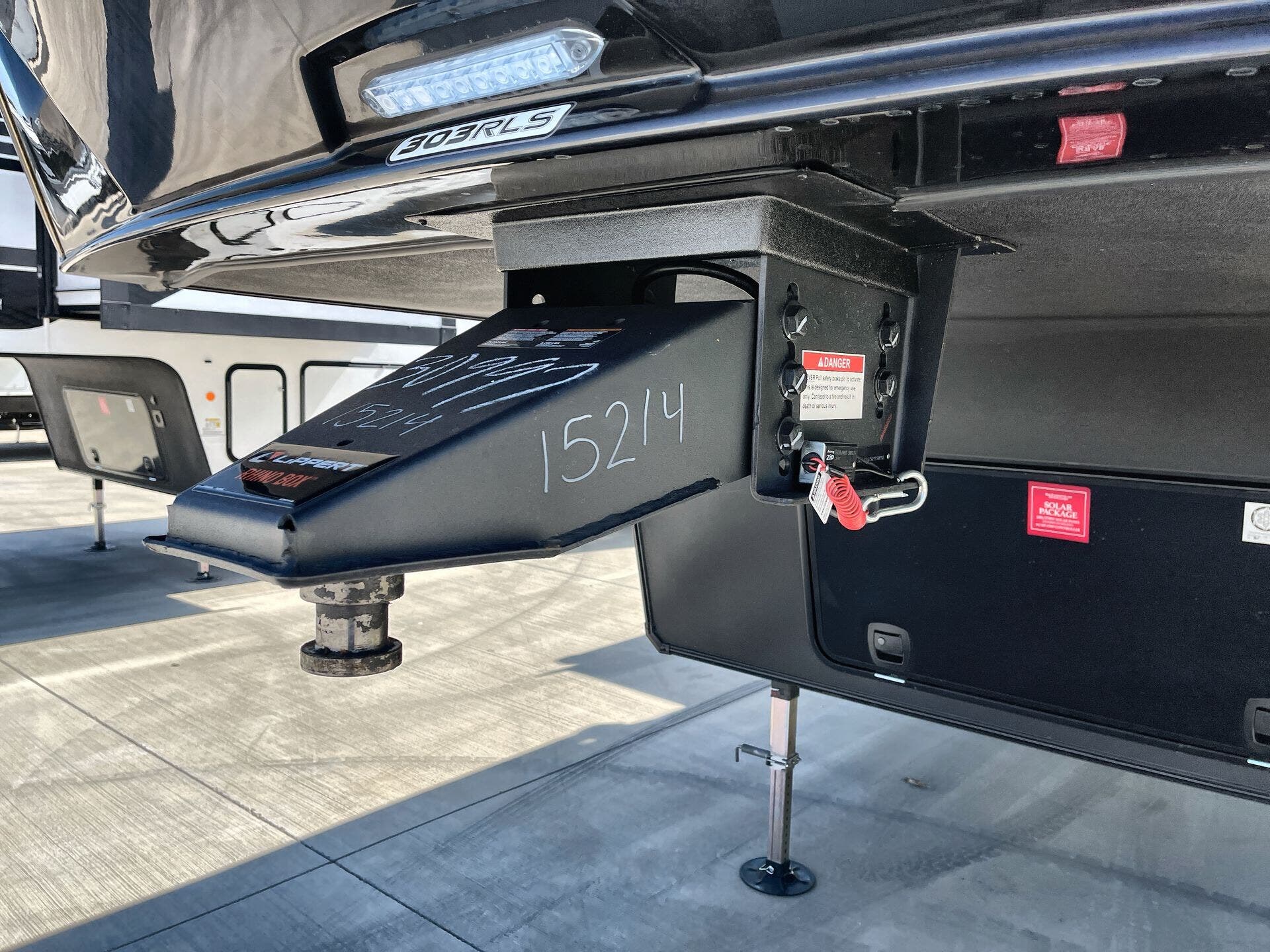 The Reflection 303RLS is a premium recreational vehicle designed for extended trips and seasonal camping. At approximately 32 feet 10 inches in length, 8 feet wide, and 12 feet 3 inches tall, this unit packs luxury inside a manageable size. It features a GVWR of 11,995 pounds, a dry weight of 10,100 pounds, and a payload capacity of 1,895 pounds. A hitch weight of 1,980 pounds and two axles ensure stable, confident handling on the road. The unit includes one air conditioner (15,000 BTU) and a solar panel with inverter, supporting off-grid camping alongside standard hookups.