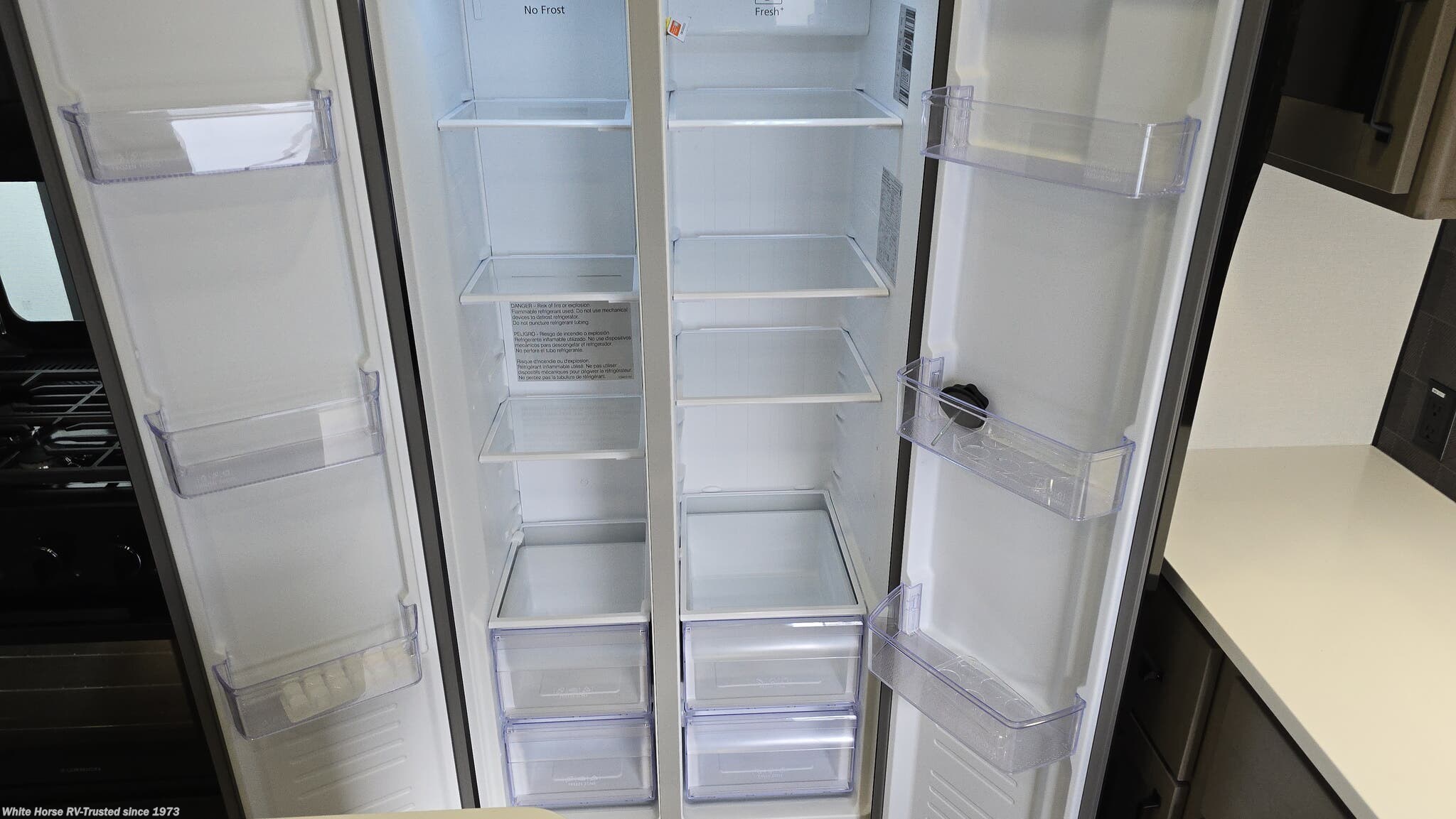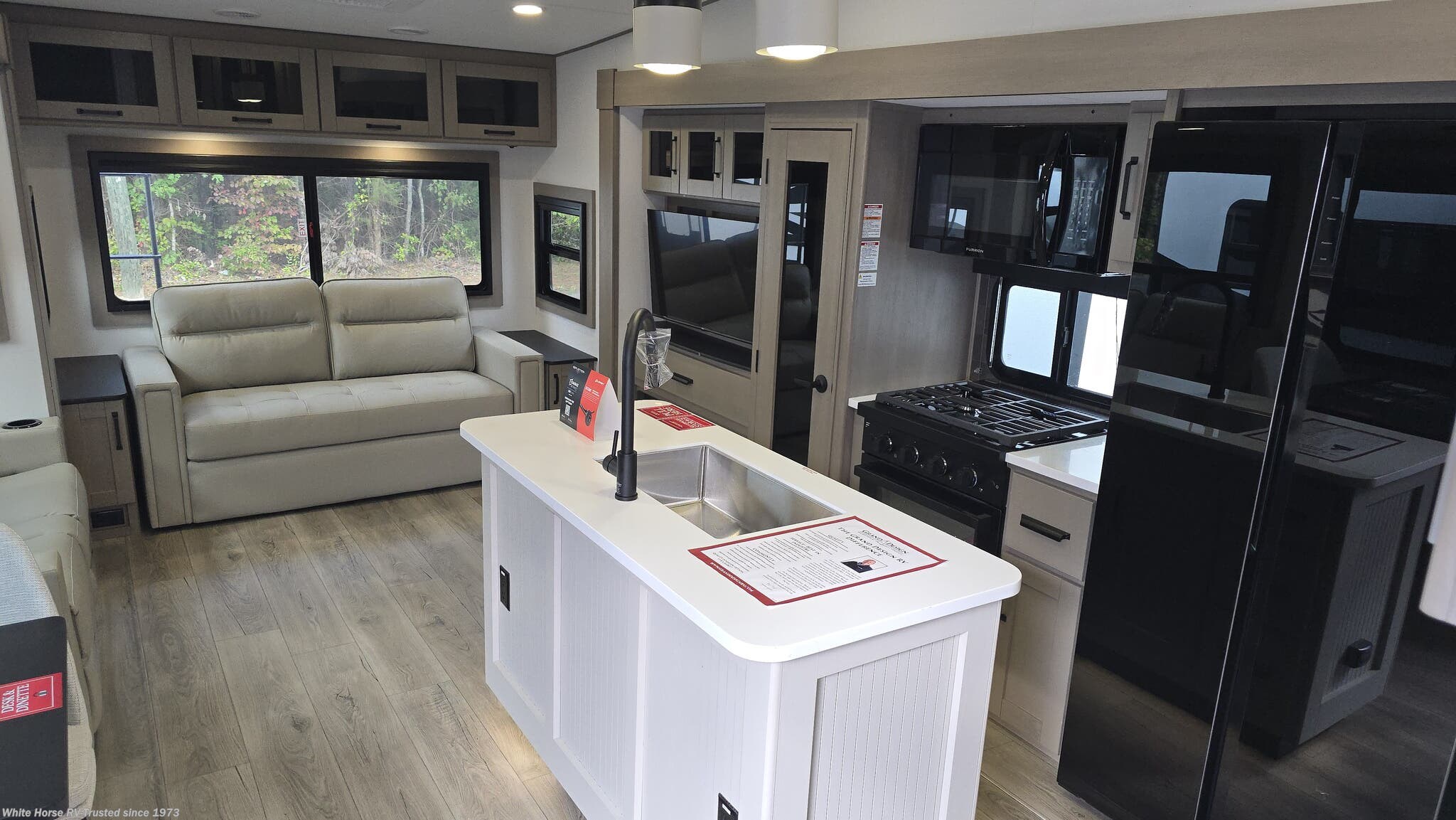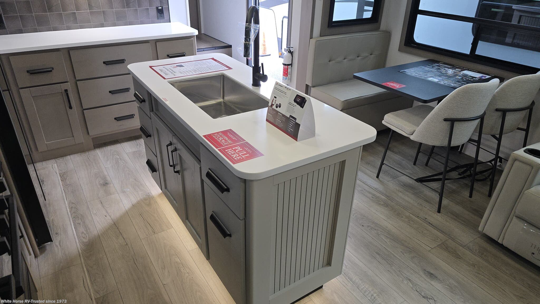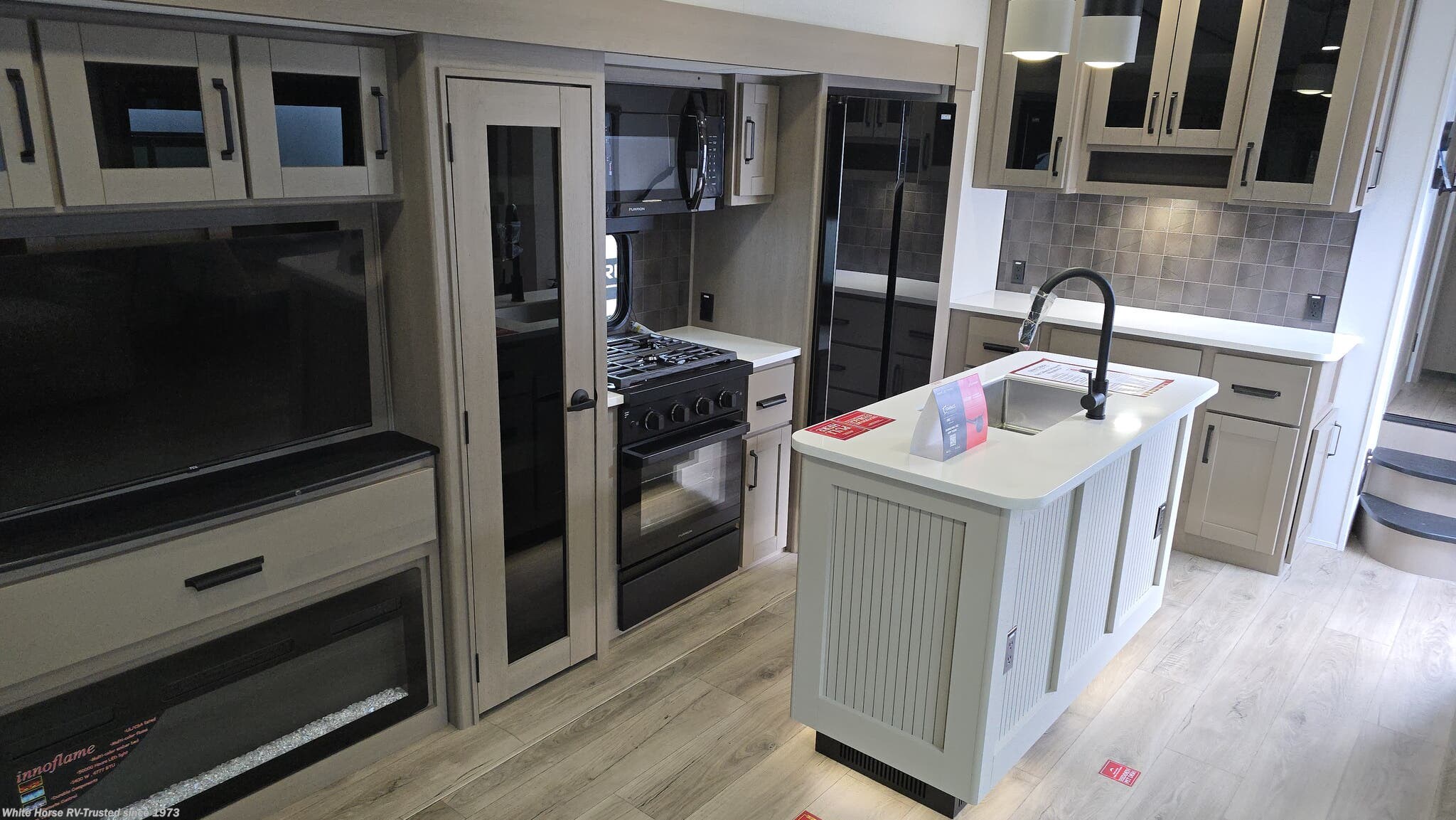Residential Kitchen: 16 cu. ft. refrigerator, deep pantry, large island with sink, microwave, and 3-burner cooktop—perfect for gourmet meals on the road