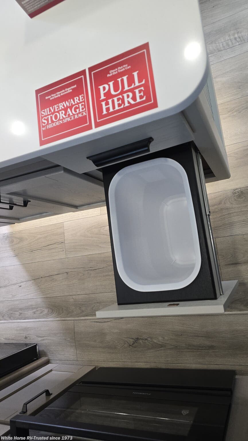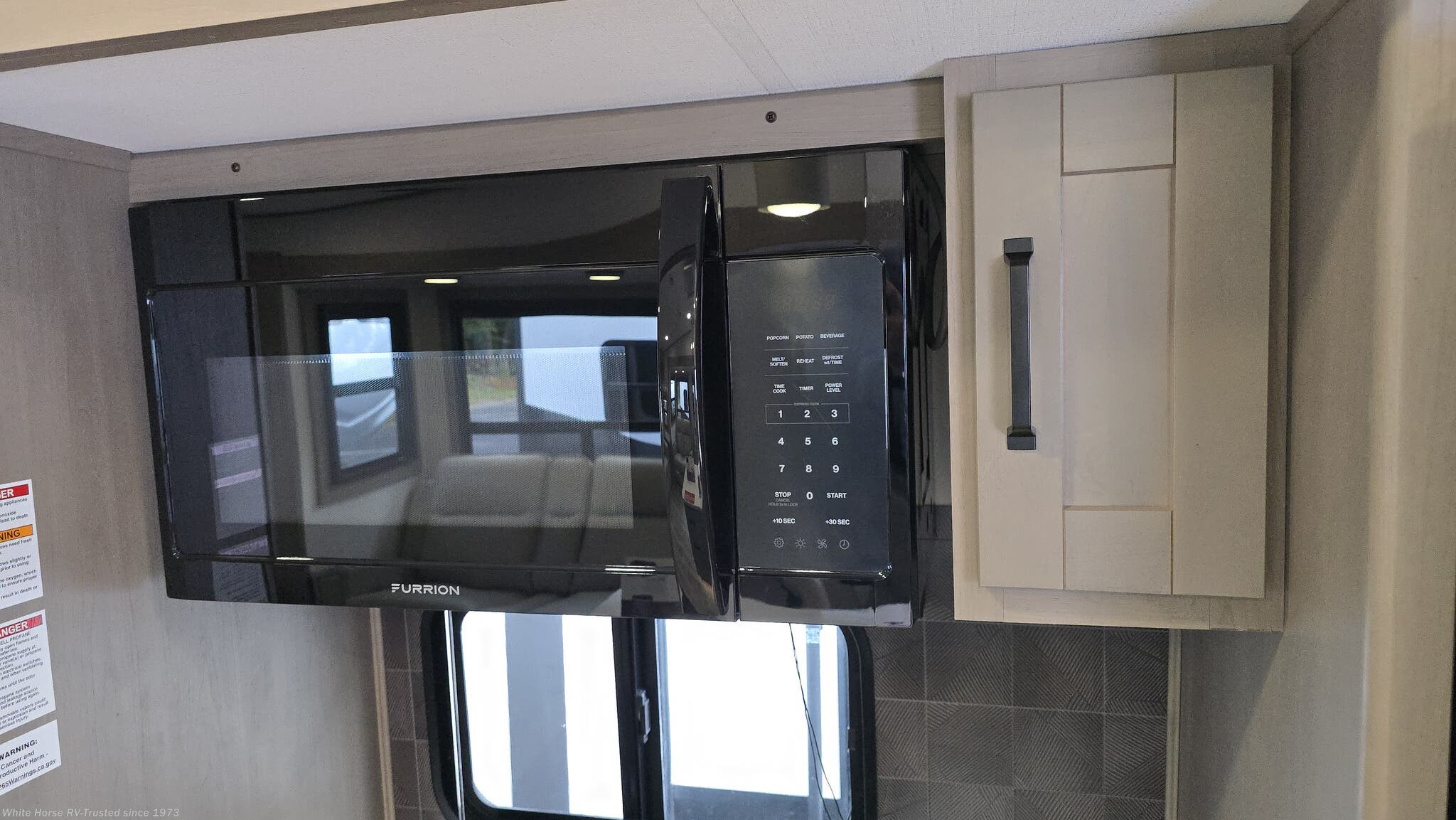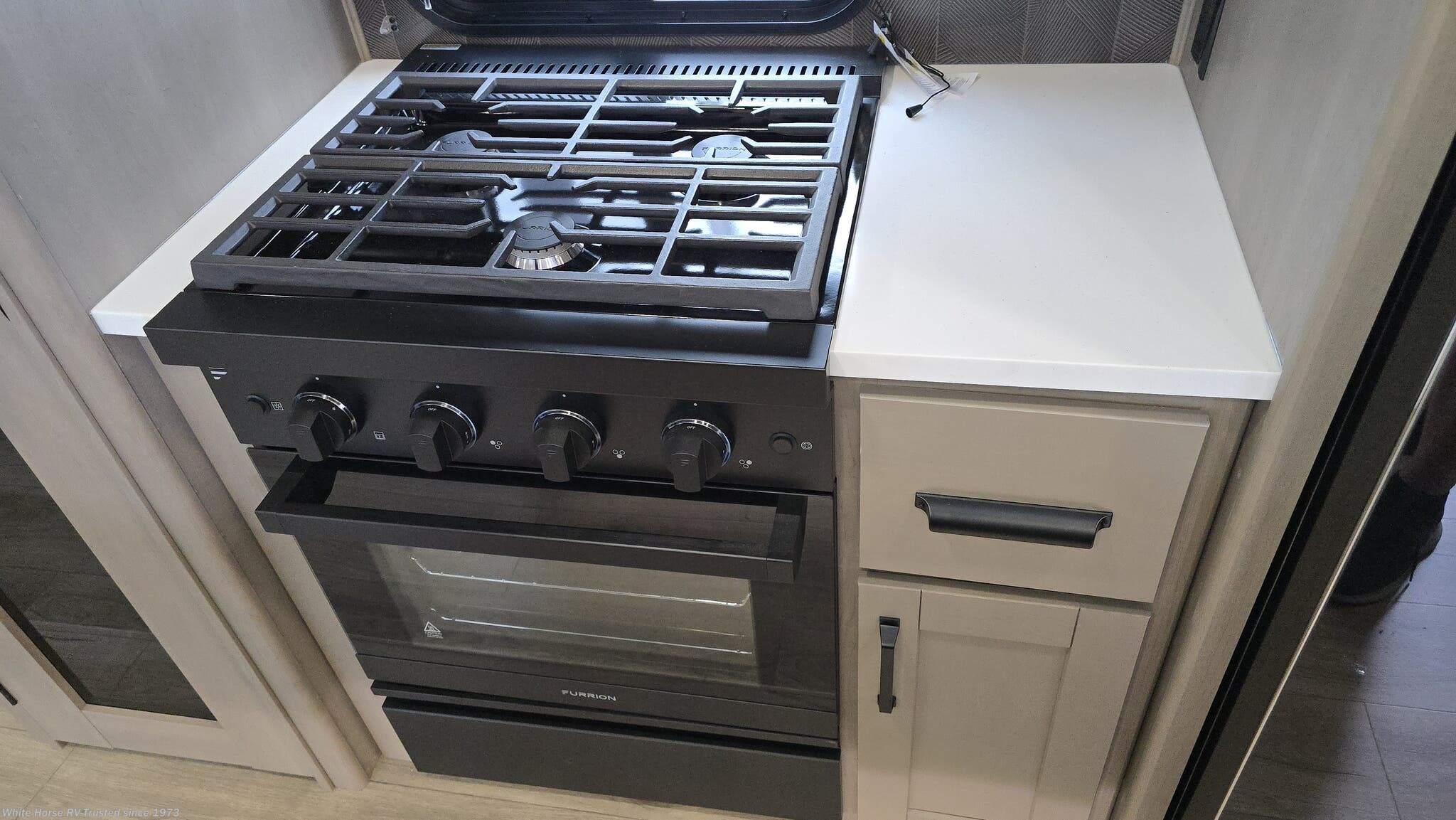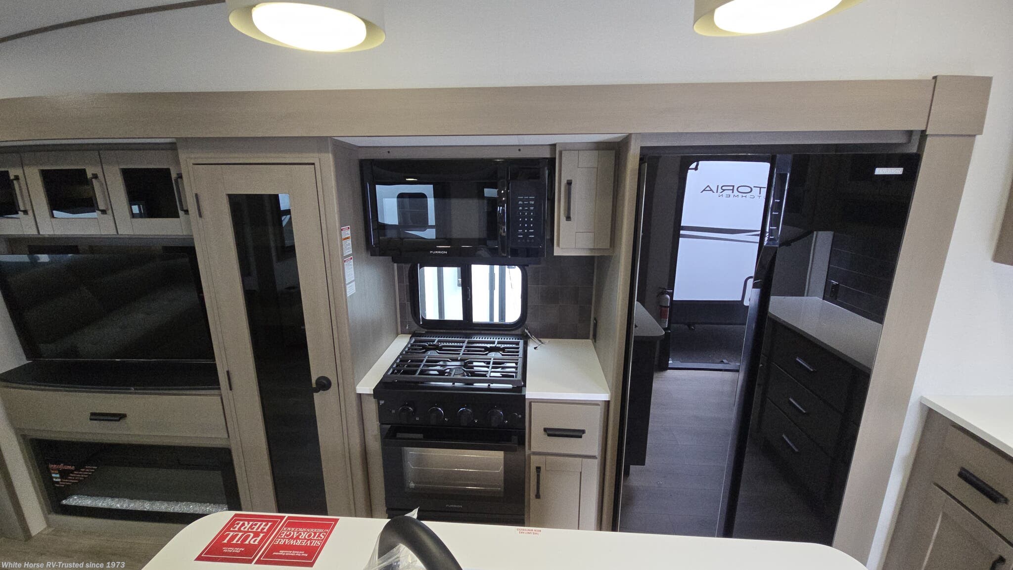 Residential Kitchen: 16 cu. ft. refrigerator, deep pantry, large island with sink, microwave, and 3-burner cooktop—perfect for gourmet meals on the road