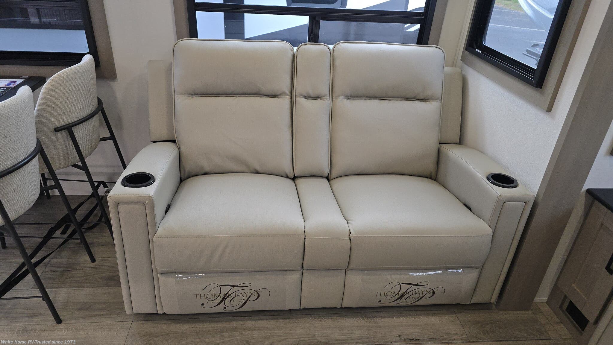 Spacious Rear Living Layout: Large tri-fold sofa, theater seating, and entertainment center with fireplace and 40” TV