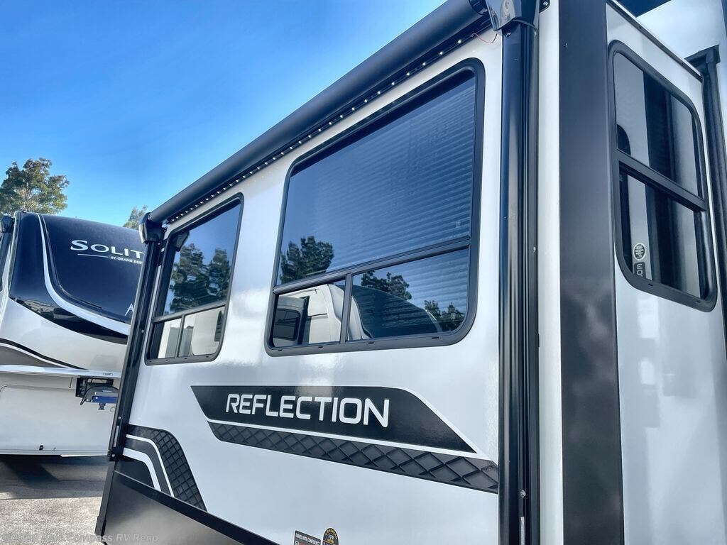 With any Reflection fifth wheel by Grand Design, you will have a solar panel for off-grid camping and a 60 amp charge controller and inverter prep, a Universal All-In-One docking station, unobstructed pass-through storage, and Goodyear Endurance tires. Each is constructed of gel coat exterior sidewalls, residential 5" truss rafters, walk-on roof decking, a fiberglass and radiant foil roof and front cap insulation plus laminated aluminum framed side walls, roof and end walls in slide rooms. Head inside to enjoy residential hardwood cabinet doors, premium Congoleum flooring, a spacious shower with a glass door, and many more comforts!