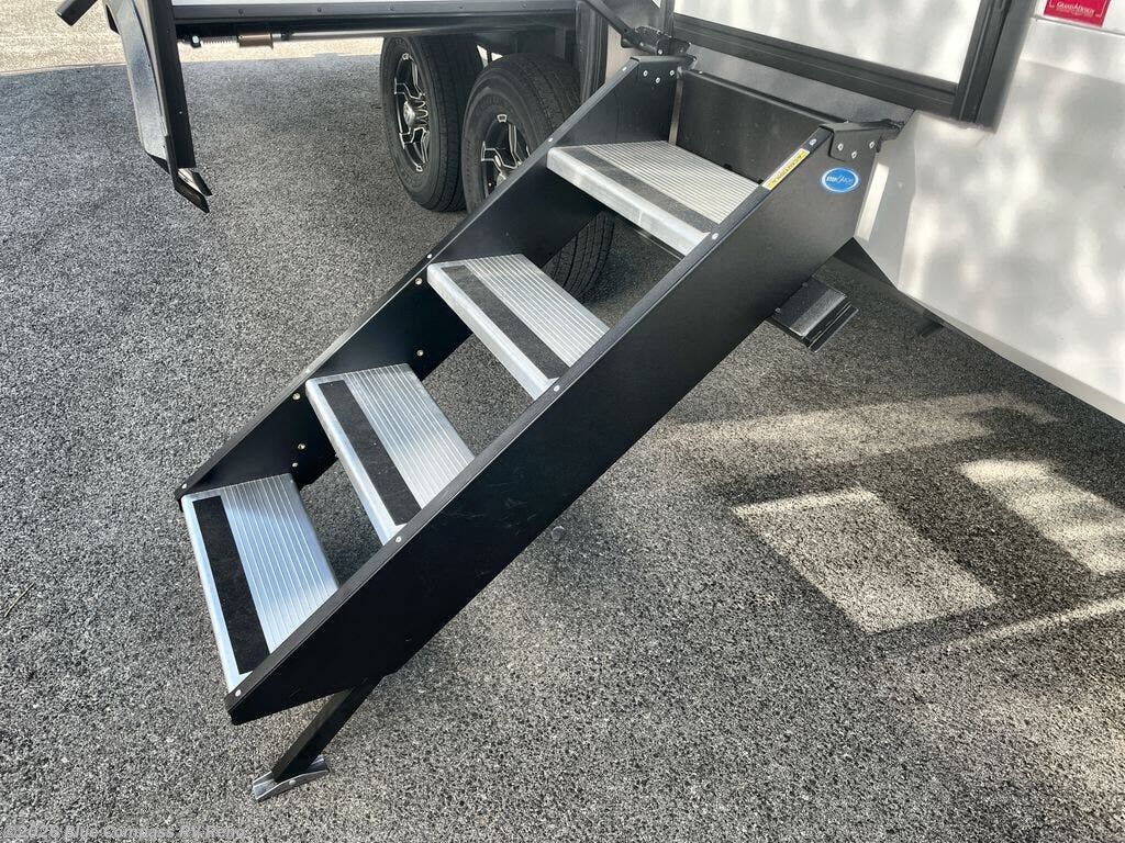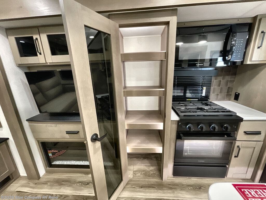 Whether you travel for pleasure or work, you will love the spacious main living and kitchen area with a rear tri-fold sofa that doubles as extra sleeping space, and the theater seating directly across from the entertainment center with a 40" LED HDTV and a fireplace below. The kitchen island will make meal prepping and drying the dishes easier and the hutch is the perfect place to place your picture frames, nice dishes, and extra cooking items. There is even a pantry that is big enough to store all of your favorite snacks, dry ingredients and such. Outside you can enjoy two electric awnings that provide protection from the elements as you relax and visit with other RVers, and your camping chairs can easily be stored in the pass-through compartment. The double entry bathroom is convenient especially at night when you can slide the door to enter from the front master bedroom. You will find plenty of storage for your clothing and gear, plus the bedroom slide out gives you drawers and linen storage that stretches into the full bathroom.