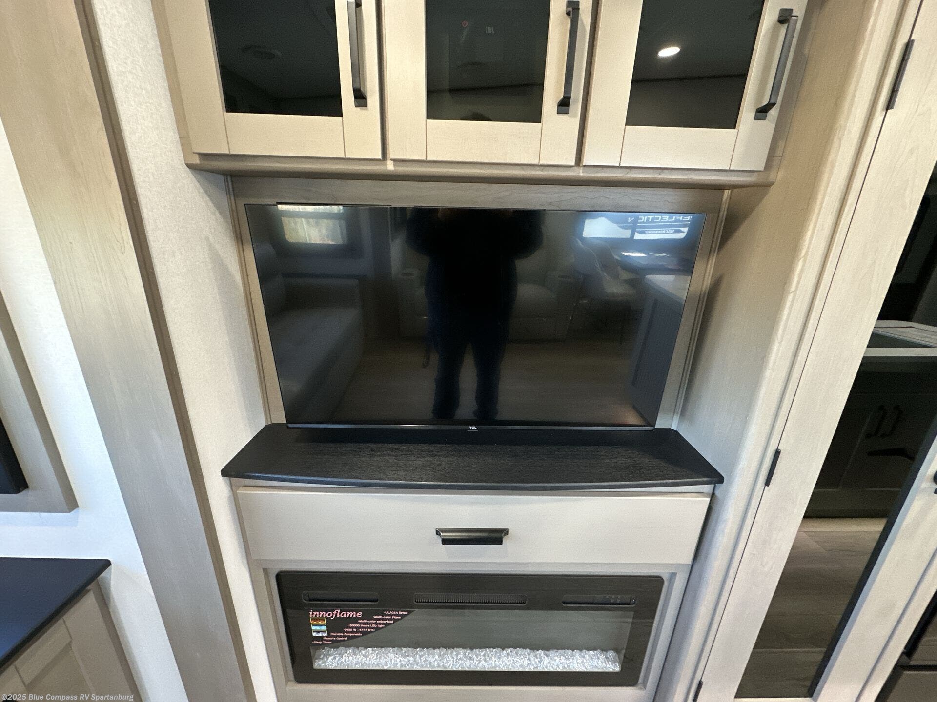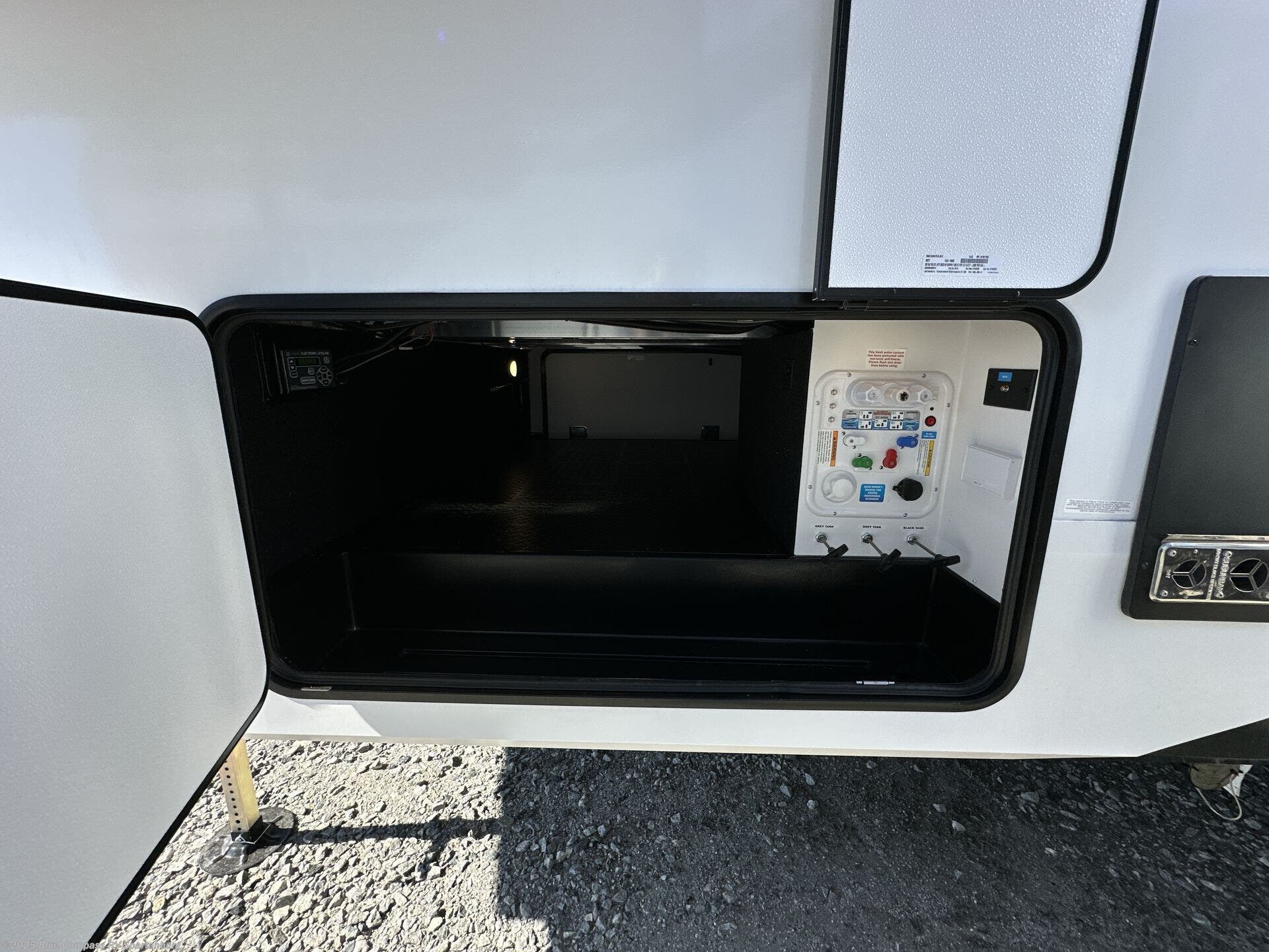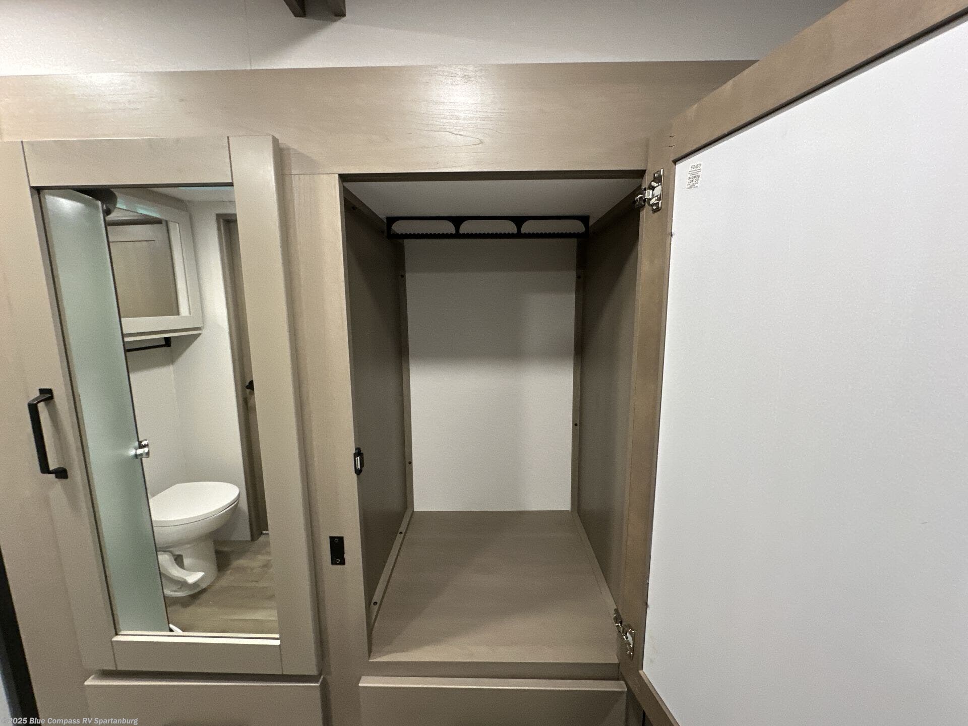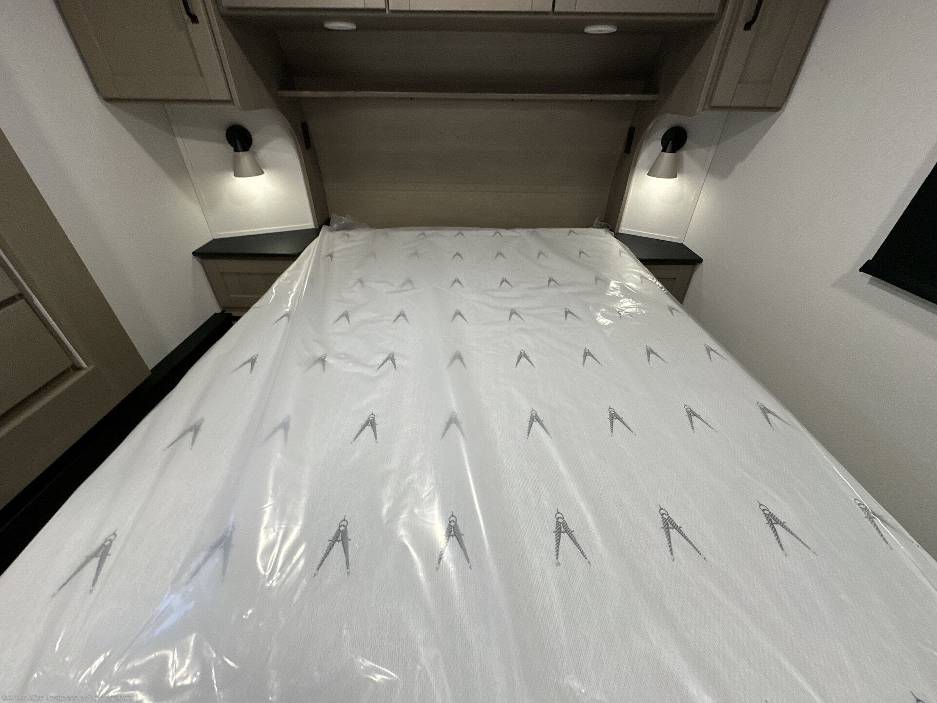Whether you travel for pleasure or work, you will love the spacious main living and kitchen area with a rear tri-fold sofa that doubles as extra sleeping space, and the theater seating directly across from the entertainment center with a 40" LED HDTV and a fireplace below. The kitchen island will make meal prepping and drying the dishes easier and the hutch is the perfect place to place your picture frames, nice dishes, and extra cooking items. There is even a pantry that is big enough to store all of your favorite snacks, dry ingredients and such. Outside you can enjoy two electric awnings that provide protection from the elements as you relax and visit with other RVers, and your camping chairs can easily be stored in the pass-through compartment. The double entry bathroom is convenient especially at night when you can slide the door to enter from the front master bedroom. You will find plenty of storage for your clothing and gear, plus the bedroom slide out gives you drawers and linen storage that stretches into the full bathroom.