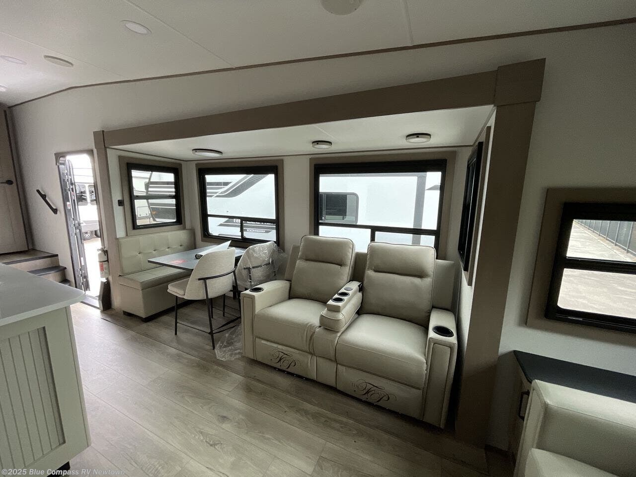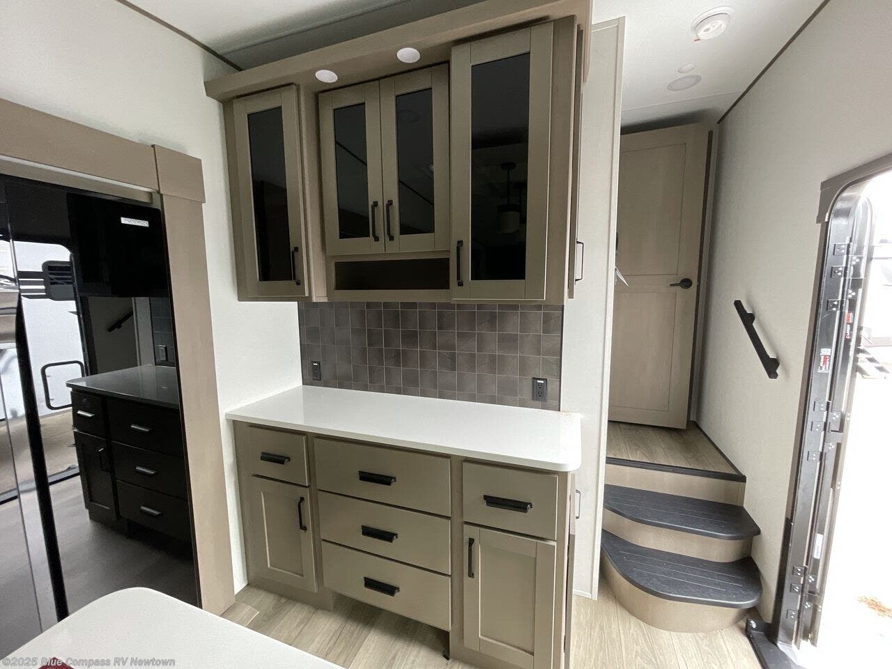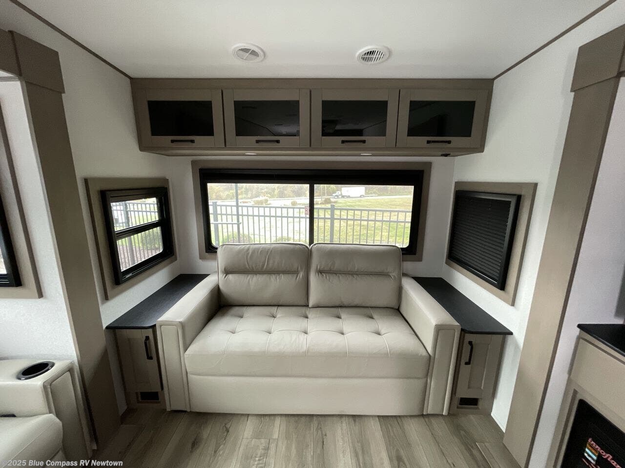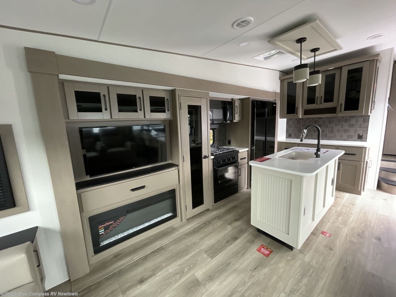 Whether you travel for pleasure or work, you will love the spacious main living and kitchen area with a rear tri-fold sofa that doubles as extra sleeping space, and the theater seating directly across from the entertainment center with a 40" LED HDTV and a fireplace below. The kitchen island will make meal prepping and drying the dishes easier and the hutch is the perfect place to place your picture frames, nice dishes, and extra cooking items. There is even a pantry that is big enough to store all of your favorite snacks, dry ingredients and such. Outside you can enjoy two electric awnings that provide protection from the elements as you relax and visit with other RVers, and your camping chairs can easily be stored in the pass-through compartment. The double entry bathroom is convenient especially at night when you can slide the door to enter from the front master bedroom. You will find plenty of storage for your clothing and gear, plus the bedroom slide out gives you drawers and linen storage that stretches into the full bathroom.