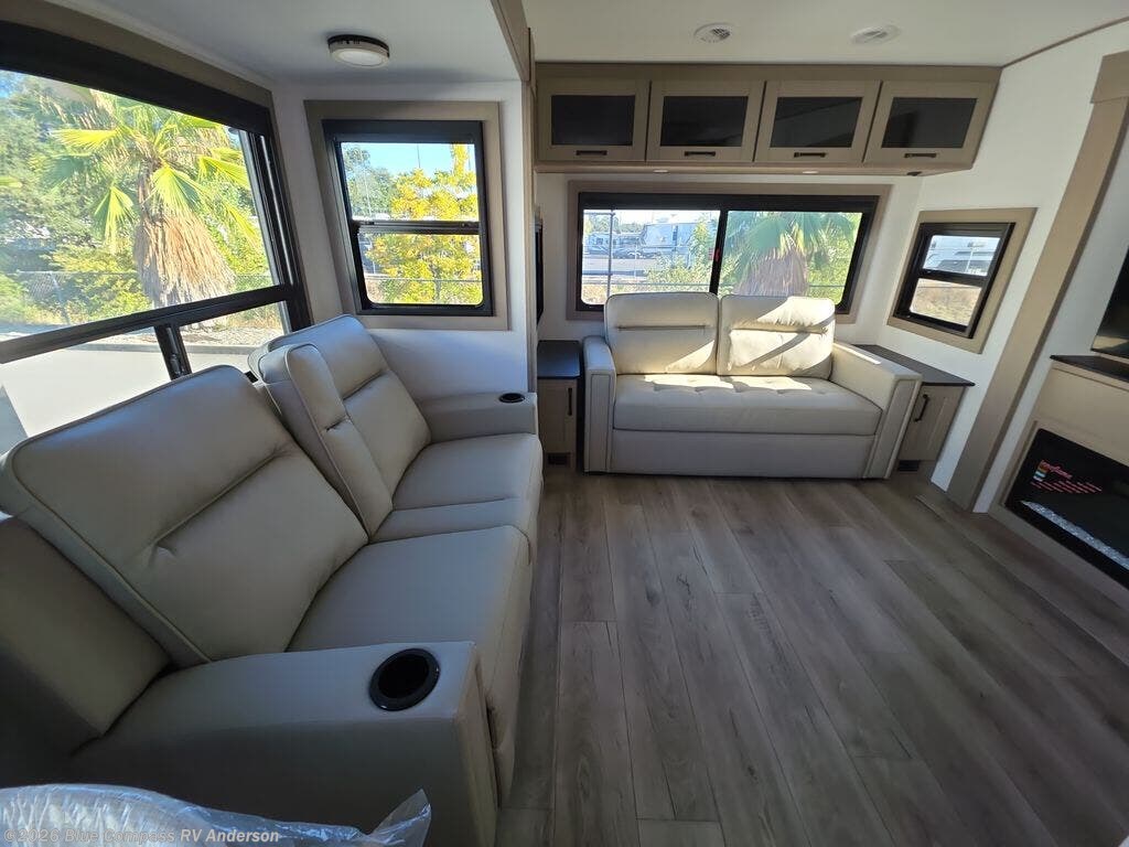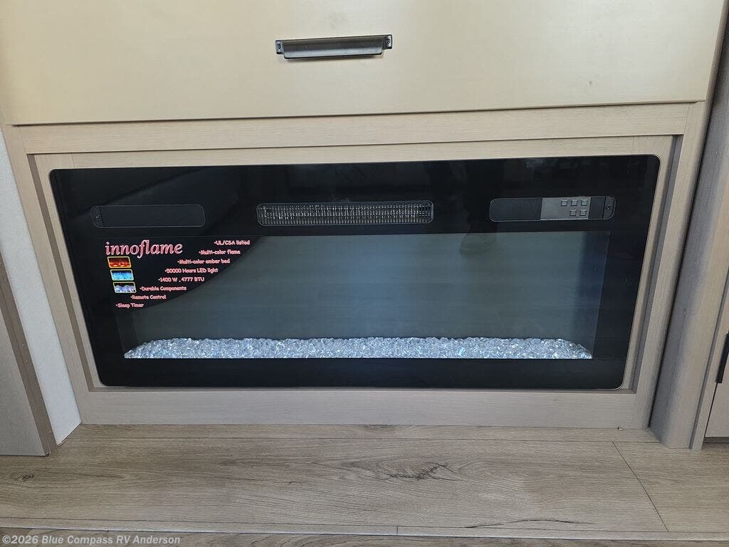 Whether you travel for pleasure or work, you will love the spacious main living and kitchen area with a rear tri-fold sofa that doubles as extra sleeping space, and the theater seating directly across from the entertainment center with a 40" LED HDTV and a fireplace below. The kitchen island will make meal prepping and drying the dishes easier and the hutch is the perfect place to place your picture frames, nice dishes, and extra cooking items. There is even a pantry that is big enough to store all of your favorite snacks, dry ingredients and such. Outside you can enjoy two electric awnings that provide protection from the elements as you relax and visit with other RVers, and your camping chairs can easily be stored in the pass-through compartment. The double entry bathroom is convenient especially at night when you can slide the door to enter from the front master bedroom. You will find plenty of storage for your clothing and gear, plus the bedroom slide out gives you drawers and linen storage that stretches into the full bathroom.