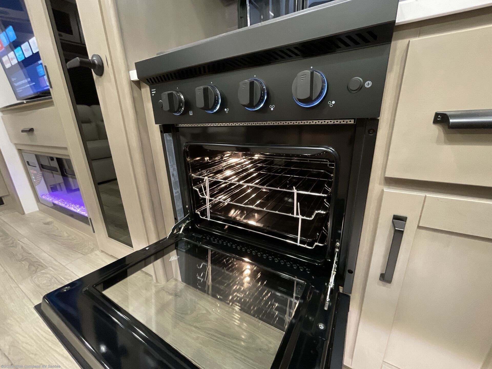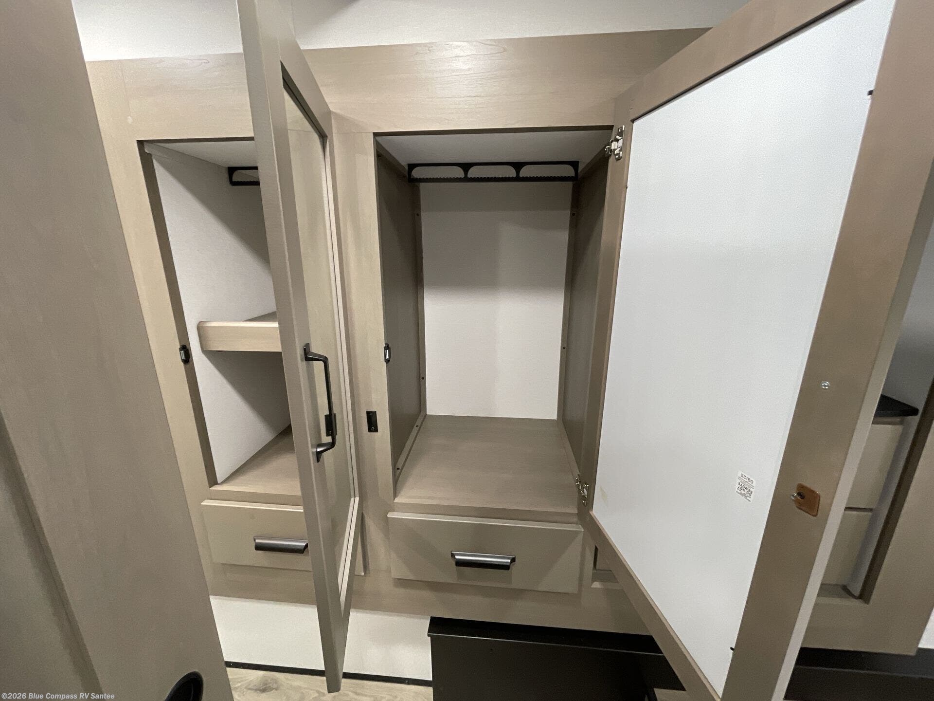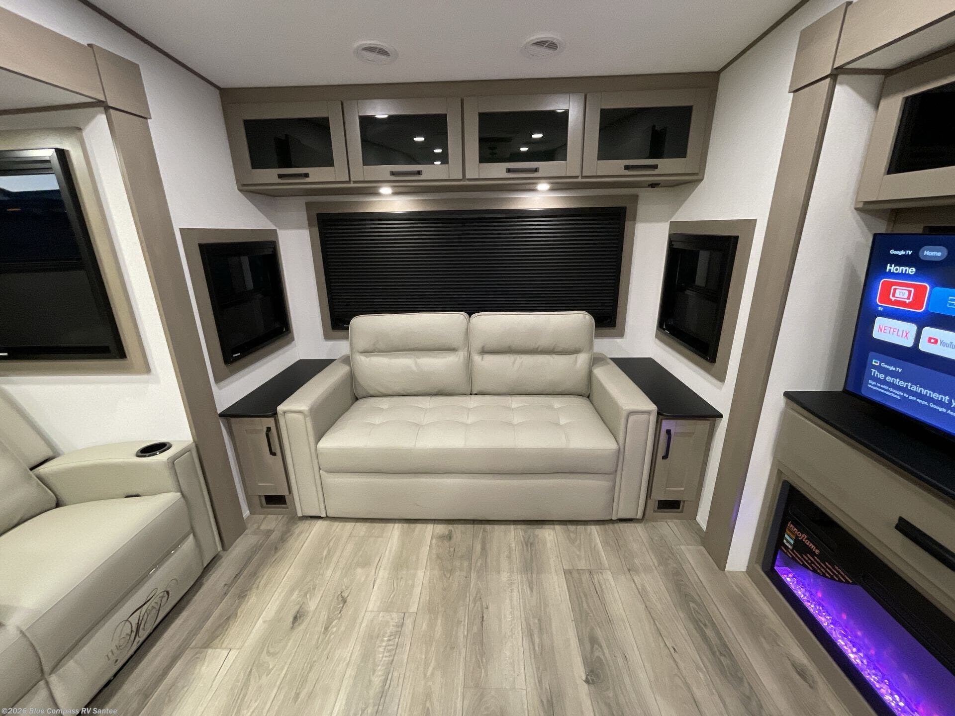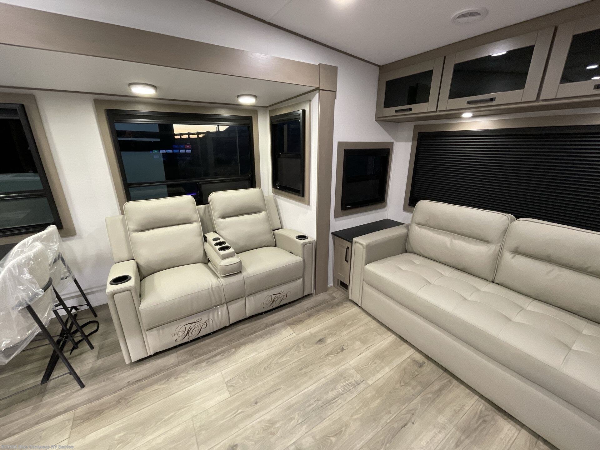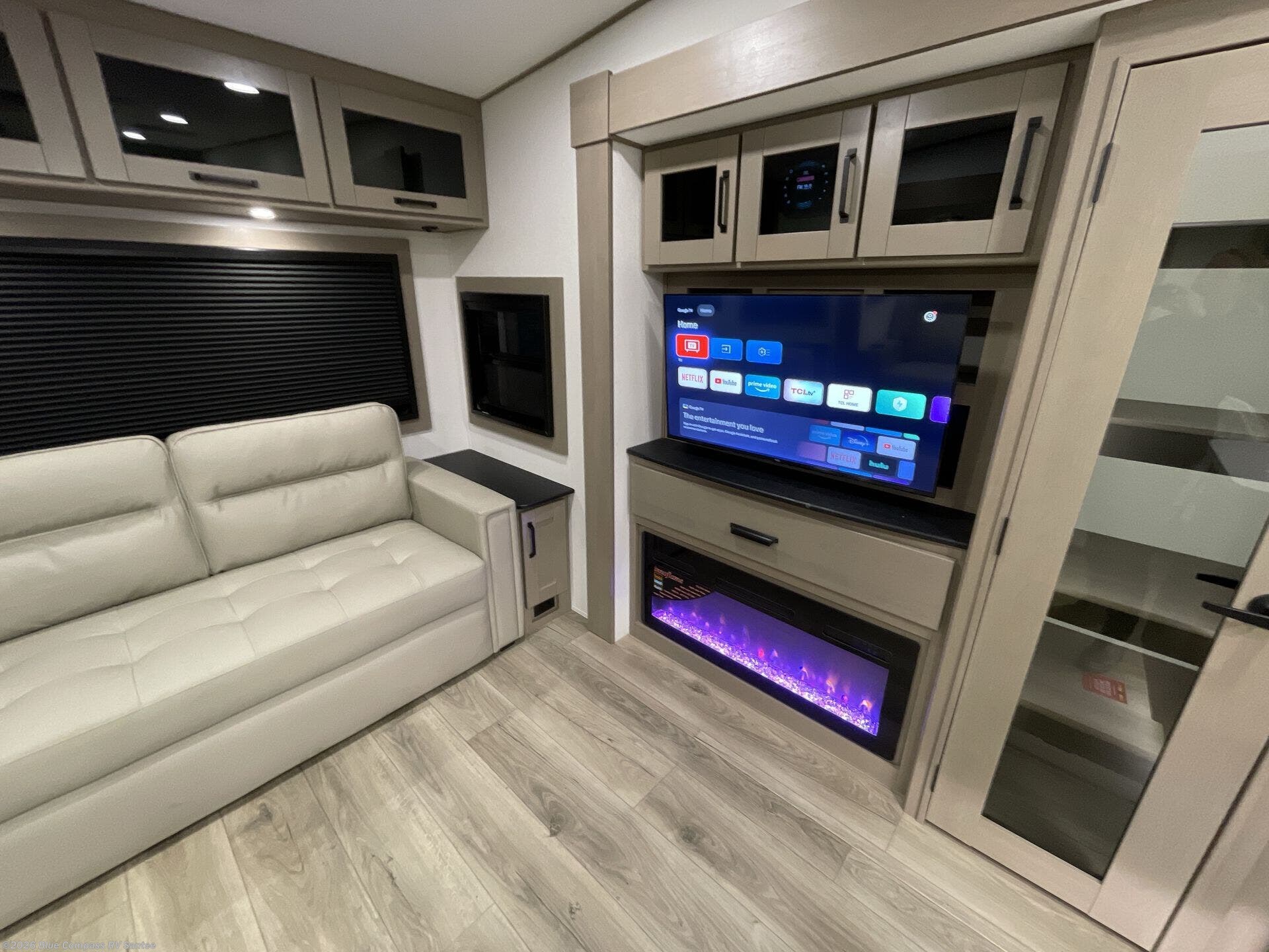 Whether you travel for pleasure or work, you will love the spacious main living and kitchen area with a rear tri-fold sofa that doubles as extra sleeping space, and the theater seating directly across from the entertainment center with a 40" LED HDTV and a fireplace below. The kitchen island will make meal prepping and drying the dishes easier and the hutch is the perfect place to place your picture frames, nice dishes, and extra cooking items. There is even a pantry that is big enough to store all of your favorite snacks, dry ingredients and such. Outside you can enjoy two electric awnings that provide protection from the elements as you relax and visit with other RVers, and your camping chairs can easily be stored in the pass-through compartment. The double entry bathroom is convenient especially at night when you can slide the door to enter from the front master bedroom. You will find plenty of storage for your clothing and gear, plus the bedroom slide out gives you drawers and linen storage that stretches into the full bathroom.