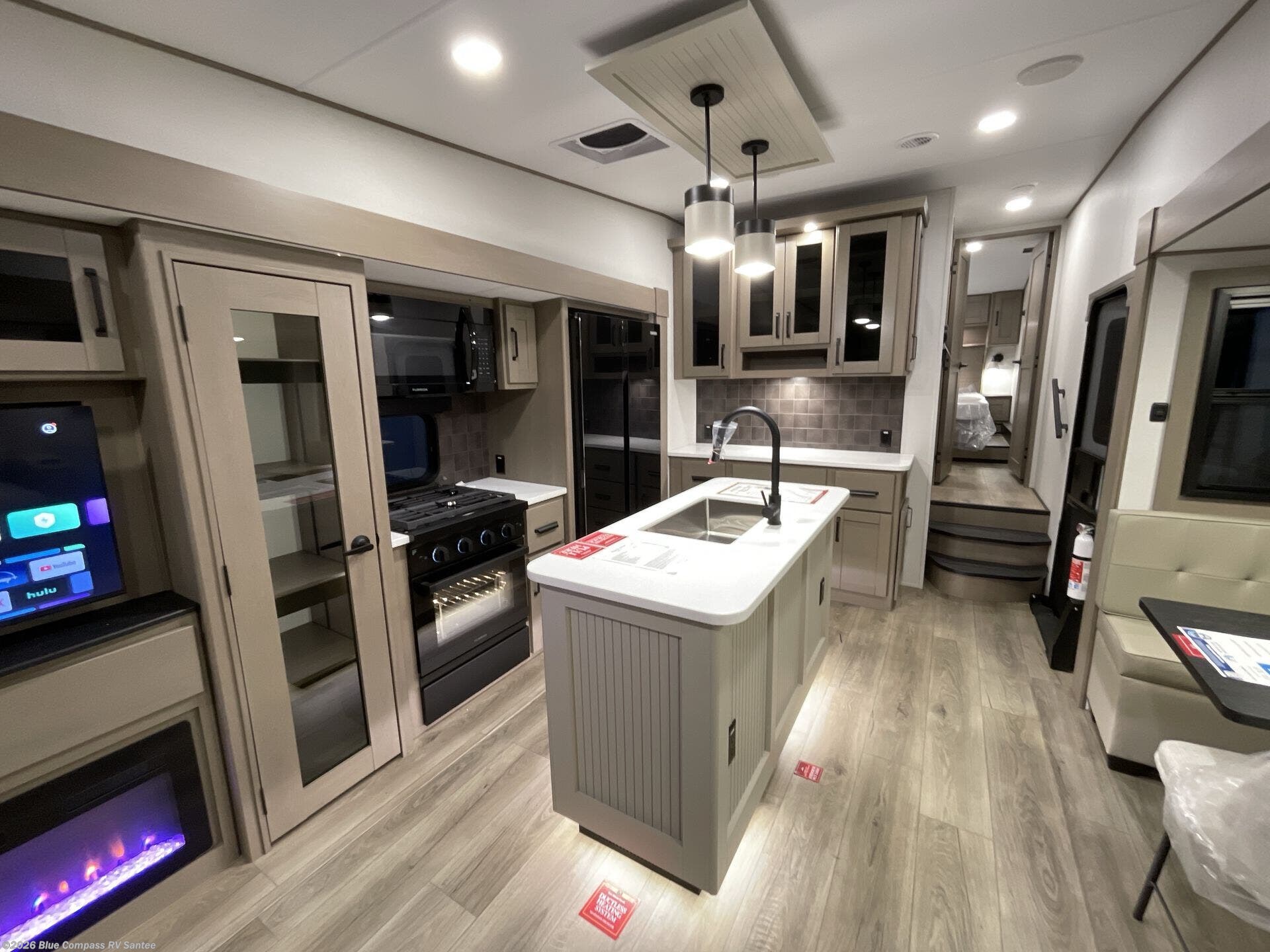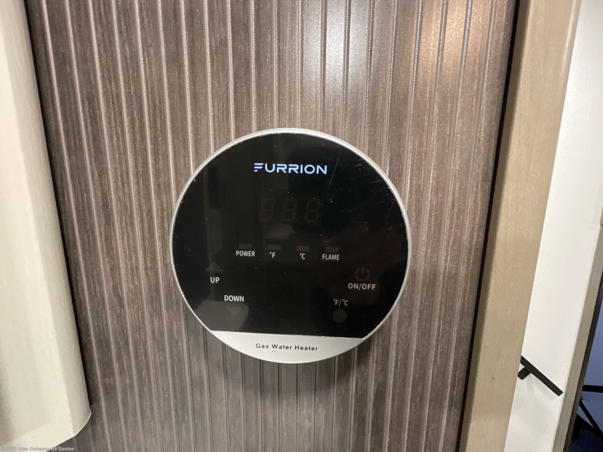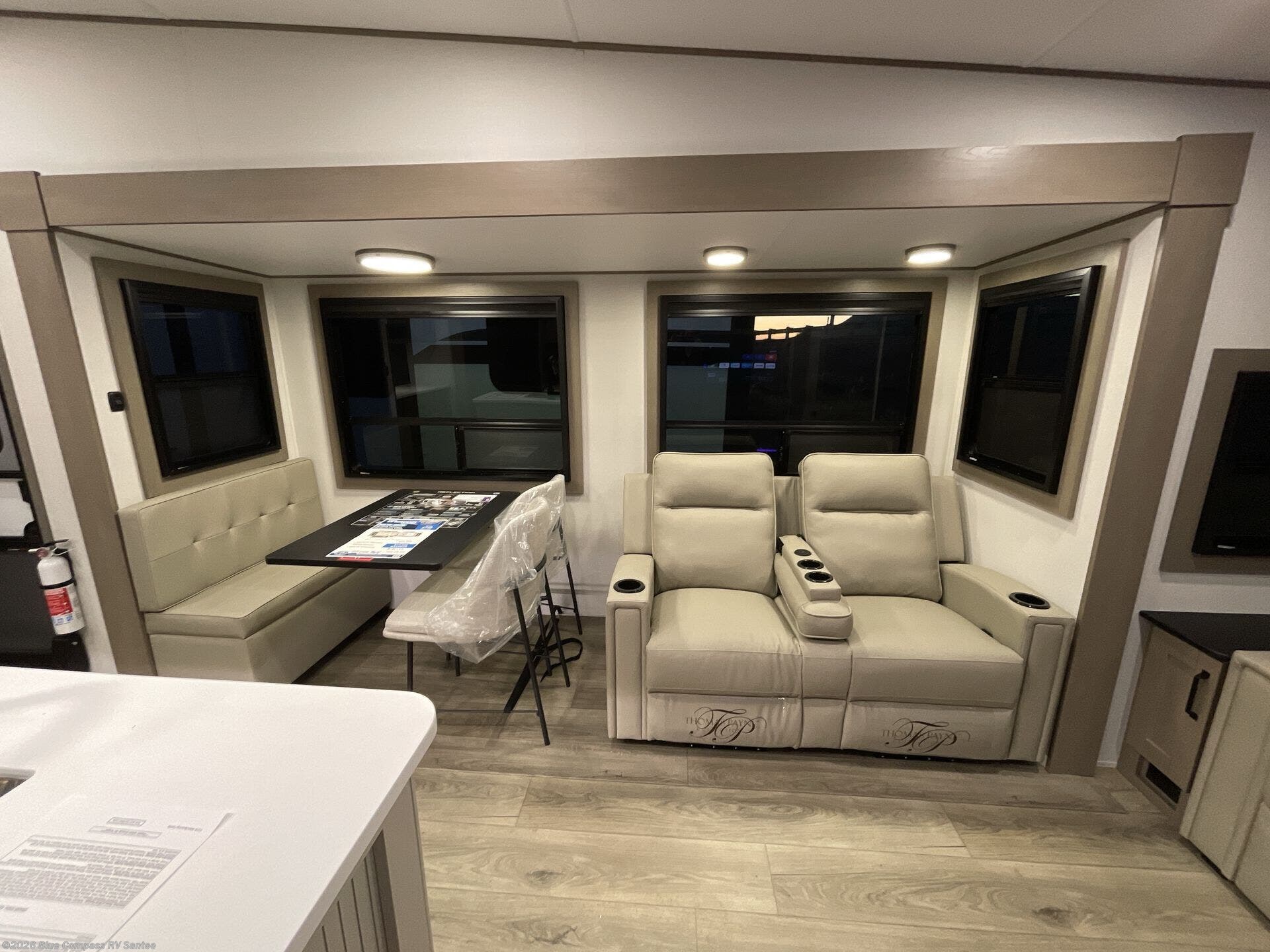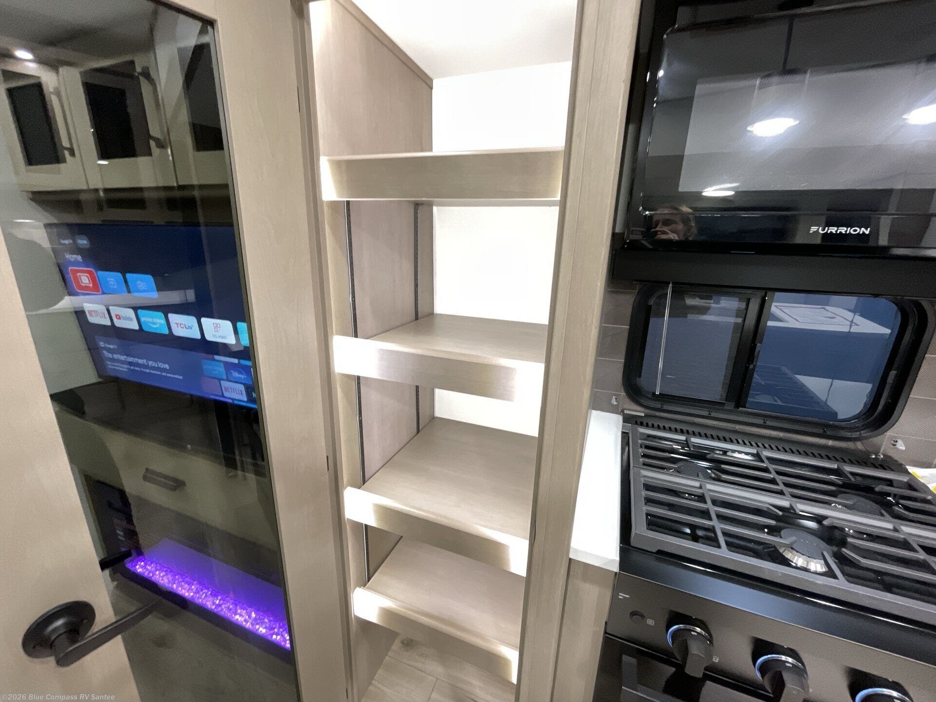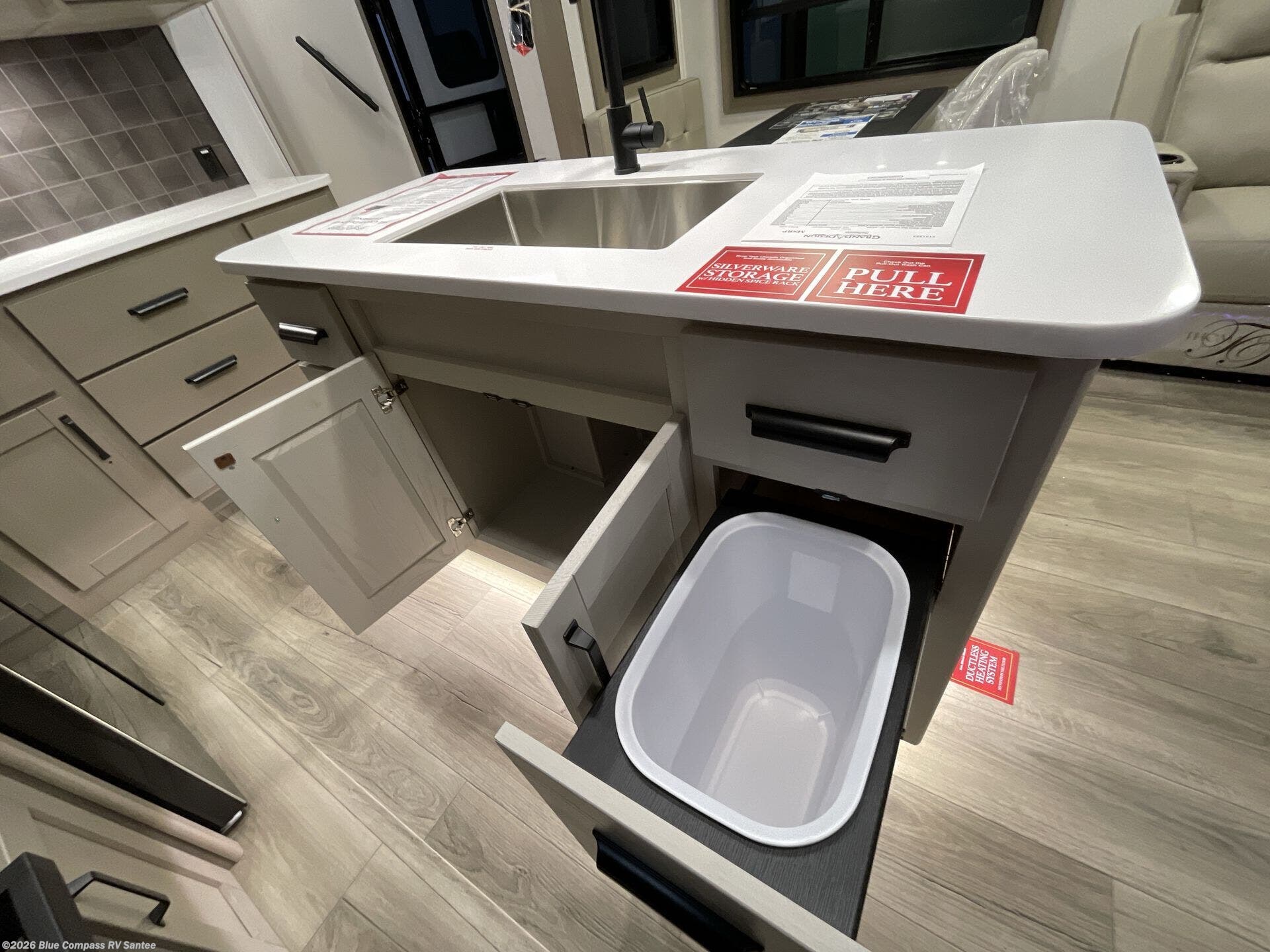 Whether you travel for pleasure or work, you will love the spacious main living and kitchen area with a rear tri-fold sofa that doubles as extra sleeping space, and the theater seating directly across from the entertainment center with a 40" LED HDTV and a fireplace below. The kitchen island will make meal prepping and drying the dishes easier and the hutch is the perfect place to place your picture frames, nice dishes, and extra cooking items. There is even a pantry that is big enough to store all of your favorite snacks, dry ingredients and such. Outside you can enjoy two electric awnings that provide protection from the elements as you relax and visit with other RVers, and your camping chairs can easily be stored in the pass-through compartment. The double entry bathroom is convenient especially at night when you can slide the door to enter from the front master bedroom. You will find plenty of storage for your clothing and gear, plus the bedroom slide out gives you drawers and linen storage that stretches into the full bathroom.