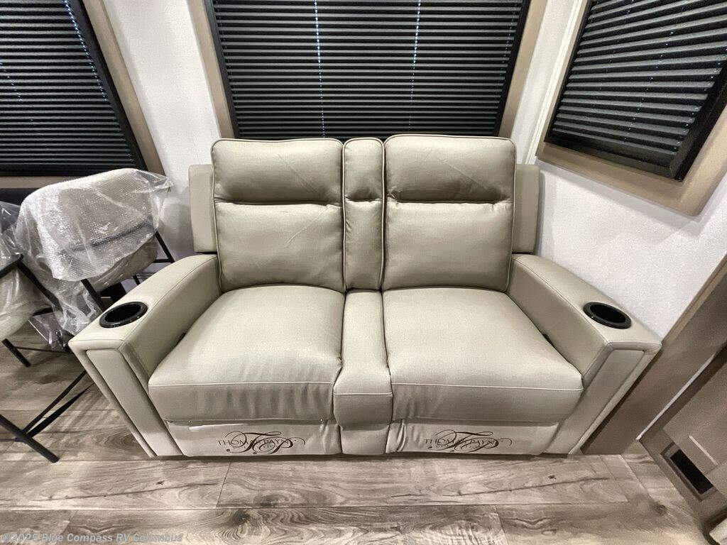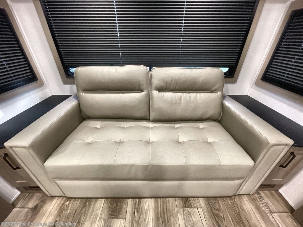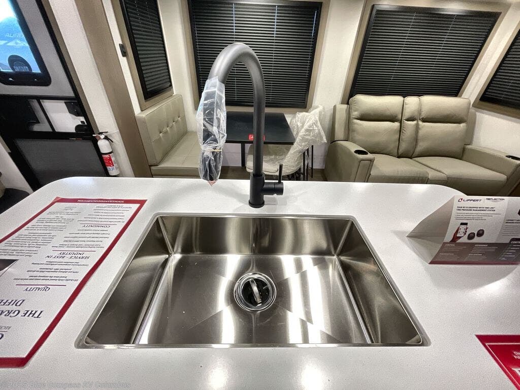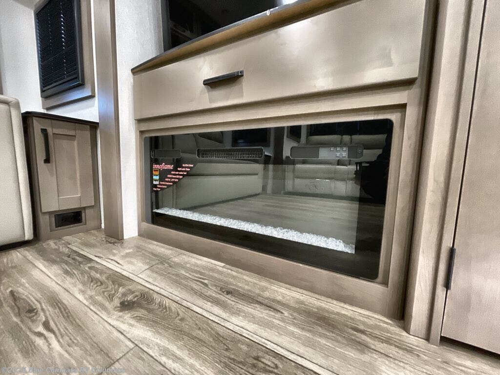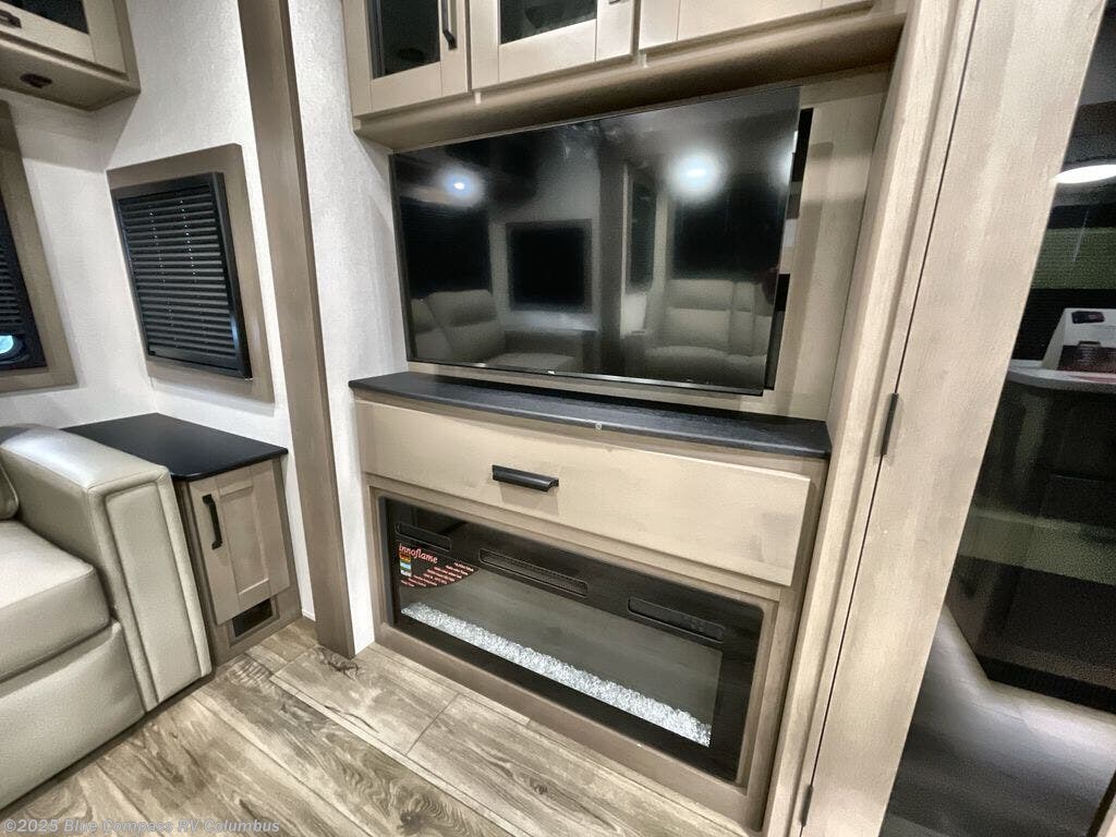 Whether you travel for pleasure or work, you will love the spacious main living and kitchen area with a rear tri-fold sofa that doubles as extra sleeping space, and the theater seating directly across from the entertainment center with a 40" LED HDTV and a fireplace below. The kitchen island will make meal prepping and drying the dishes easier and the hutch is the perfect place to place your picture frames, nice dishes, and extra cooking items. There is even a pantry that is big enough to store all of your favorite snacks, dry ingredients and such. Outside you can enjoy two electric awnings that provide protection from the elements as you relax and visit with other RVers, and your camping chairs can easily be stored in the pass-through compartment. The double entry bathroom is convenient especially at night when you can slide the door to enter from the front master bedroom. You will find plenty of storage for your clothing and gear, plus the bedroom slide out gives you drawers and linen storage that stretches into the full bathroom.