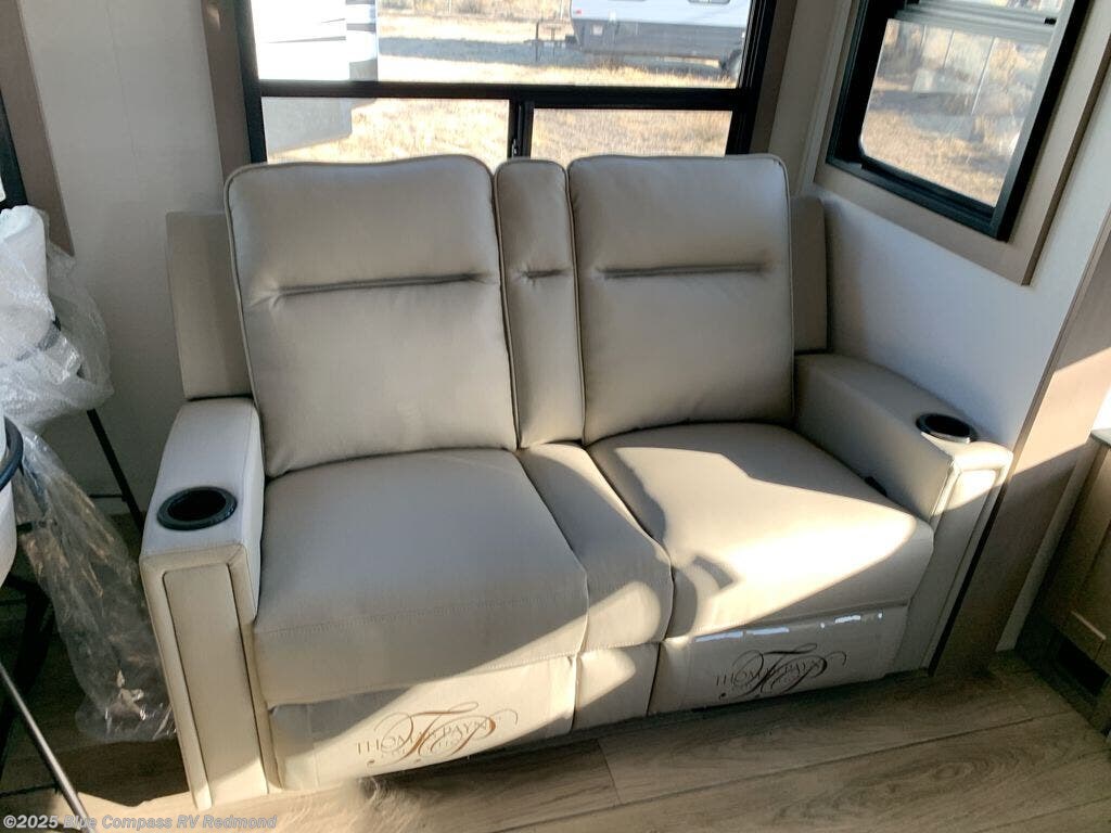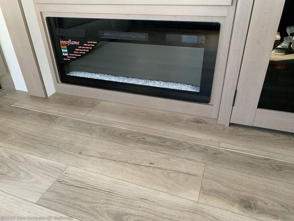 Whether you travel for pleasure or work, you will love the spacious main living and kitchen area with a rear tri-fold sofa that doubles as extra sleeping space, and the theater seating directly across from the entertainment center with a 40" LED HDTV and a fireplace below. The kitchen island will make meal prepping and drying the dishes easier and the hutch is the perfect place to place your picture frames, nice dishes, and extra cooking items. There is even a pantry that is big enough to store all of your favorite snacks, dry ingredients and such. Outside you can enjoy two electric awnings that provide protection from the elements as you relax and visit with other RVers, and your camping chairs can easily be stored in the pass-through compartment. The double entry bathroom is convenient especially at night when you can slide the door to enter from the front master bedroom. You will find plenty of storage for your clothing and gear, plus the bedroom slide out gives you drawers and linen storage that stretches into the full bathroom.