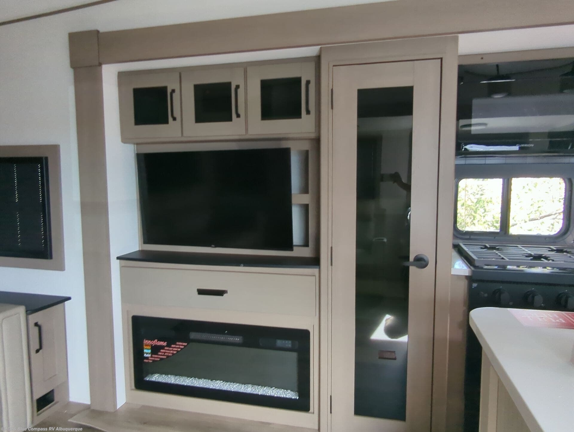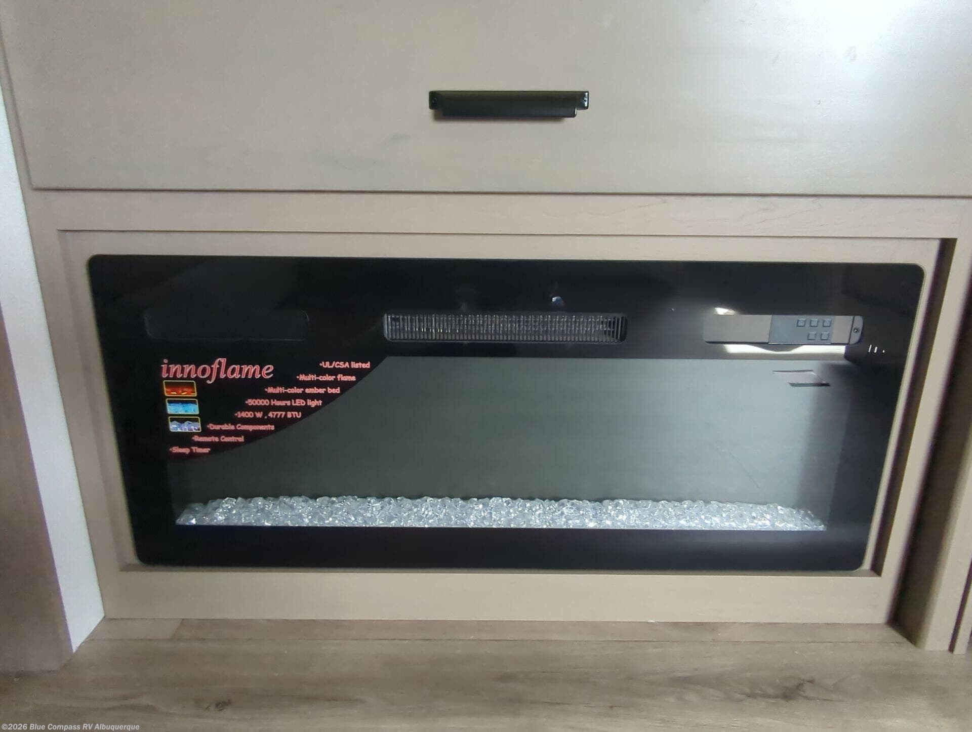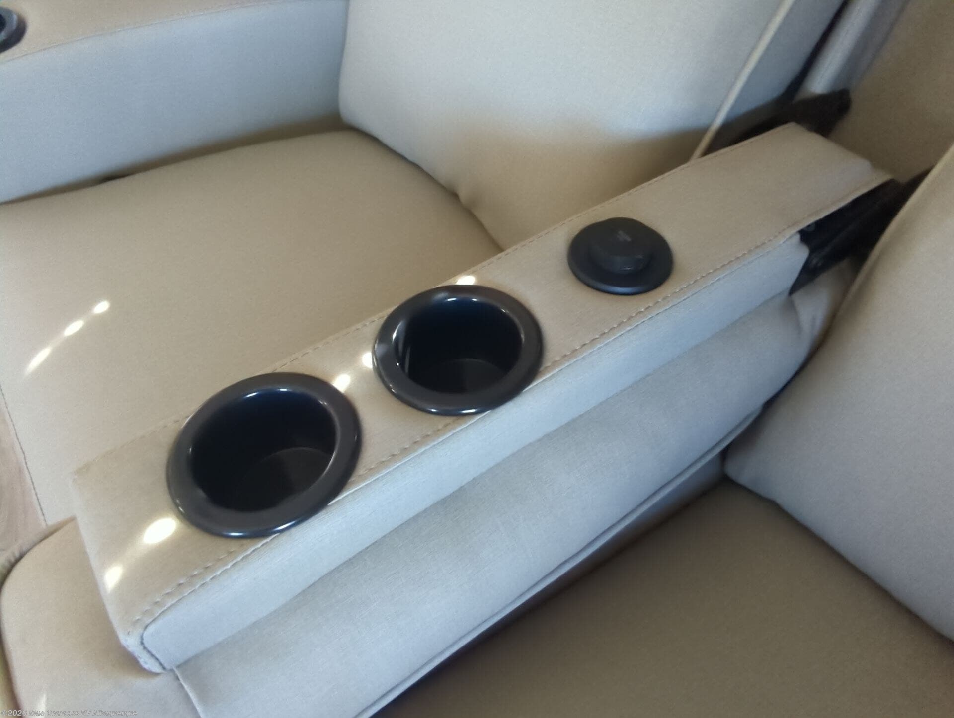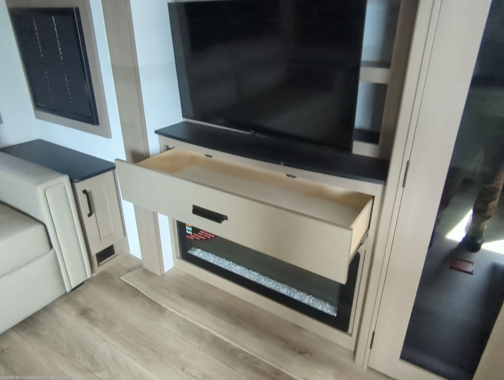 Whether you travel for pleasure or work, you will love the spacious main living and kitchen area with a rear tri-fold sofa that doubles as extra sleeping space, and the theater seating directly across from the entertainment center with a 40" LED HDTV and a fireplace below. The kitchen island will make meal prepping and drying the dishes easier and the hutch is the perfect place to place your picture frames, nice dishes, and extra cooking items. There is even a pantry that is big enough to store all of your favorite snacks, dry ingredients and such. Outside you can enjoy two electric awnings that provide protection from the elements as you relax and visit with other RVers, and your camping chairs can easily be stored in the pass-through compartment. The double entry bathroom is convenient especially at night when you can slide the door to enter from the front master bedroom. You will find plenty of storage for your clothing and gear, plus the bedroom slide out gives you drawers and linen storage that stretches into the full bathroom.