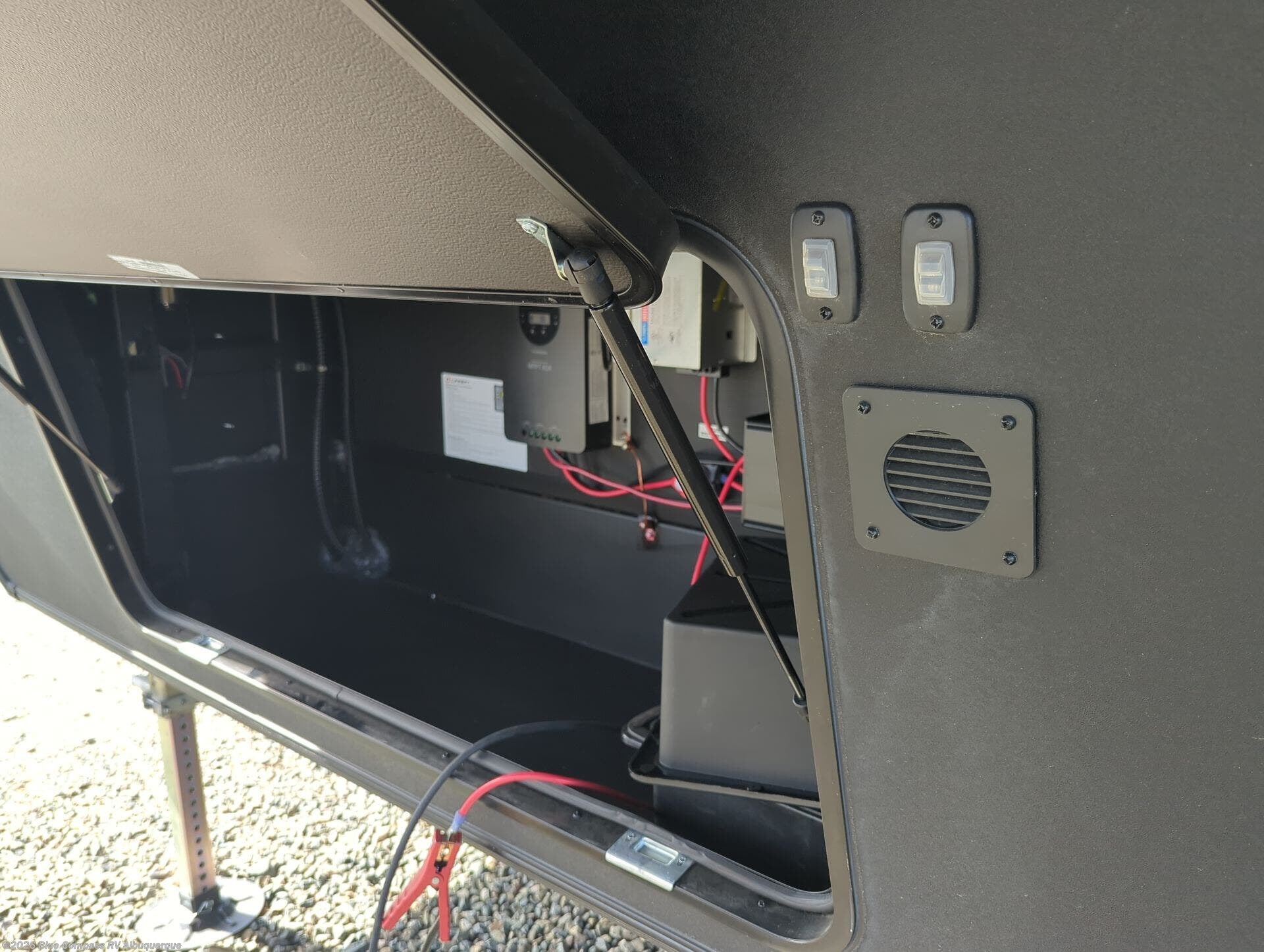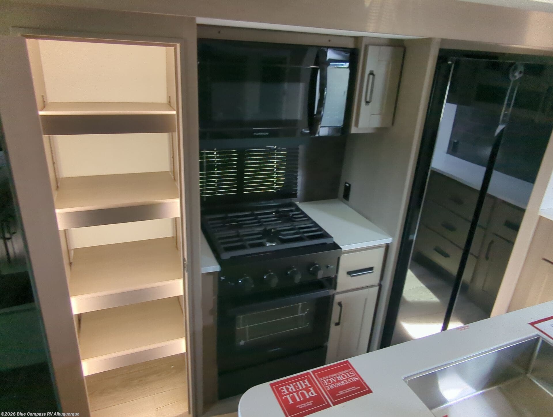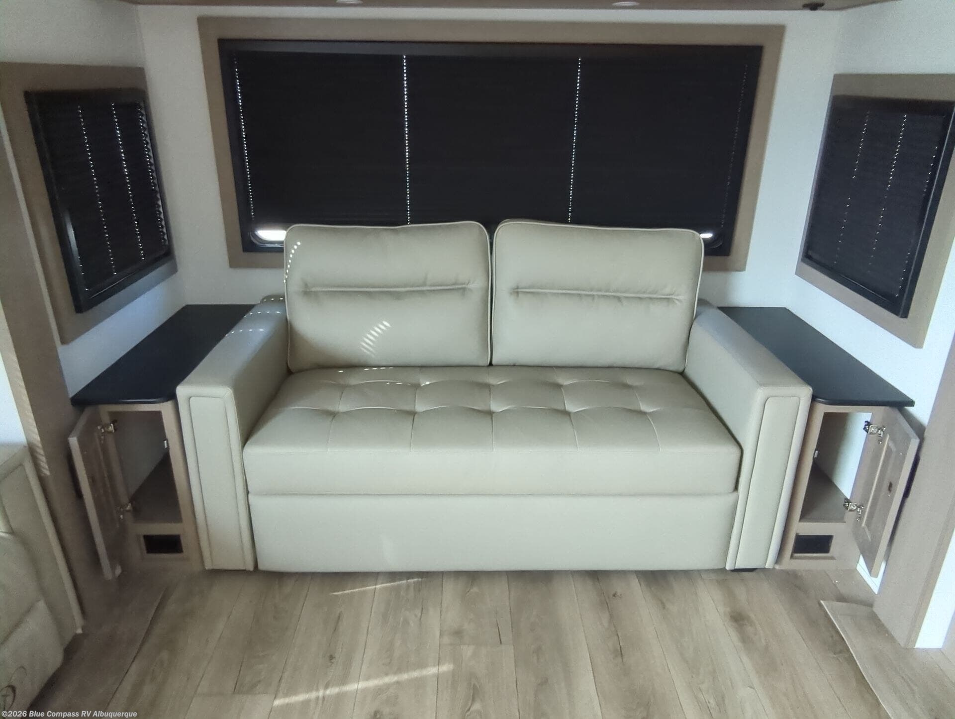 Whether you travel for pleasure or work, you will love the spacious main living and kitchen area with a rear tri-fold sofa that doubles as extra sleeping space, and the theater seating directly across from the entertainment center with a 40" LED HDTV and a fireplace below. The kitchen island will make meal prepping and drying the dishes easier and the hutch is the perfect place to place your picture frames, nice dishes, and extra cooking items. There is even a pantry that is big enough to store all of your favorite snacks, dry ingredients and such. Outside you can enjoy two electric awnings that provide protection from the elements as you relax and visit with other RVers, and your camping chairs can easily be stored in the pass-through compartment. The double entry bathroom is convenient especially at night when you can slide the door to enter from the front master bedroom. You will find plenty of storage for your clothing and gear, plus the bedroom slide out gives you drawers and linen storage that stretches into the full bathroom.