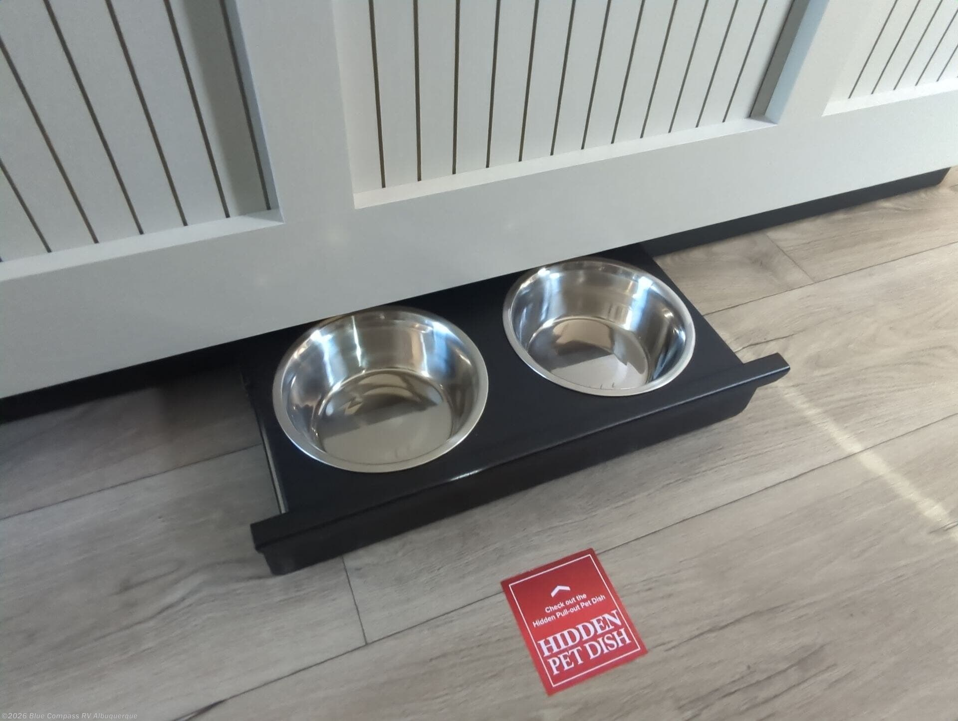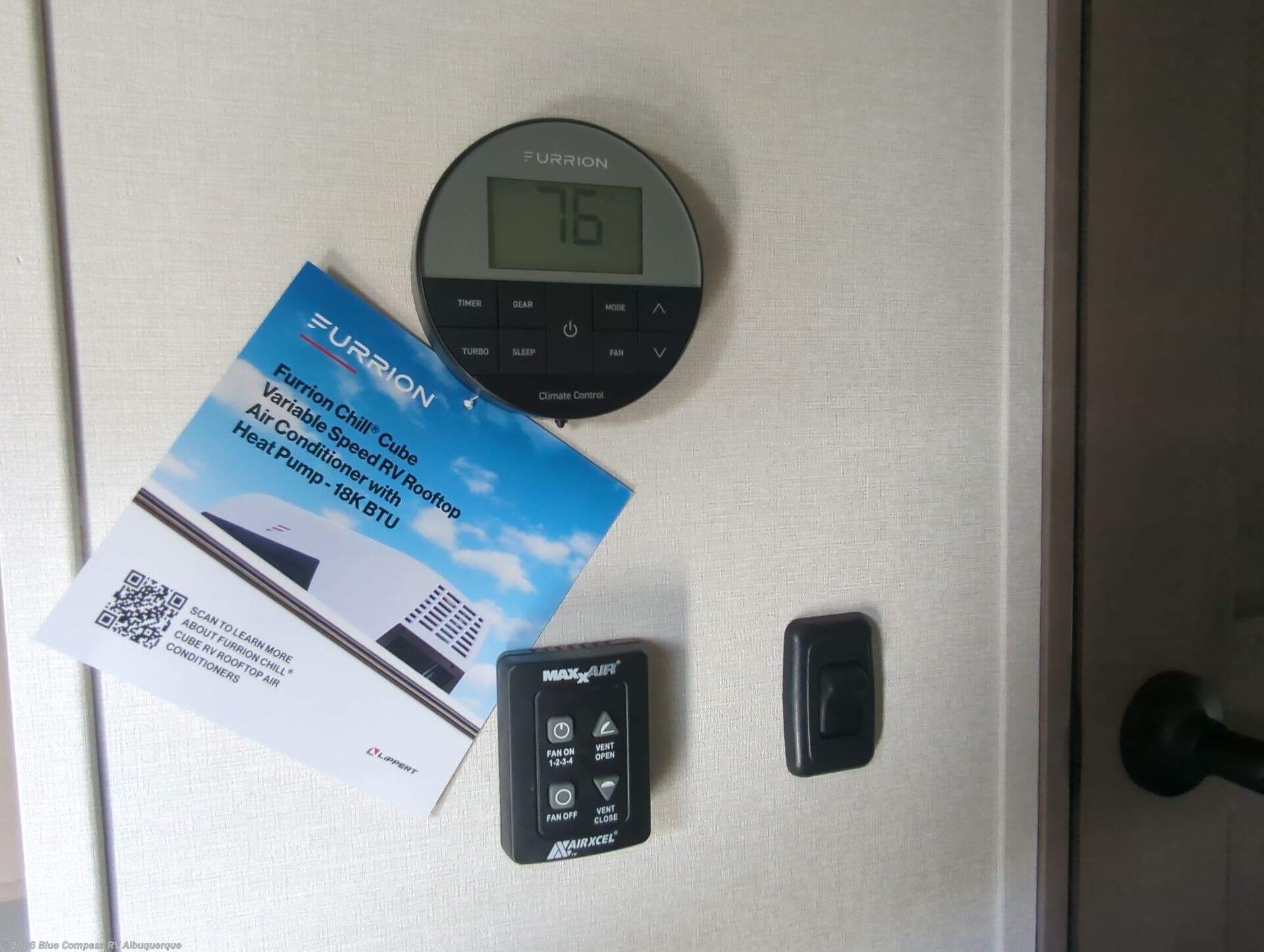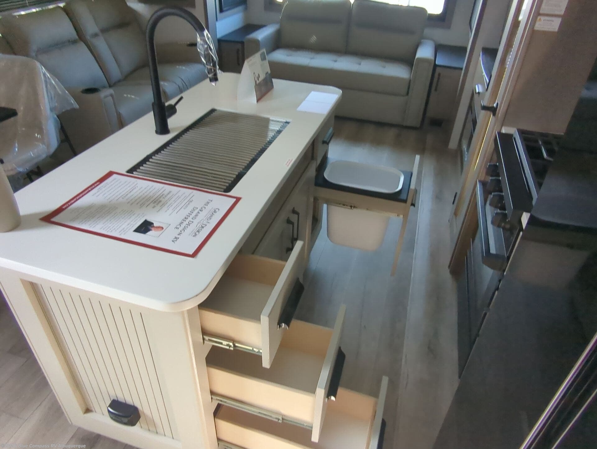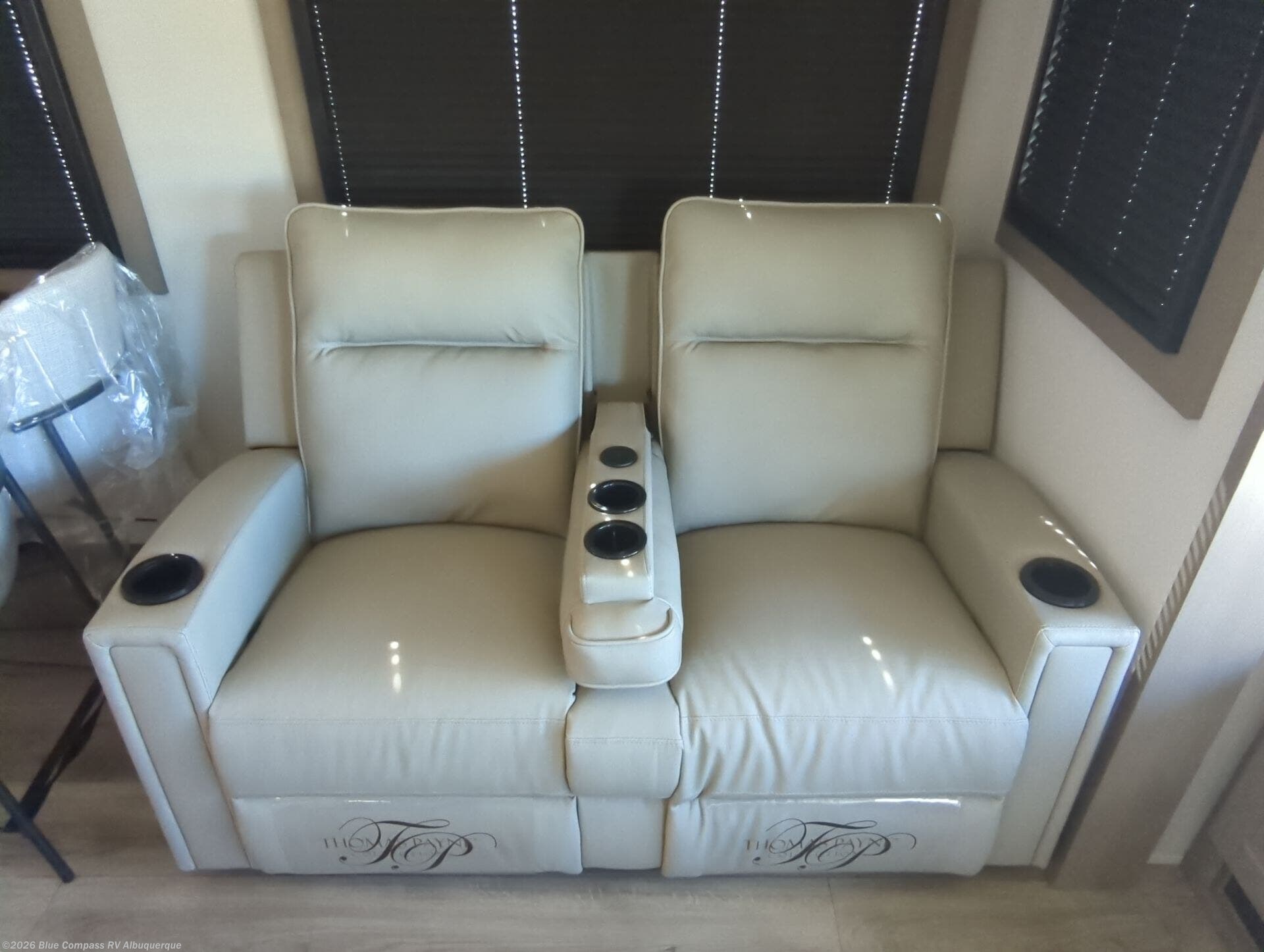 Whether you travel for pleasure or work, you will love the spacious main living and kitchen area with a rear tri-fold sofa that doubles as extra sleeping space, and the theater seating directly across from the entertainment center with a 40" LED HDTV and a fireplace below. The kitchen island will make meal prepping and drying the dishes easier and the hutch is the perfect place to place your picture frames, nice dishes, and extra cooking items. There is even a pantry that is big enough to store all of your favorite snacks, dry ingredients and such. Outside you can enjoy two electric awnings that provide protection from the elements as you relax and visit with other RVers, and your camping chairs can easily be stored in the pass-through compartment. The double entry bathroom is convenient especially at night when you can slide the door to enter from the front master bedroom. You will find plenty of storage for your clothing and gear, plus the bedroom slide out gives you drawers and linen storage that stretches into the full bathroom.