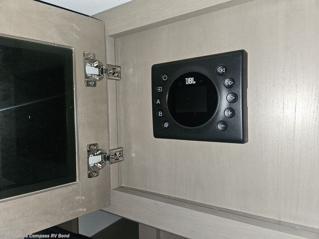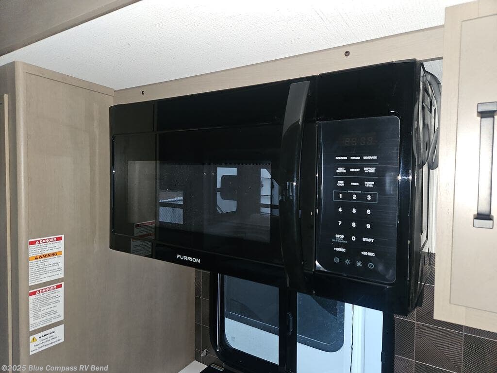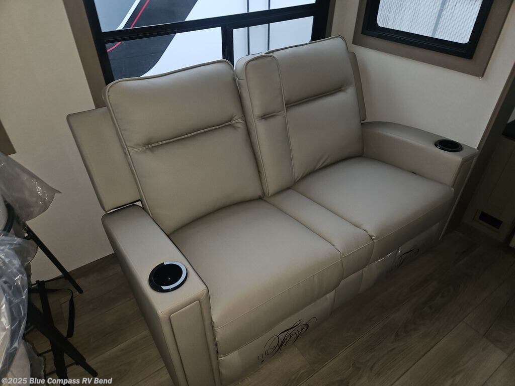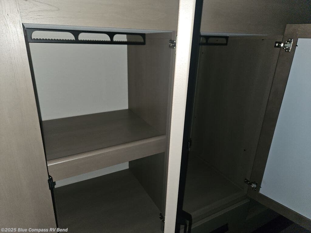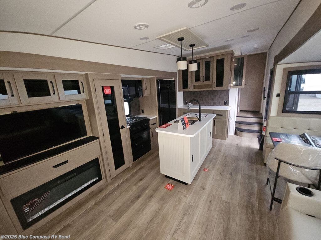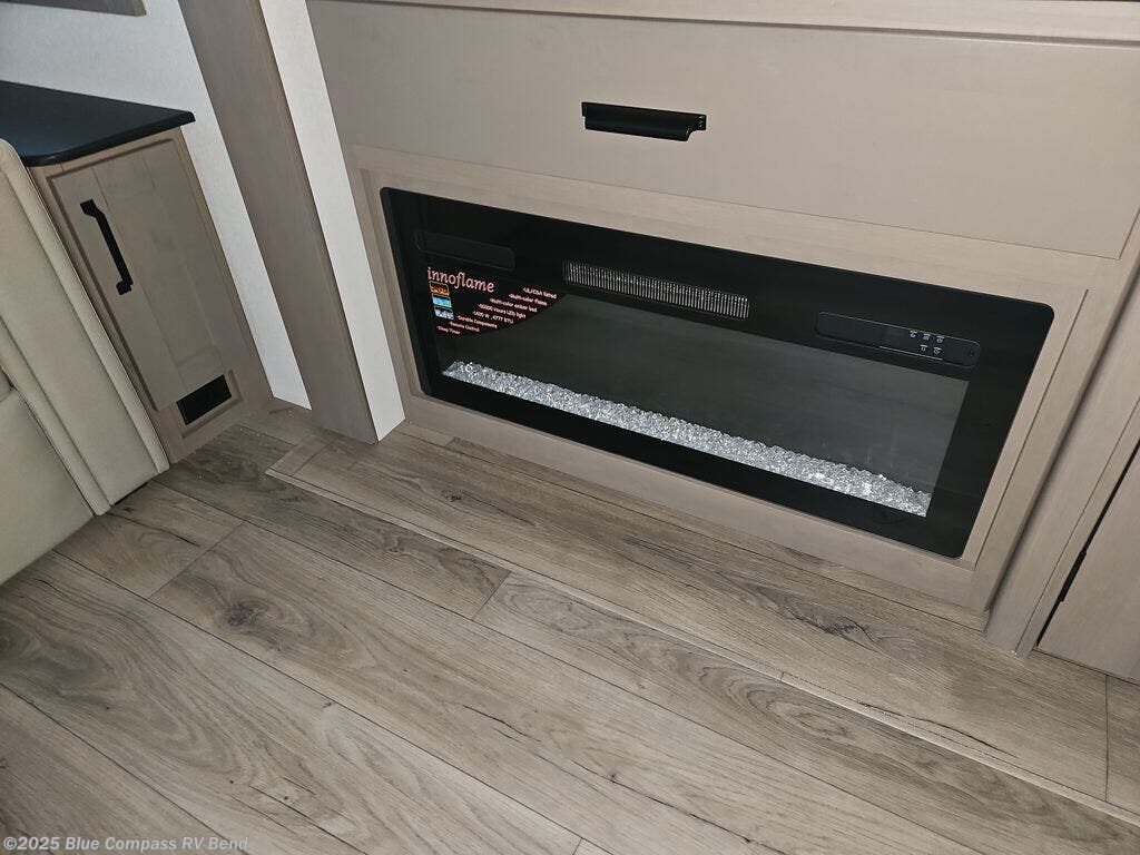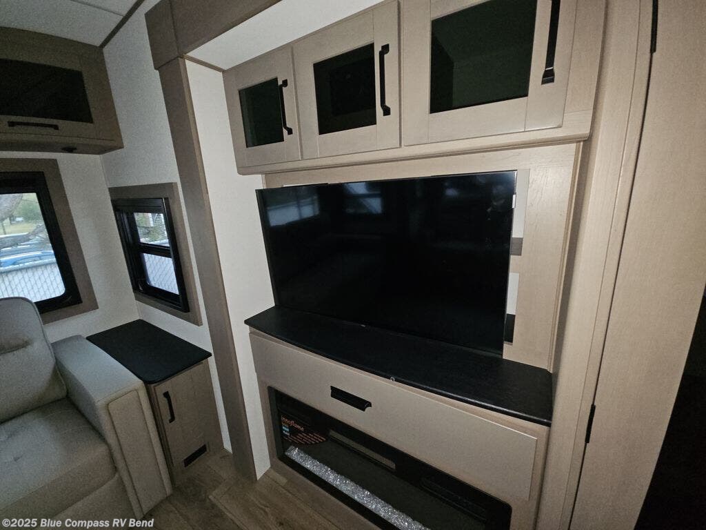 Whether you travel for pleasure or work, you will love the spacious main living and kitchen area with a rear tri-fold sofa that doubles as extra sleeping space, and the theater seating directly across from the entertainment center with a 40" LED HDTV and a fireplace below. The kitchen island will make meal prepping and drying the dishes easier and the hutch is the perfect place to place your picture frames, nice dishes, and extra cooking items. There is even a pantry that is big enough to store all of your favorite snacks, dry ingredients and such. Outside you can enjoy two electric awnings that provide protection from the elements as you relax and visit with other RVers, and your camping chairs can easily be stored in the pass-through compartment. The double entry bathroom is convenient especially at night when you can slide the door to enter from the front master bedroom. You will find plenty of storage for your clothing and gear, plus the bedroom slide out gives you drawers and linen storage that stretches into the full bathroom.