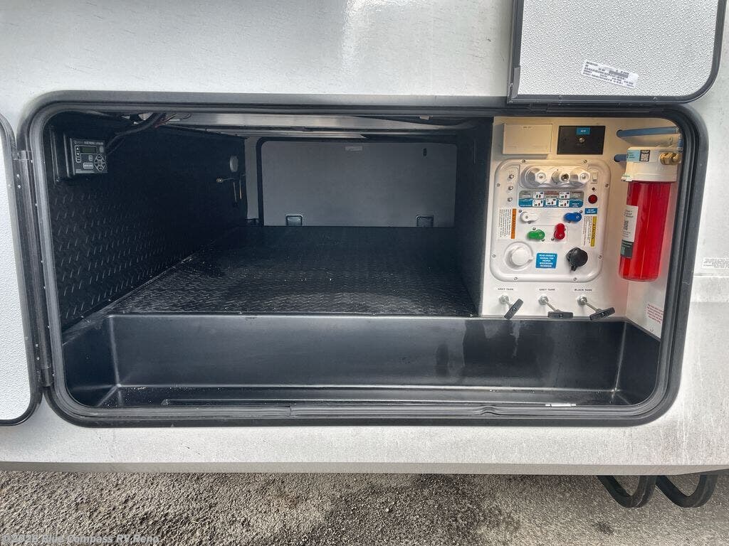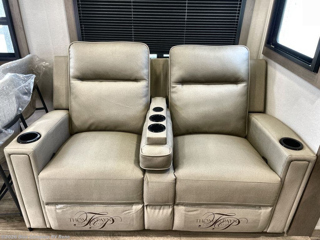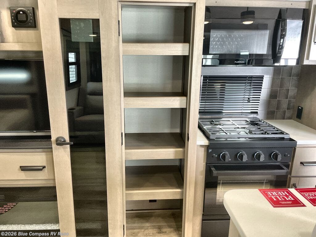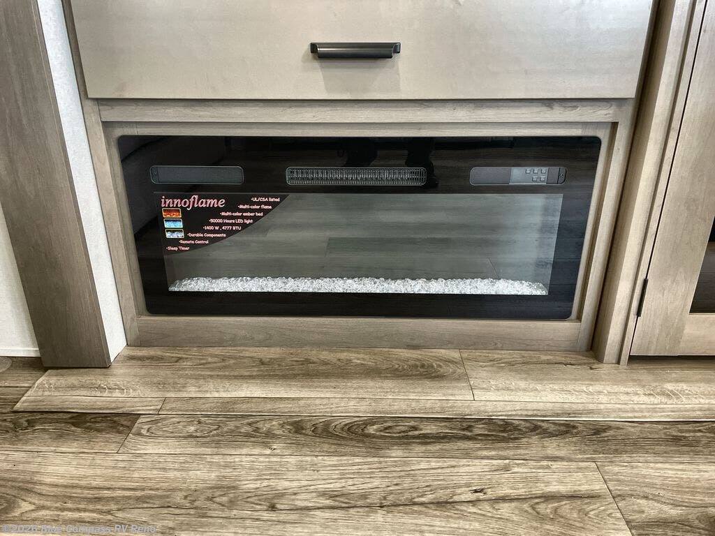 Whether you travel for pleasure or work, you will love the spacious main living and kitchen area with a rear tri-fold sofa that doubles as extra sleeping space, and the theater seating directly across from the entertainment center with a 40" LED HDTV and a fireplace below. The kitchen island will make meal prepping and drying the dishes easier and the hutch is the perfect place to place your picture frames, nice dishes, and extra cooking items. There is even a pantry that is big enough to store all of your favorite snacks, dry ingredients and such. Outside you can enjoy two electric awnings that provide protection from the elements as you relax and visit with other RVers, and your camping chairs can easily be stored in the pass-through compartment. The double entry bathroom is convenient especially at night when you can slide the door to enter from the front master bedroom. You will find plenty of storage for your clothing and gear, plus the bedroom slide out gives you drawers and linen storage that stretches into the full bathroom.