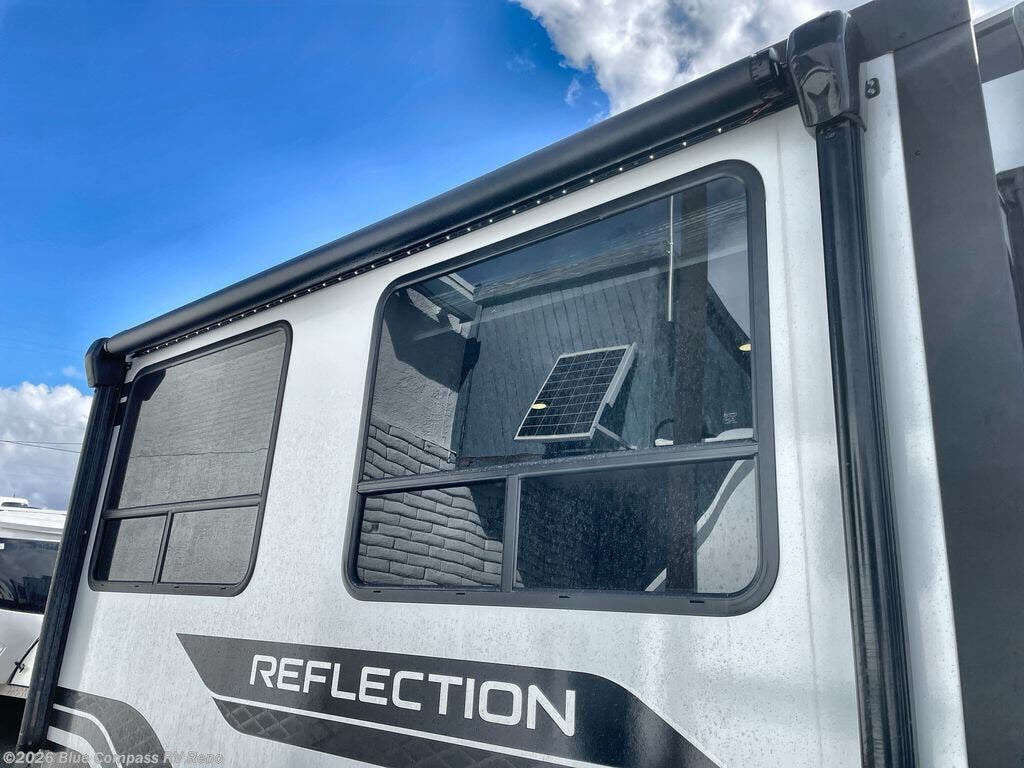 With any Reflection fifth wheel by Grand Design, you will have a solar panel for off-grid camping and a 60 amp charge controller and inverter prep, a Universal All-In-One docking station, unobstructed pass-through storage, and Goodyear Endurance tires. Each is constructed of gel coat exterior sidewalls, residential 5" truss rafters, walk-on roof decking, a fiberglass and radiant foil roof and front cap insulation plus laminated aluminum framed side walls, roof and end walls in slide rooms. Head inside to enjoy residential hardwood cabinet doors, premium Congoleum flooring, a spacious shower with a glass door, and many more comforts!