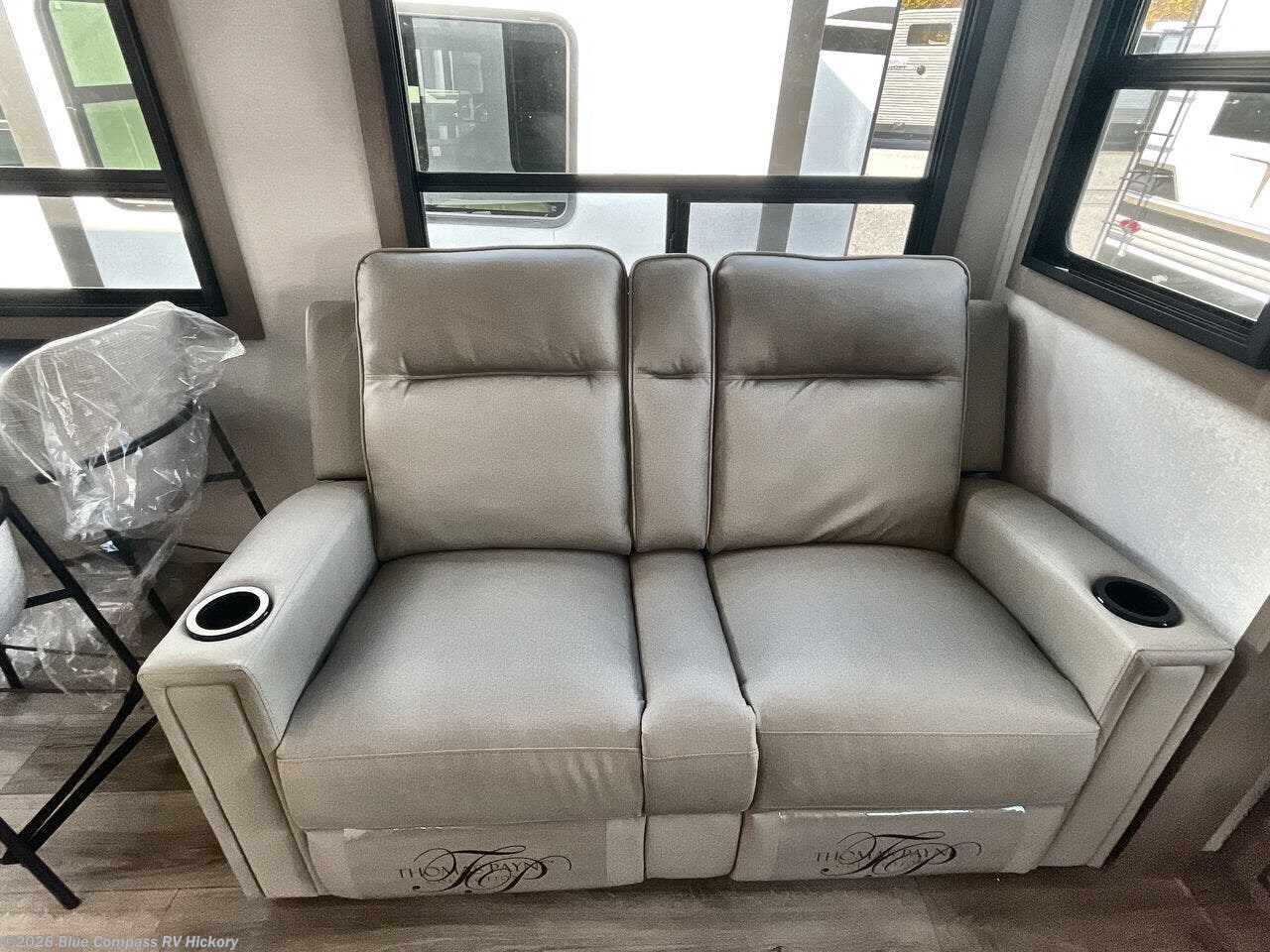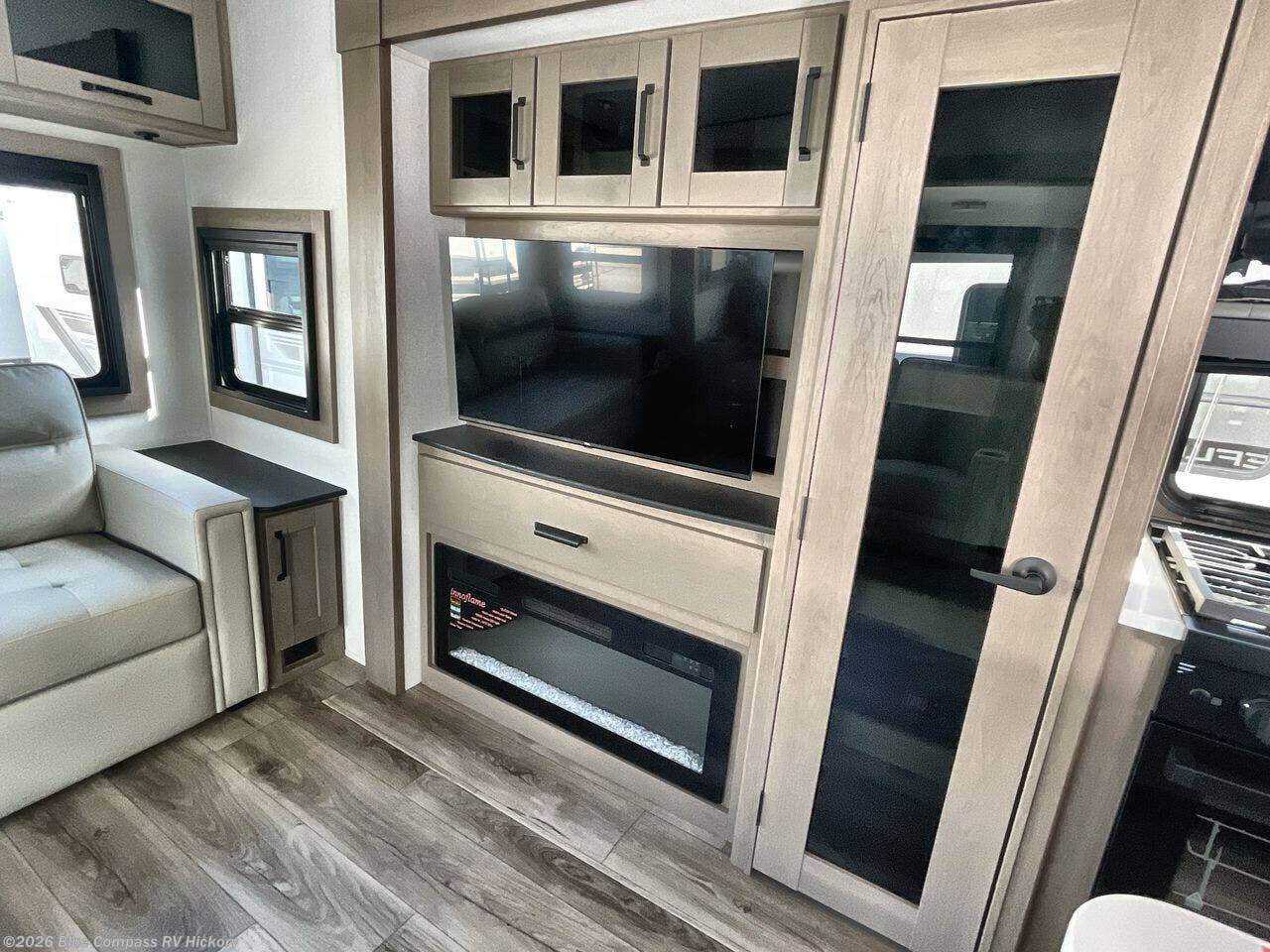 Whether you travel for pleasure or work, you will love the spacious main living and kitchen area with a rear tri-fold sofa that doubles as extra sleeping space, and the theater seating directly across from the entertainment center with a 40" LED HDTV and a fireplace below. The kitchen island will make meal prepping and drying the dishes easier and the hutch is the perfect place to place your picture frames, nice dishes, and extra cooking items. There is even a pantry that is big enough to store all of your favorite snacks, dry ingredients and such. Outside you can enjoy two electric awnings that provide protection from the elements as you relax and visit with other RVers, and your camping chairs can easily be stored in the pass-through compartment. The double entry bathroom is convenient especially at night when you can slide the door to enter from the front master bedroom. You will find plenty of storage for your clothing and gear, plus the bedroom slide out gives you drawers and linen storage that stretches into the full bathroom.