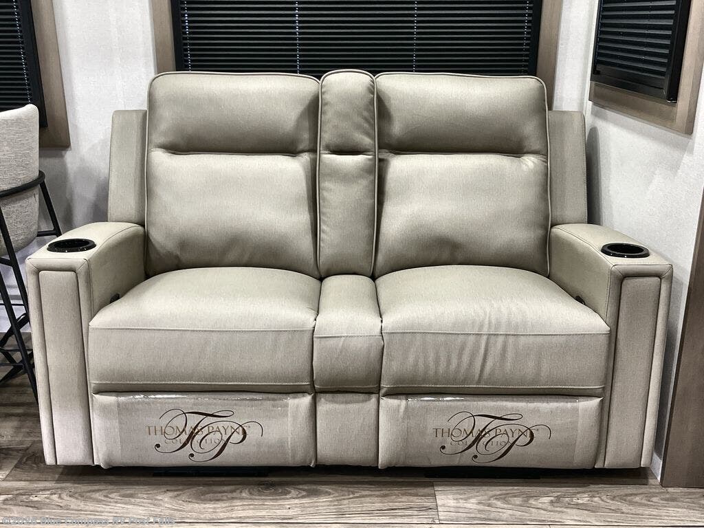 Whether you travel for pleasure or work, you will love the spacious main living and kitchen area with a rear tri-fold sofa that doubles as extra sleeping space, and the theater seating directly across from the entertainment center with a 40" LED HDTV and a fireplace below. The kitchen island will make meal prepping and drying the dishes easier and the hutch is the perfect place to place your picture frames, nice dishes, and extra cooking items. There is even a pantry that is big enough to store all of your favorite snacks, dry ingredients and such. Outside you can enjoy two electric awnings that provide protection from the elements as you relax and visit with other RVers, and your camping chairs can easily be stored in the pass-through compartment. The double entry bathroom is convenient especially at night when you can slide the door to enter from the front master bedroom. You will find plenty of storage for your clothing and gear, plus the bedroom slide out gives you drawers and linen storage that stretches into the full bathroom.