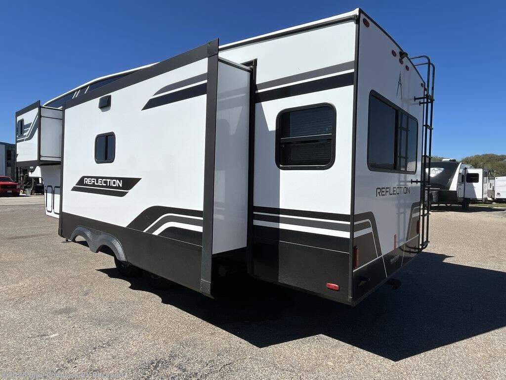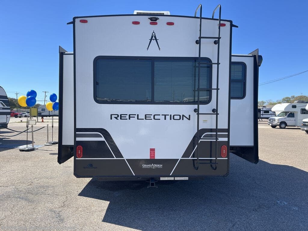 With any Reflection fifth wheel by Grand Design, you will have a solar panel for off-grid camping and a 60 amp charge controller and inverter prep, a Universal All-In-One docking station, unobstructed pass-through storage, and Goodyear Endurance tires. Each is constructed of gel coat exterior sidewalls, residential 5" truss rafters, walk-on roof decking, a fiberglass and radiant foil roof and front cap insulation plus laminated aluminum framed side walls, roof and end walls in slide rooms. Head inside to enjoy residential hardwood cabinet doors, premium Congoleum flooring, a spacious shower with a glass door, and many more comforts!