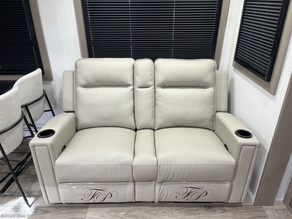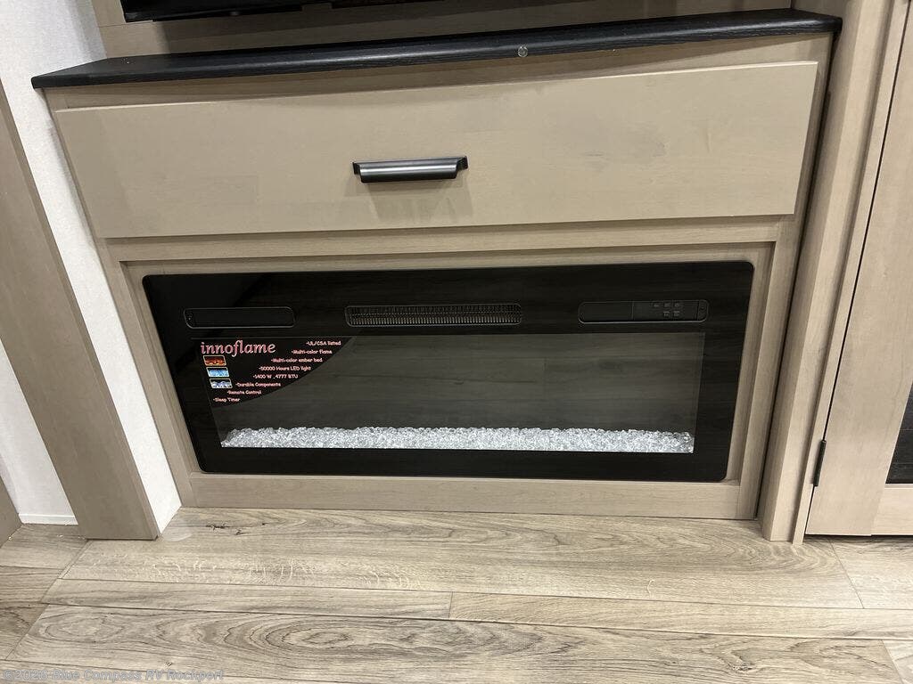 Whether you travel for pleasure or work, you will love the spacious main living and kitchen area with a rear tri-fold sofa that doubles as extra sleeping space, and the theater seating directly across from the entertainment center with a 40" LED HDTV and a fireplace below. The kitchen island will make meal prepping and drying the dishes easier and the hutch is the perfect place to place your picture frames, nice dishes, and extra cooking items. There is even a pantry that is big enough to store all of your favorite snacks, dry ingredients and such. Outside you can enjoy two electric awnings that provide protection from the elements as you relax and visit with other RVers, and your camping chairs can easily be stored in the pass-through compartment. The double entry bathroom is convenient especially at night when you can slide the door to enter from the front master bedroom. You will find plenty of storage for your clothing and gear, plus the bedroom slide out gives you drawers and linen storage that stretches into the full bathroom.