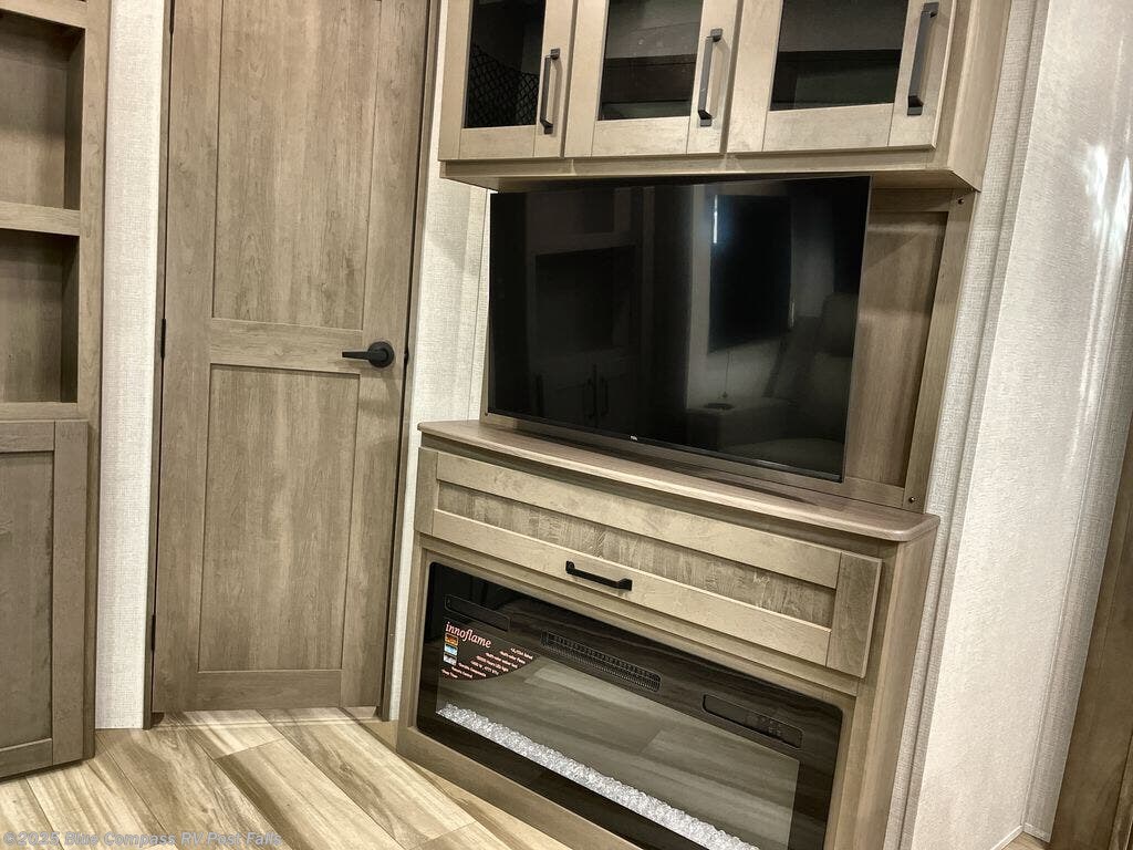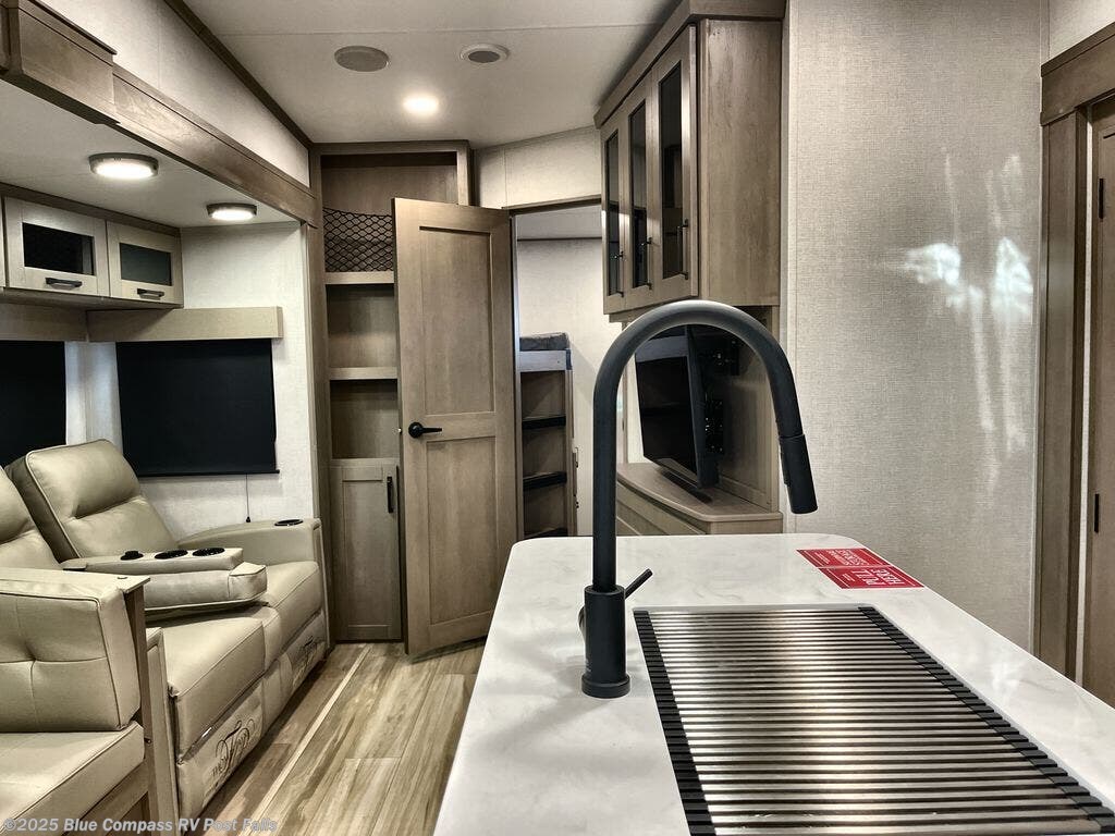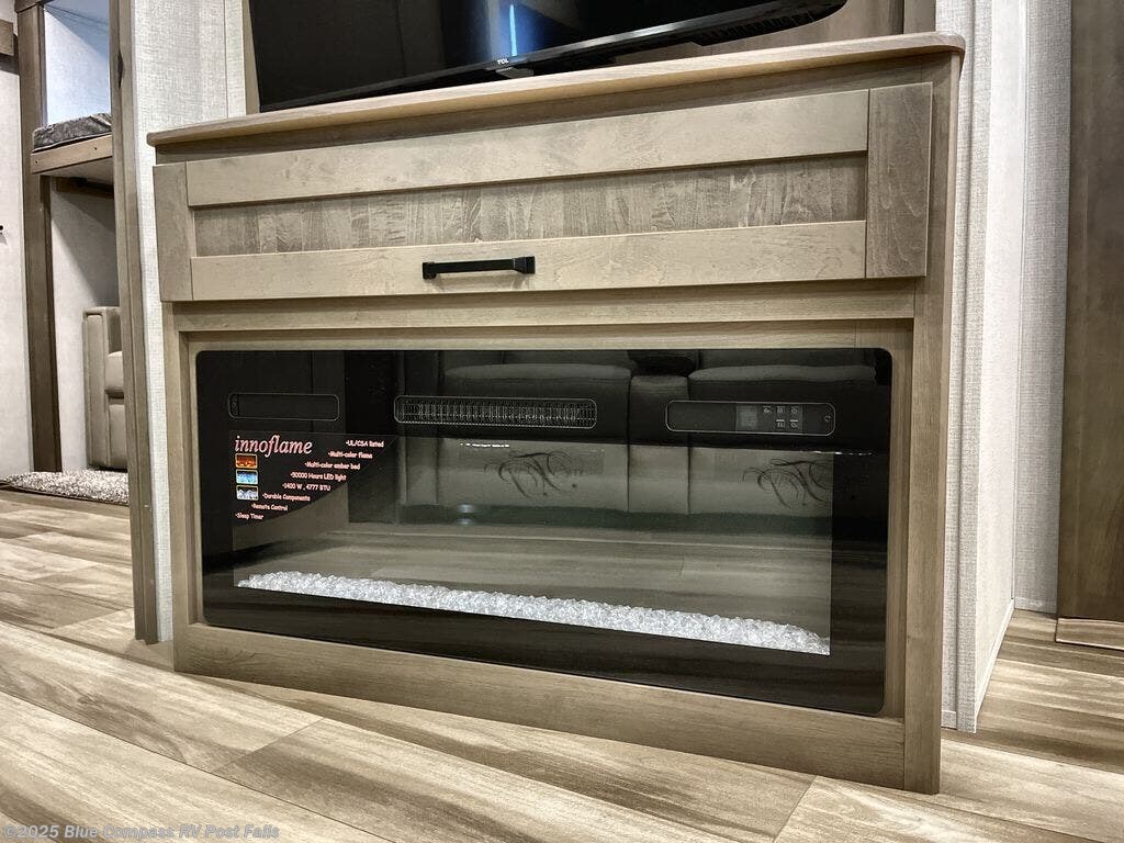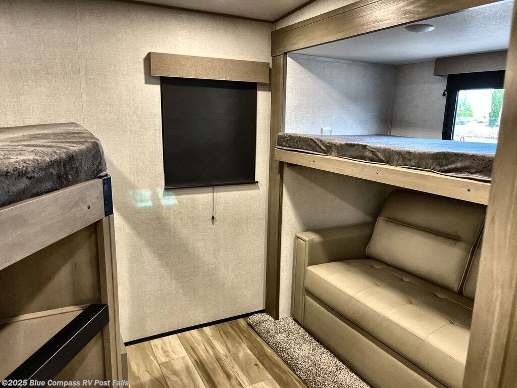 Are you looking to travel with your family and friends and want enough space for everyone to be comfortable? Step inside using the Step Above wit lift assist entry steps, to find a private bunkhouse in the rear of this fifth wheel which offers a slide out flip bunk above a tri-fold sofa, a 44" bunk bed with window and storage below, plus its very own private half bathroom. The theater seating or tri-fold sofa option is a great place to unwind at night in front of the entertainment center with a 40" LED HDTV and fireplace below it. There is a booth dinette or you can a swivel dinette option to dine at, and the kitchen island will provide more counter space to prep meals. You will find full amenities including a 16 cu. ft. 12V refrigerator and a hutch. This fifth wheel also includes a double entry bathroom with a radius shower, and you can wake up refreshed each morning after sleeping on your own queen bed.