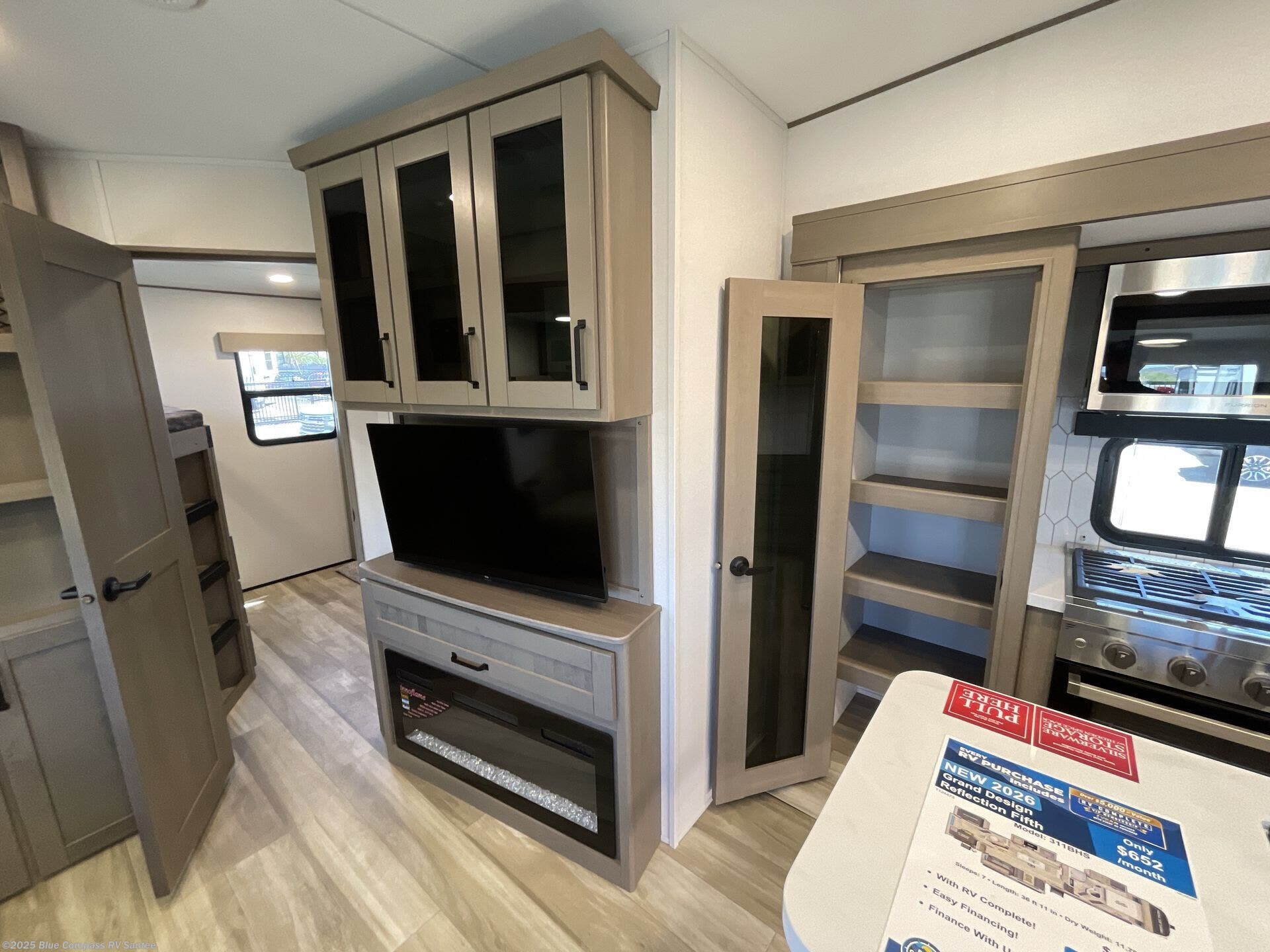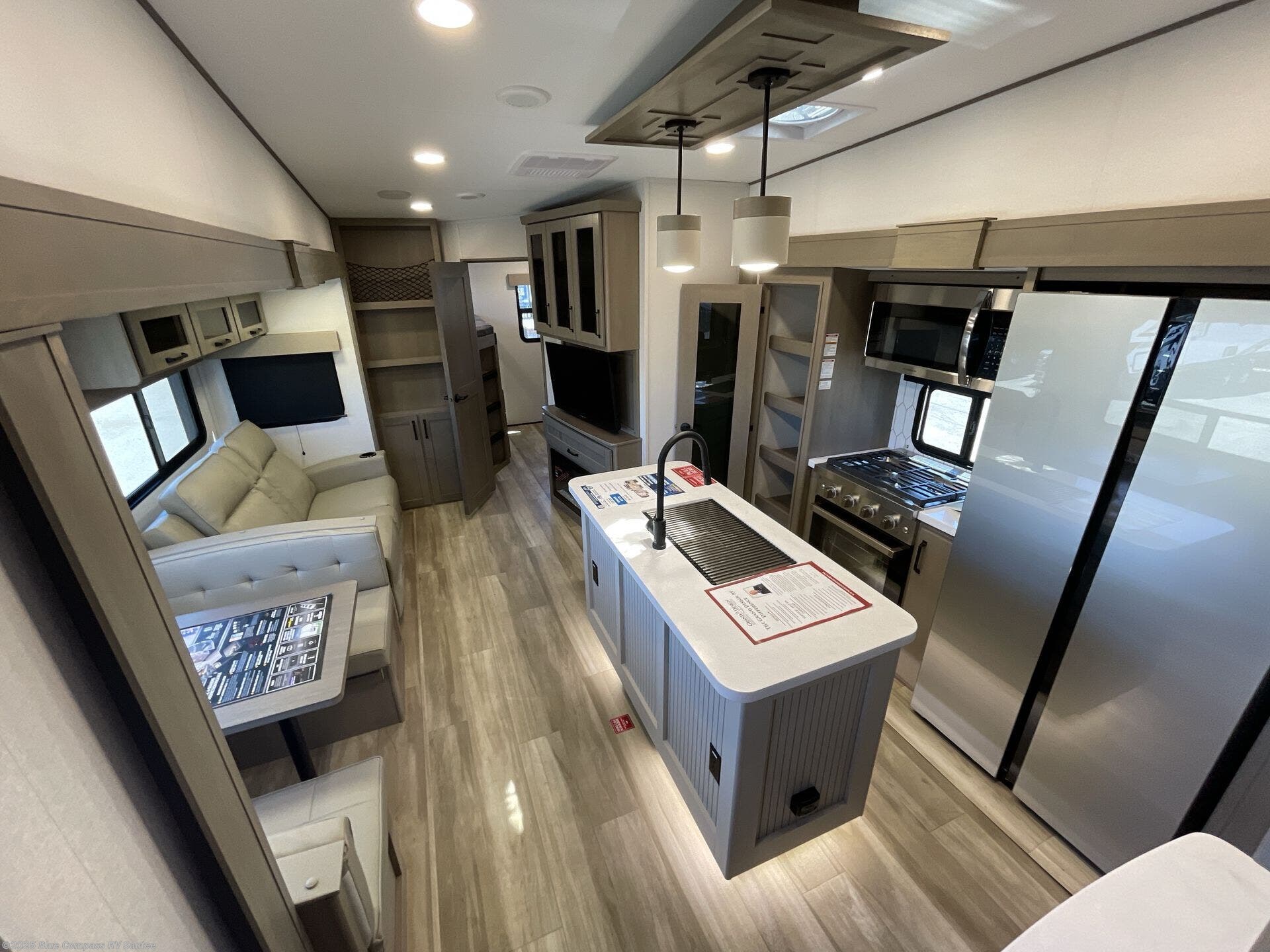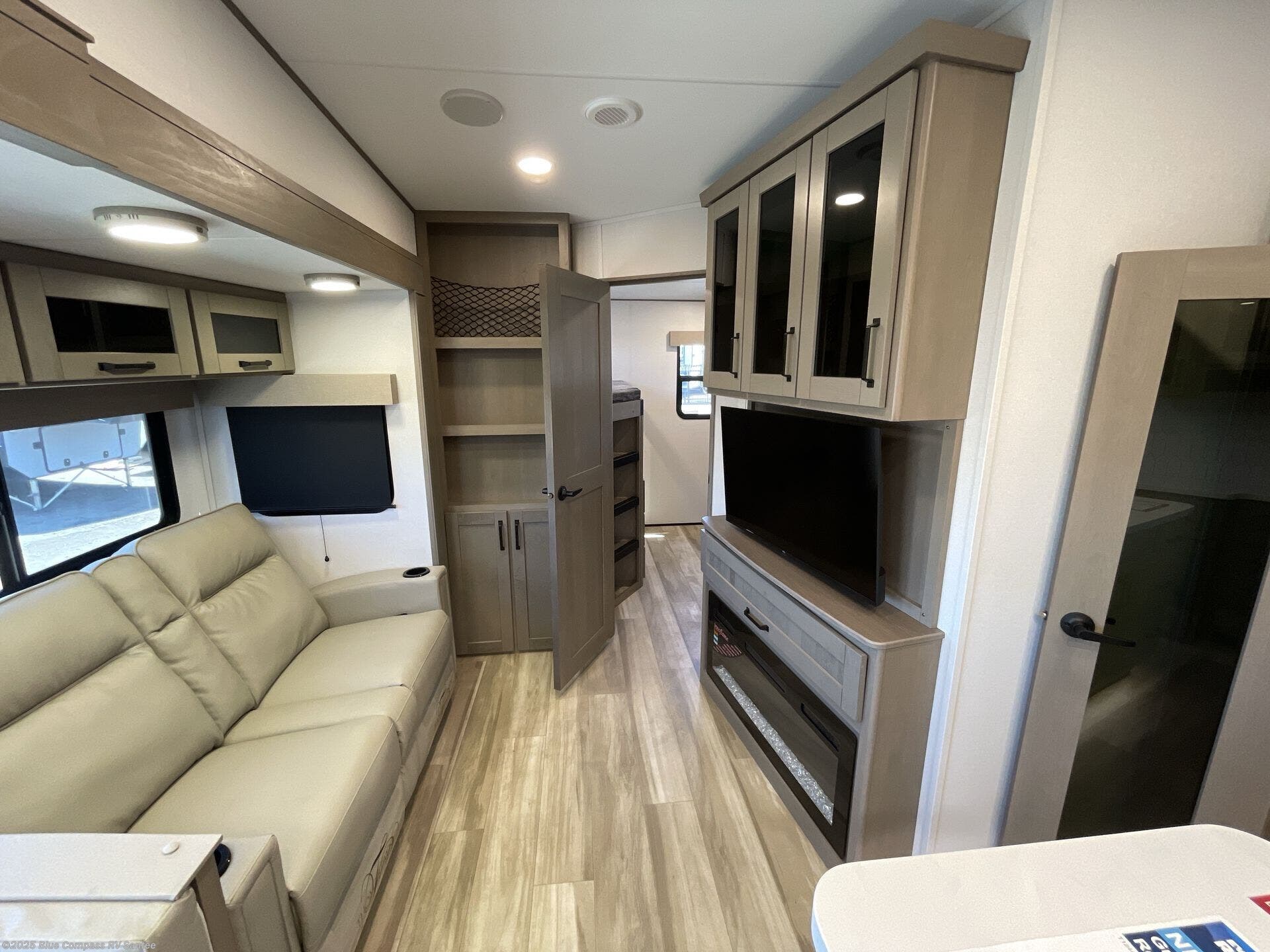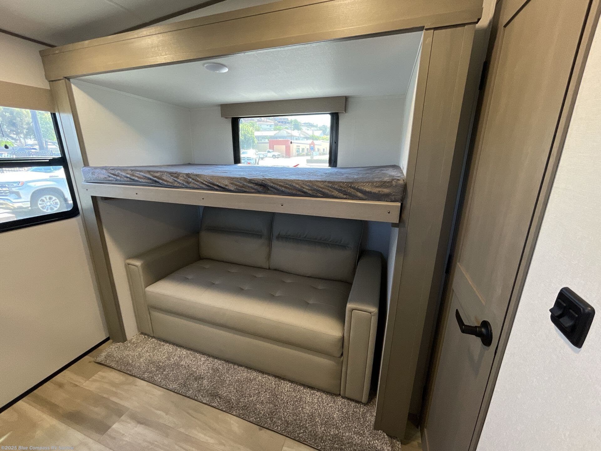 Are you looking to travel with your family and friends and want enough space for everyone to be comfortable? Step inside using the Step Above wit lift assist entry steps, to find a private bunkhouse in the rear of this fifth wheel which offers a slide out flip bunk above a tri-fold sofa, a 44" bunk bed with window and storage below, plus its very own private half bathroom. The theater seating or tri-fold sofa option is a great place to unwind at night in front of the entertainment center with a 40" LED HDTV and fireplace below it. There is a booth dinette or you can a swivel dinette option to dine at, and the kitchen island will provide more counter space to prep meals. You will find full amenities including a 16 cu. ft. 12V refrigerator and a hutch. This fifth wheel also includes a double entry bathroom with a radius shower, and you can wake up refreshed each morning after sleeping on your own queen bed.