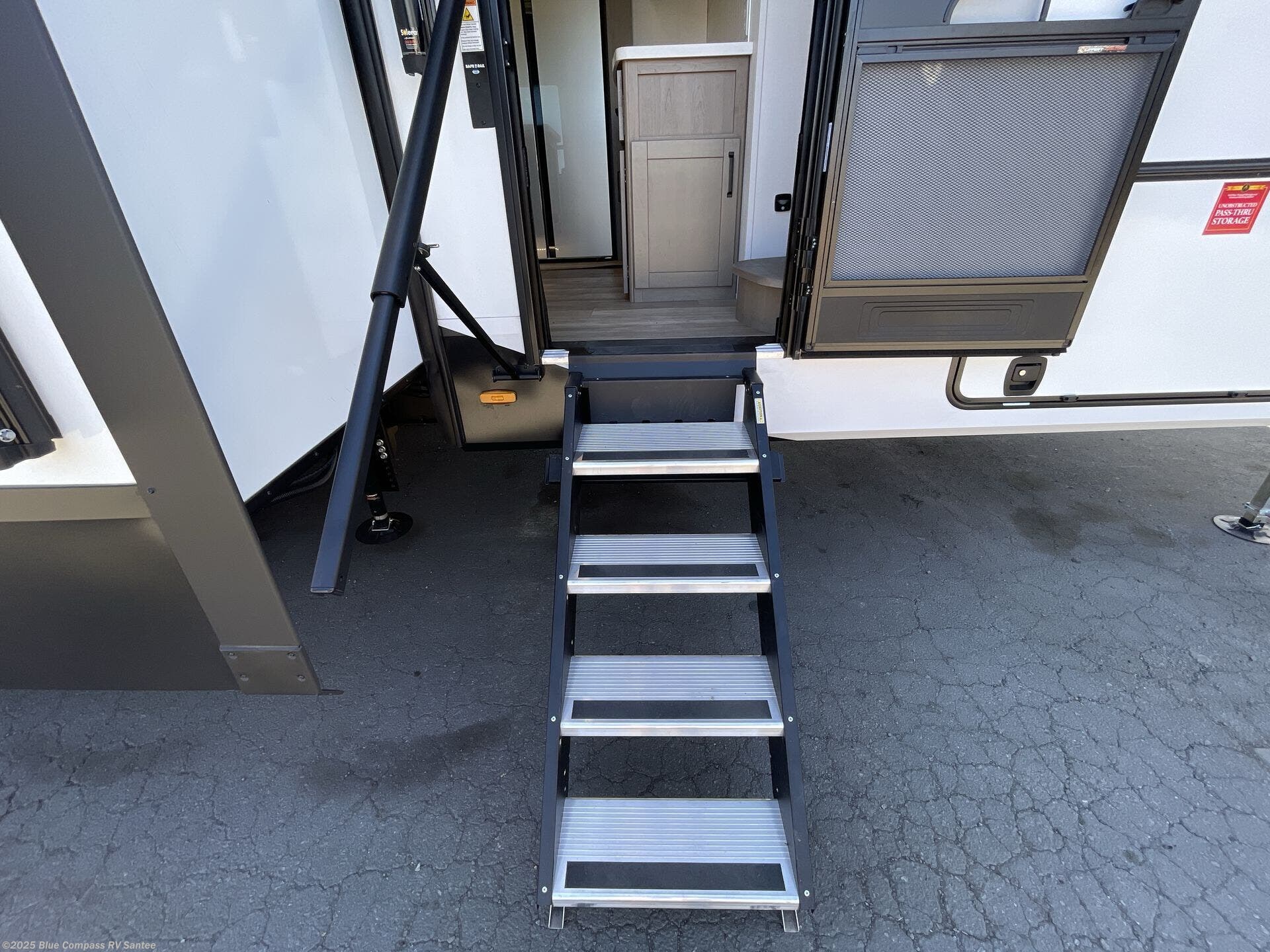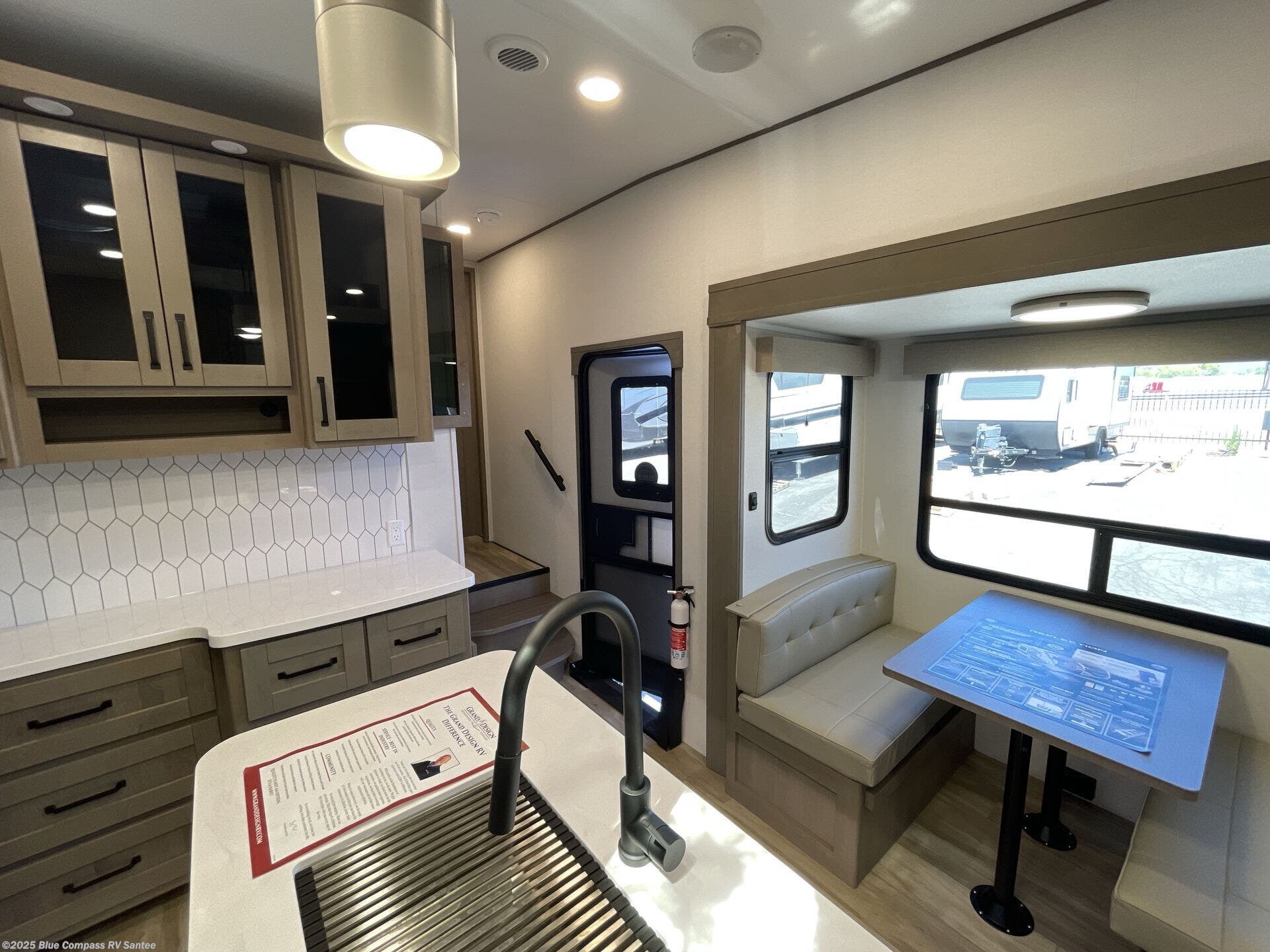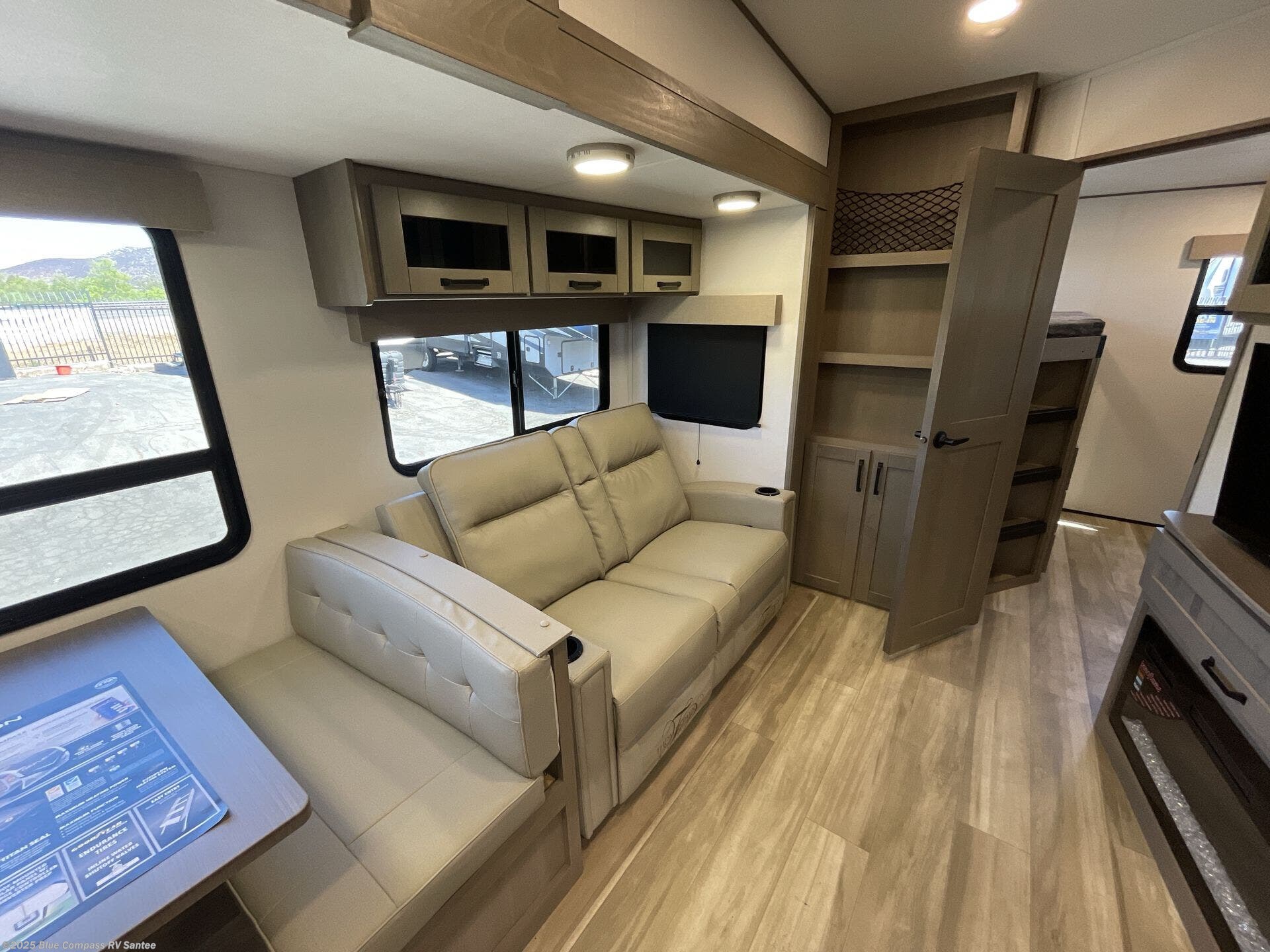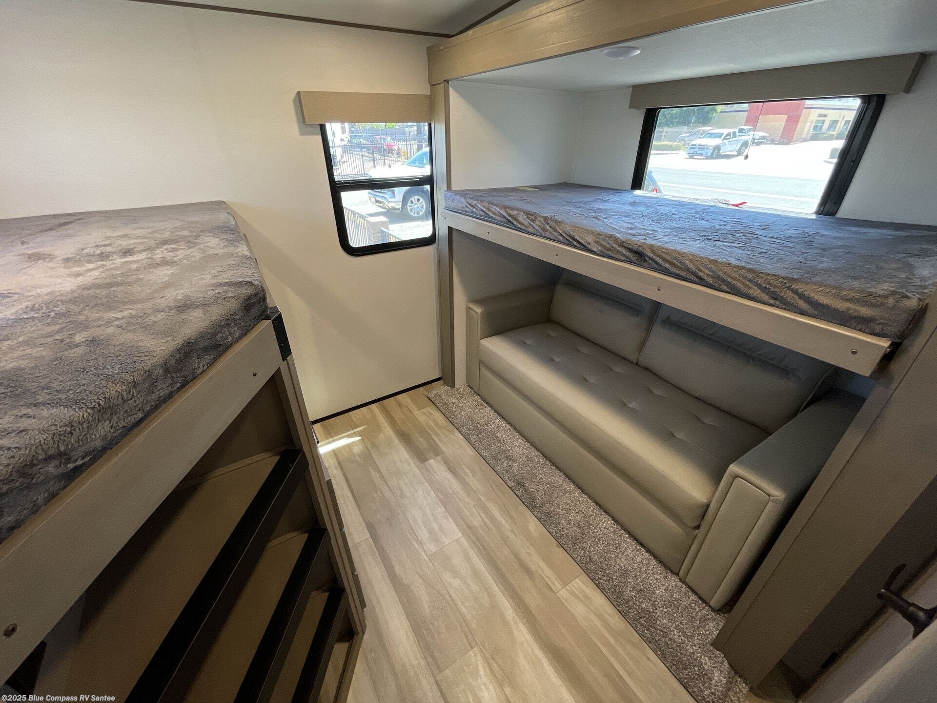 Are you looking to travel with your family and friends and want enough space for everyone to be comfortable? Step inside using the Step Above wit lift assist entry steps, to find a private bunkhouse in the rear of this fifth wheel which offers a slide out flip bunk above a tri-fold sofa, a 44" bunk bed with window and storage below, plus its very own private half bathroom. The theater seating or tri-fold sofa option is a great place to unwind at night in front of the entertainment center with a 40" LED HDTV and fireplace below it. There is a booth dinette or you can a swivel dinette option to dine at, and the kitchen island will provide more counter space to prep meals. You will find full amenities including a 16 cu. ft. 12V refrigerator and a hutch. This fifth wheel also includes a double entry bathroom with a radius shower, and you can wake up refreshed each morning after sleeping on your own queen bed.