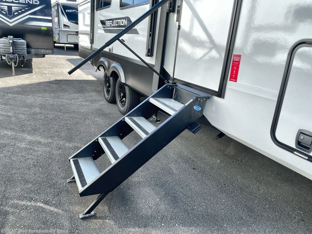 With any Reflection fifth wheel by Grand Design, you will have a solar panel for off-grid camping and a 60 amp charge controller and inverter prep, a Universal All-In-One docking station, unobstructed pass-through storage, and Goodyear Endurance tires. Each is constructed of gel coat exterior sidewalls, residential 5" truss rafters, walk-on roof decking, a fiberglass and radiant foil roof and front cap insulation plus laminated aluminum framed side walls, roof and end walls in slide rooms. Head inside to enjoy residential hardwood cabinet doors, premium Congoleum flooring, a spacious shower with a glass door, and many more comforts!
